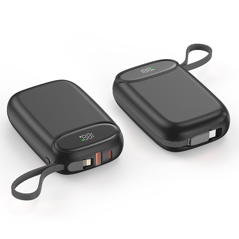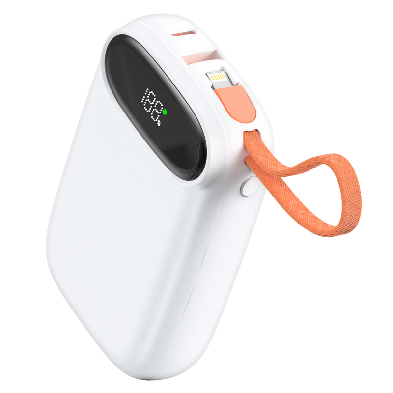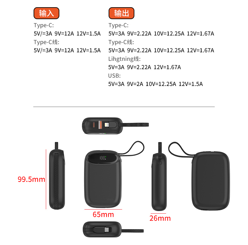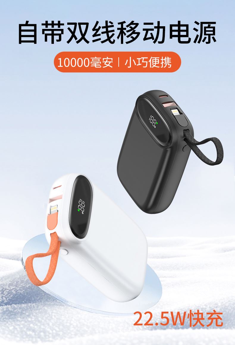 22.5W超级快充自带线10000毫安移动电源 容量:10000mAh 材质:ABS 接口:Type-C/USB 输入:Type-C输入: 5V/3A, 9V/2A, 12V/1.5A Type-C线输入:5V/3A, 9V/2A, 12V/1.5A 输出: Type-C: 5V/3A,9V/2.22A,10V/2.25A,12V/1.67A USB 输出 : 5V/3A,9V/2A, 10V/2.25A.12V/1.5A Type-C线输出: 5V/3A,9V/2.22A,10V/2.25A.12V/1.67A Lihgtning 线输出: 5V/3A,9V/2.22A, 12V/1.67A 电芯:聚合物,115570/5000mAh*2 3.7V 表面工艺:底面素材 镜片亮UV 尺寸:101x65x26mm 颜色:白色、黑色