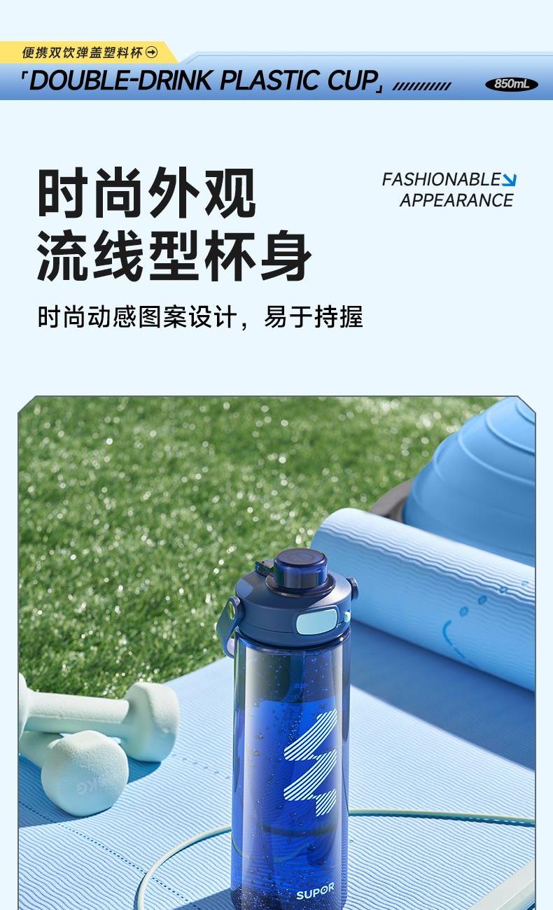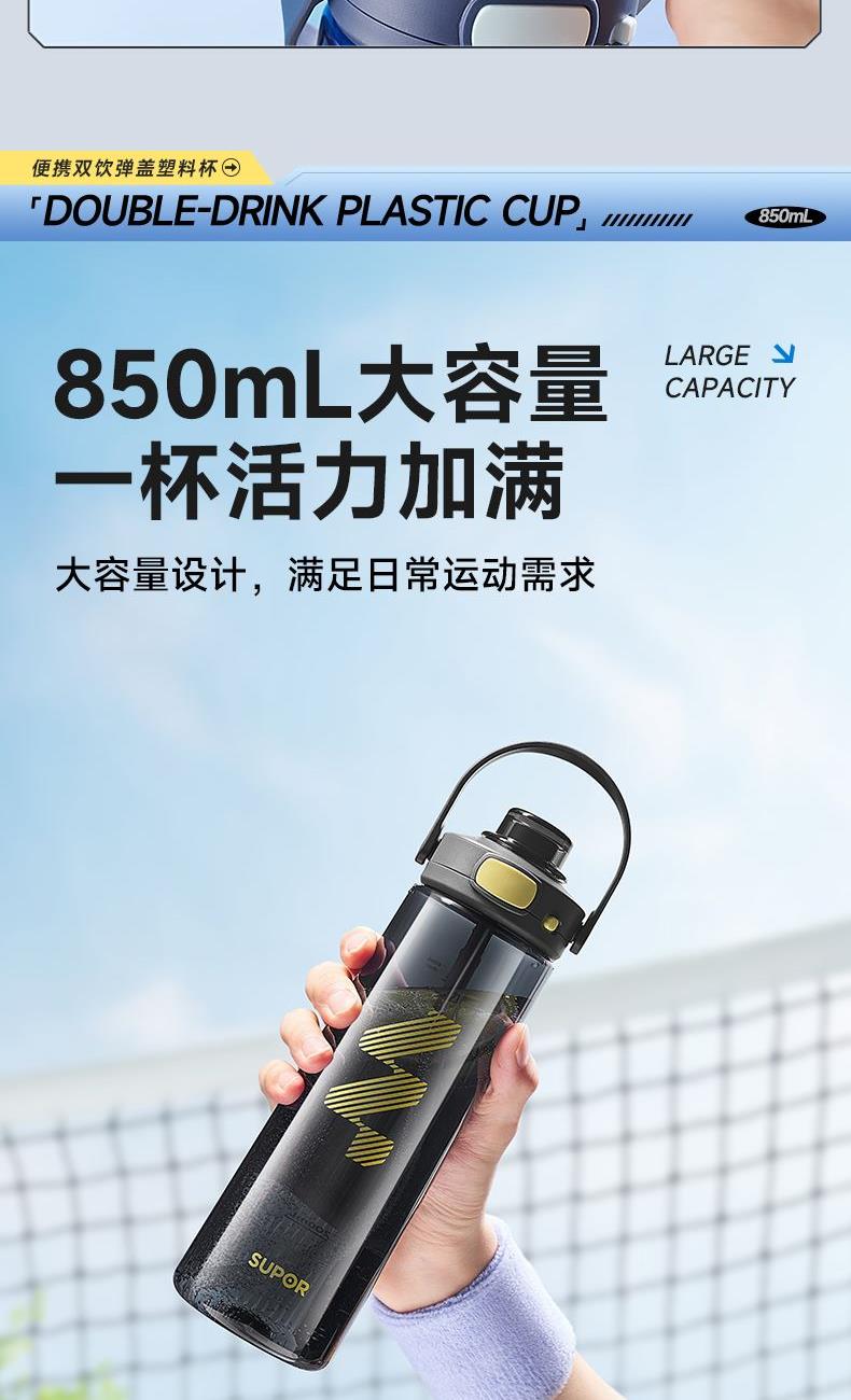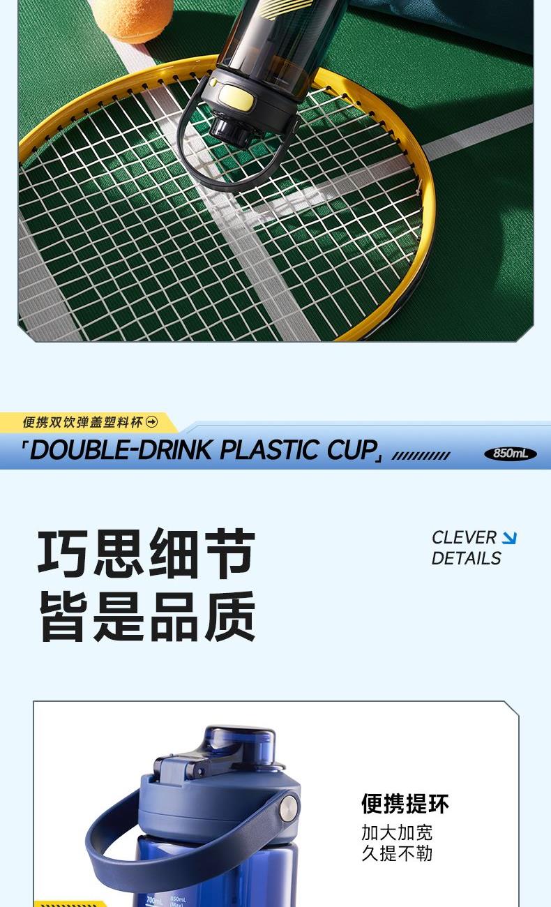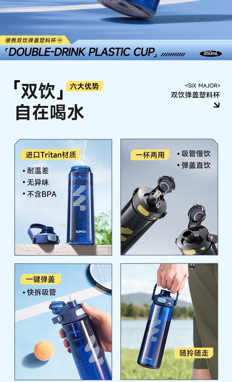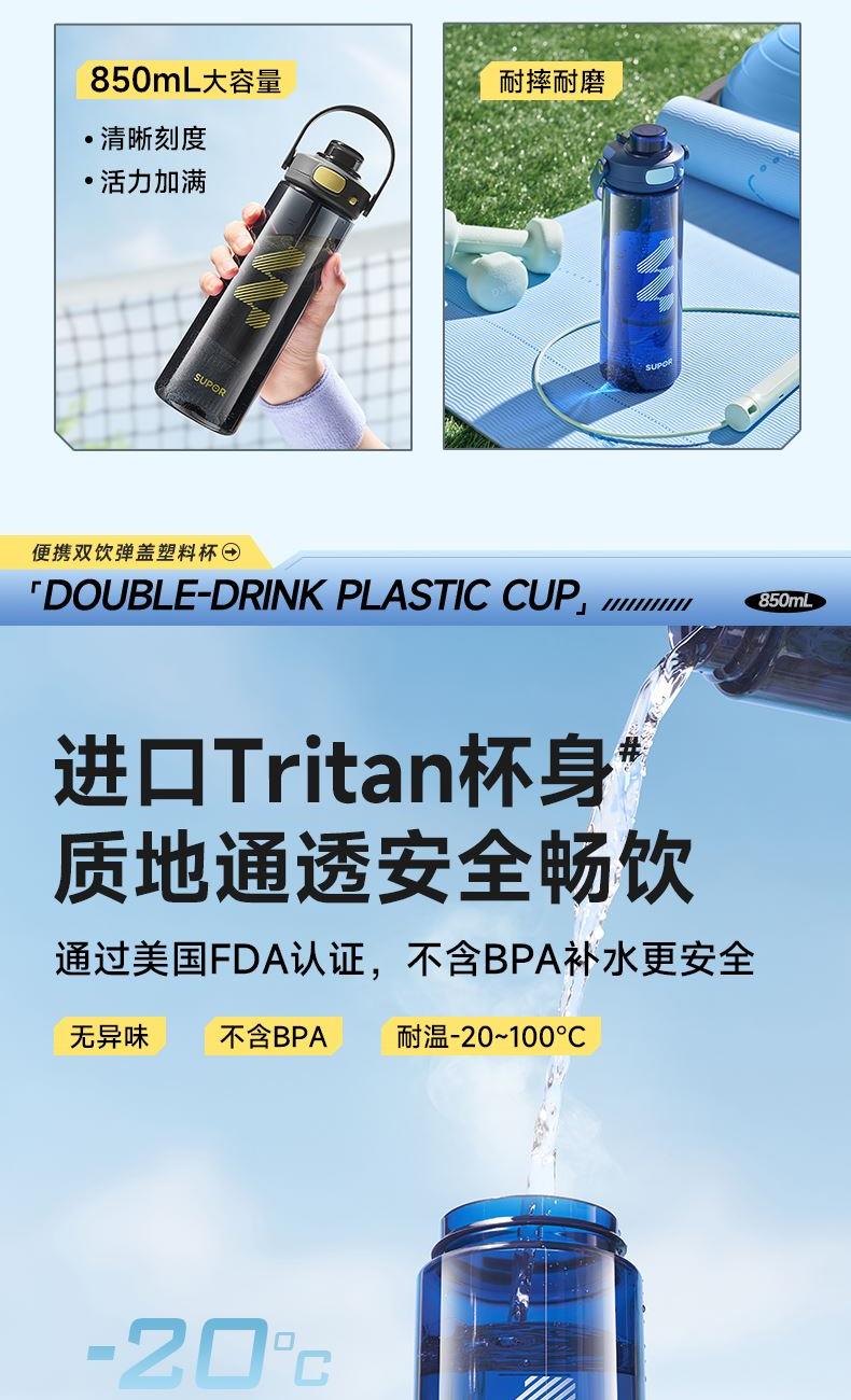 容量:850ml 579*526*276mm 11.7KGS 材质:Tritan 卖点: 1.一键弹开+快拆吸管 2.喝水不仰头 吸管直饮双模式随心切换 3.Tritan材质 不含BPA 耐热-20~100℃ 4.850mL大容量:满足日常运动需求