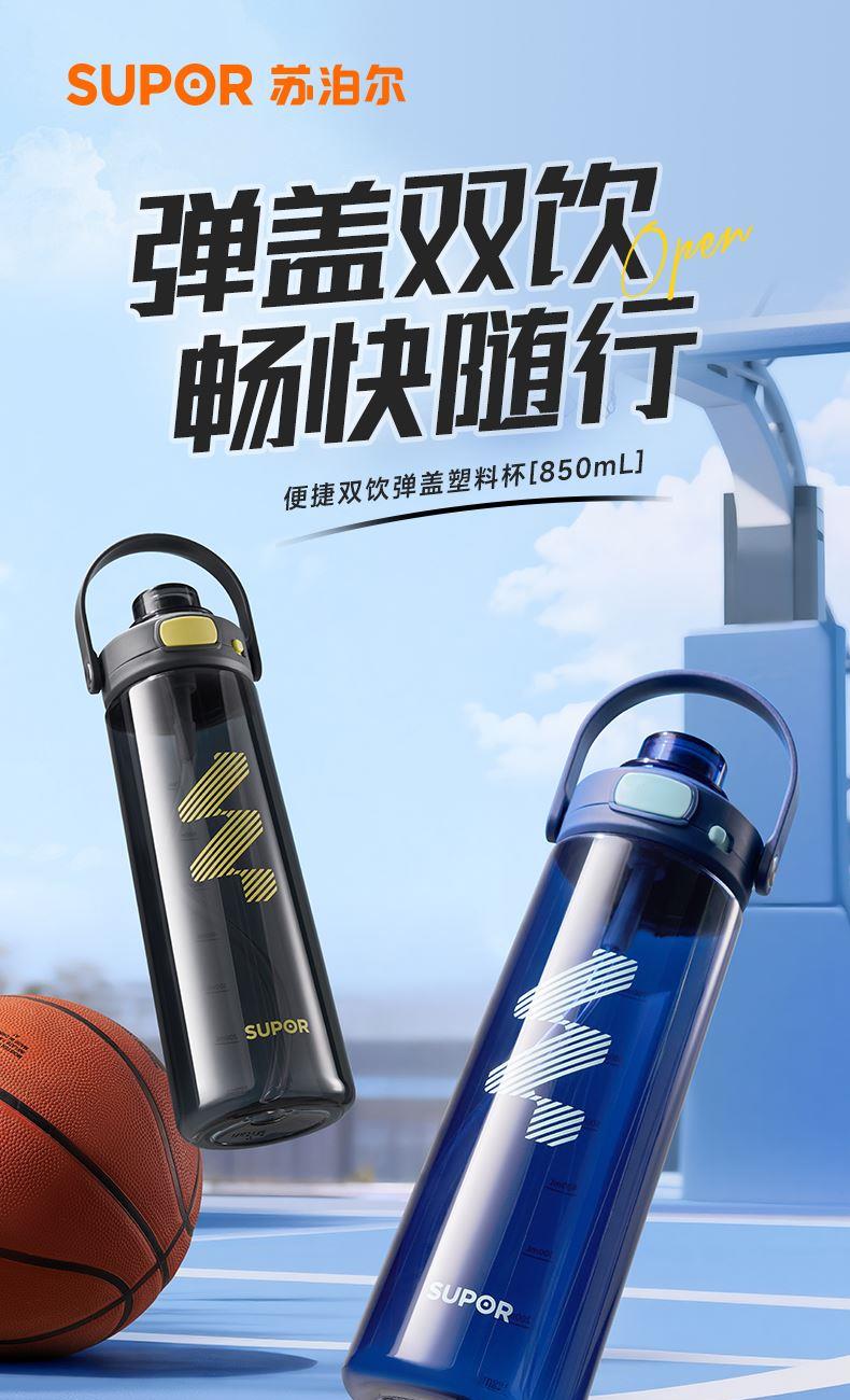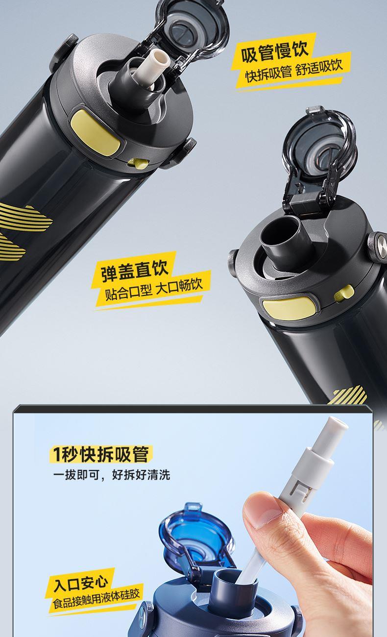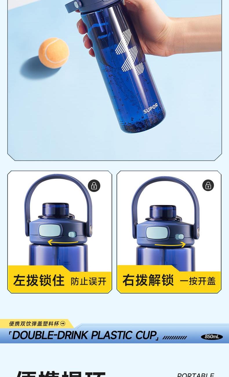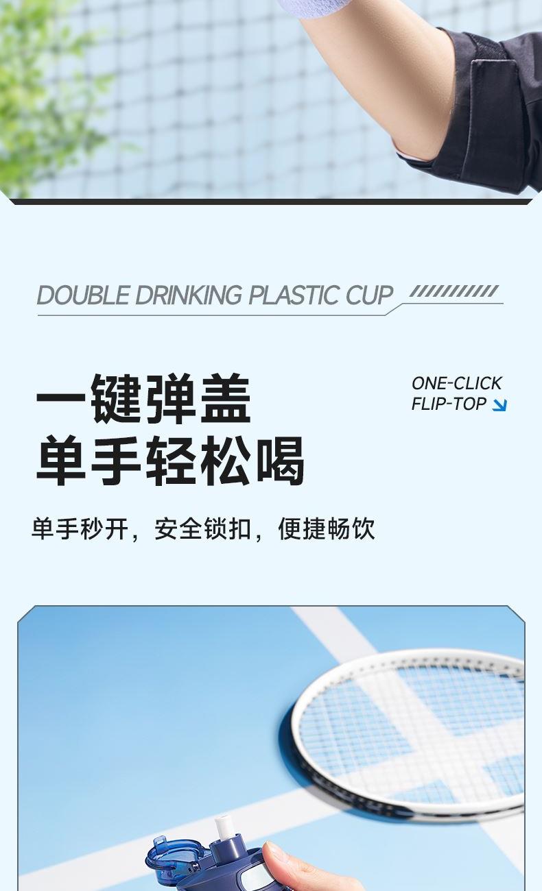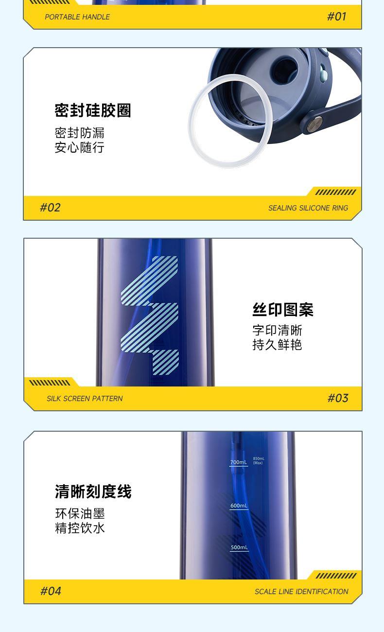 容量:850ml 579*526*276mm 11.7KGS 材质:Tritan 卖点: 1.一键弹开+快拆吸管 2.喝水不仰头 吸管直饮双模式随心切换 3.Tritan材质 不含BPA 耐热-20~100℃ 4.850mL大容量:满足日常运动需求