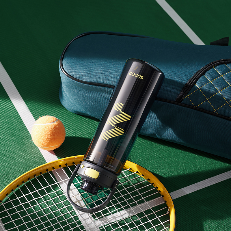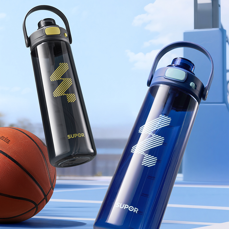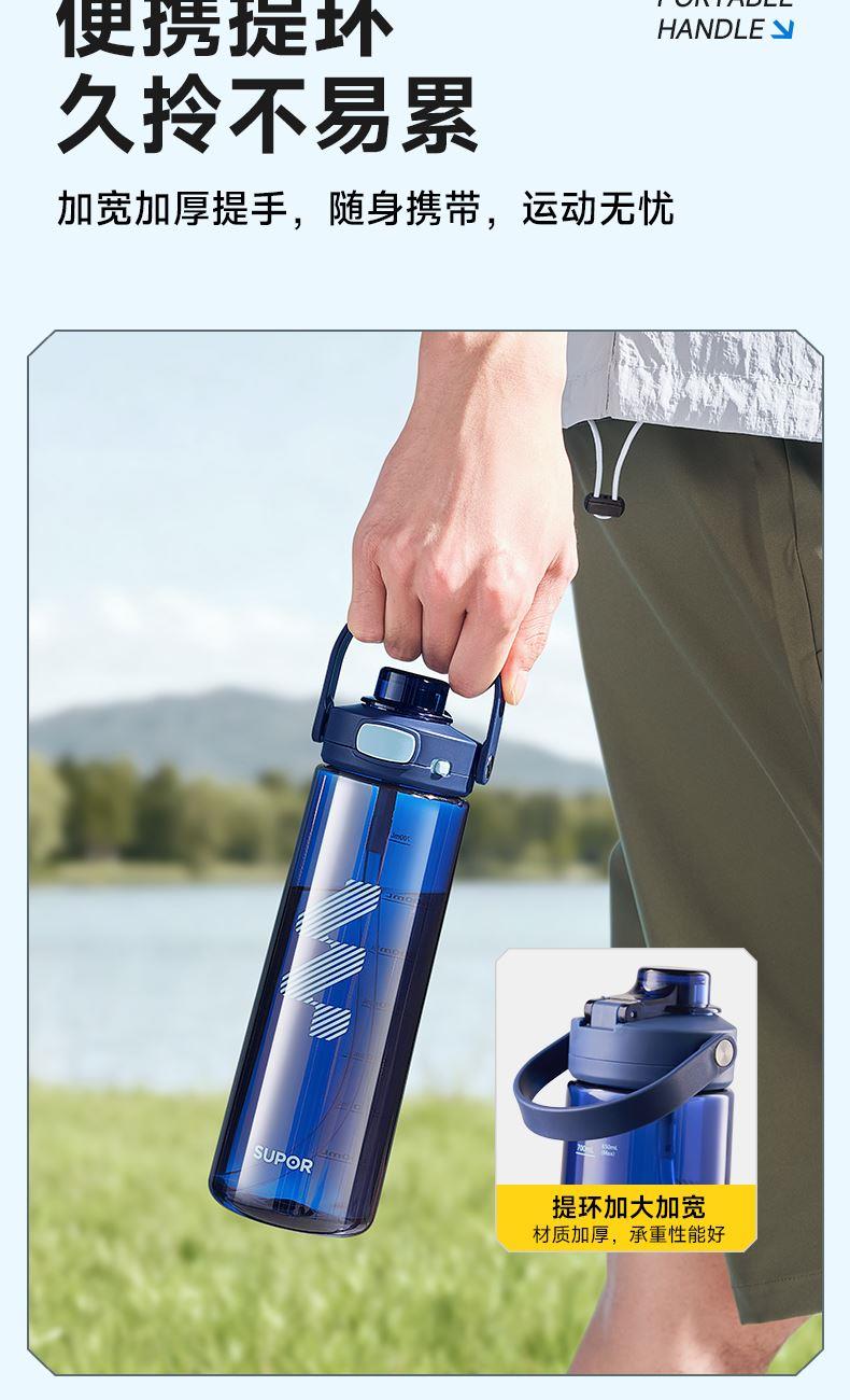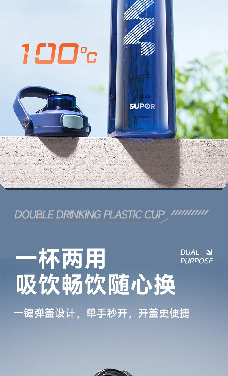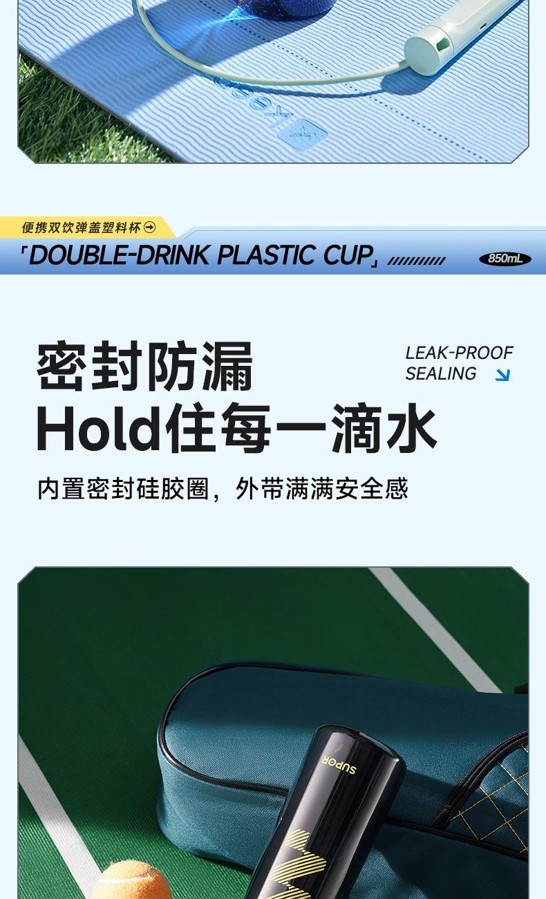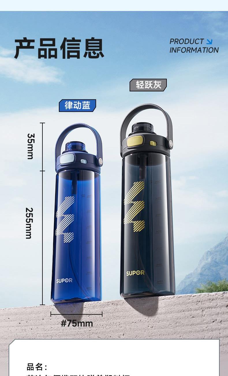容量:850ml 579*526*276mm 11.7KGS 材质:Tritan 卖点: 1.一键弹开+快拆吸管 2.喝水不仰头 吸管直饮双模式随心切换 3.Tritan材质 不含BPA 耐热-20~100℃ 4.850mL大容量:满足日常运动需求