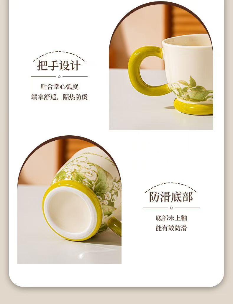 清新铃兰手绘:奶白瓷底搭配清新铃兰纹样,绿釉点缀,像把春日林间的铃兰摘进了杯壶里,温柔又温馨。