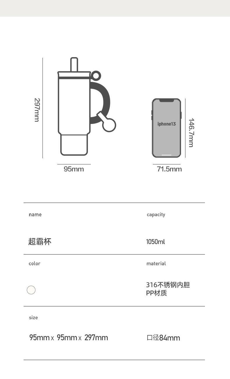 容量:1050ml | 净重:586g | 口径:84mm 材质:(内胆)316不锈钢+(外壳)304不锈钢 适配大多数车载水杯槽,1050ml满足日常饮水需求,告别频繁接水。