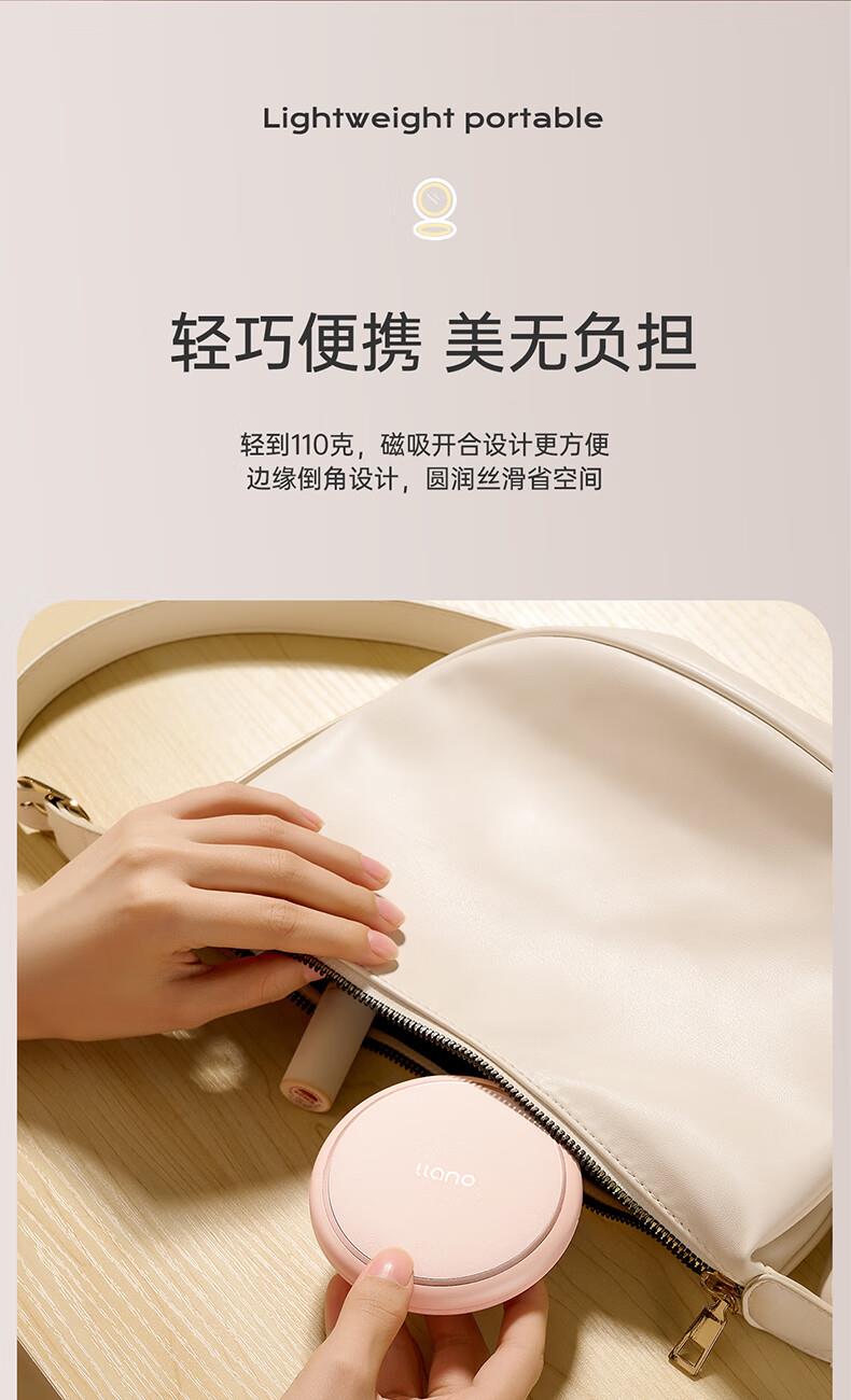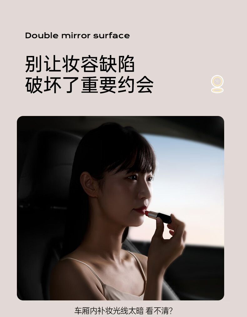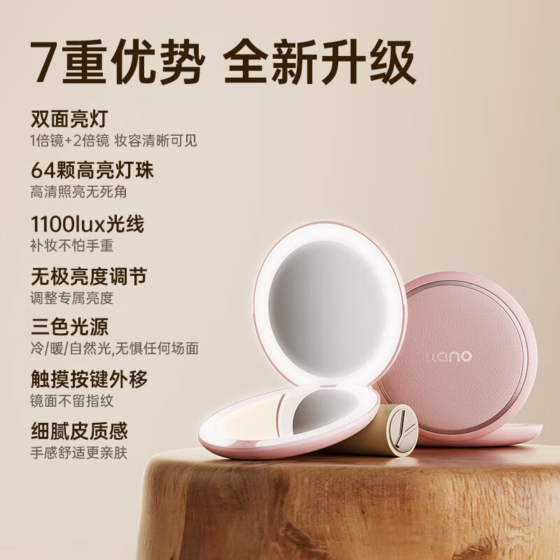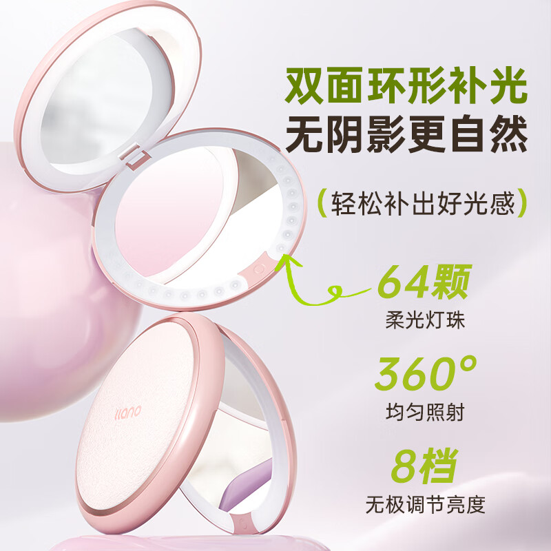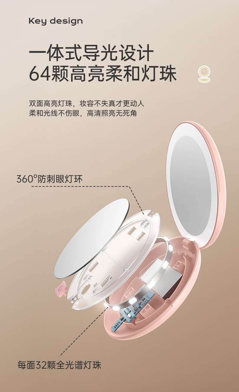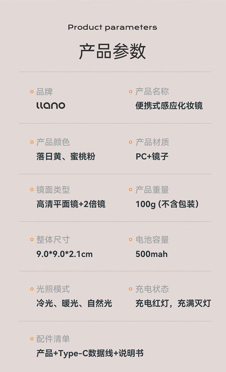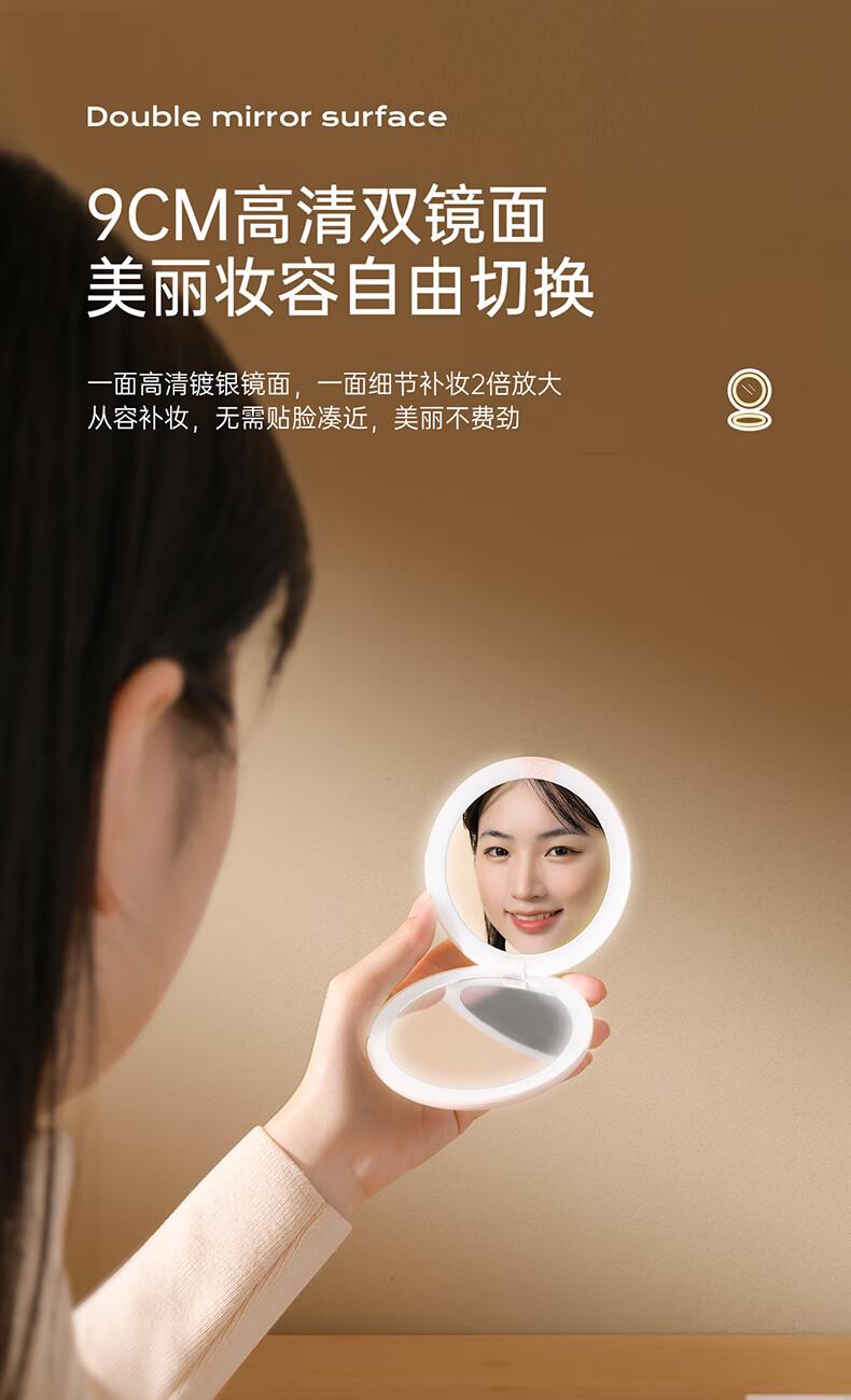 小巧便携,方便携带不占位置 配备2倍镜,外出补妆也不放过细节 双面亮灯,三色无极调光,环境灯关不足也能轻松补妆 植皮工艺,质感上乘 产品尺寸: 9*9*2.1cm 产品净重:110g 电池容量:500mah 额定功率:2.5W 产品材质:ABS+蛋白PU皮+高清铝镜