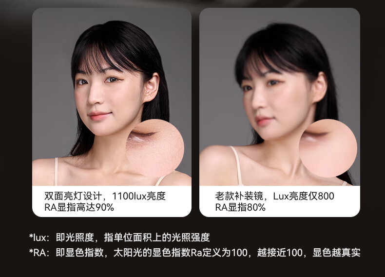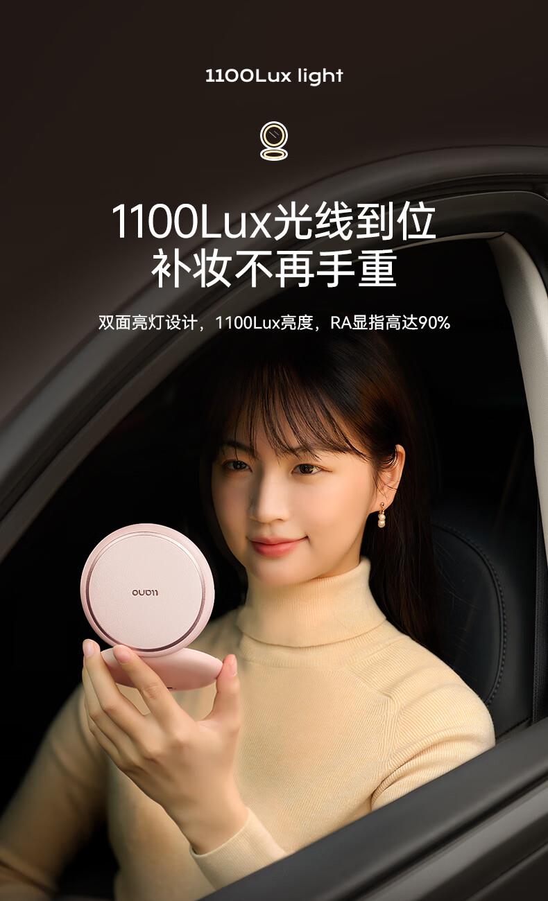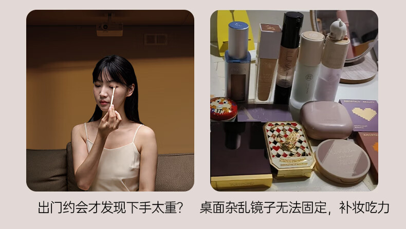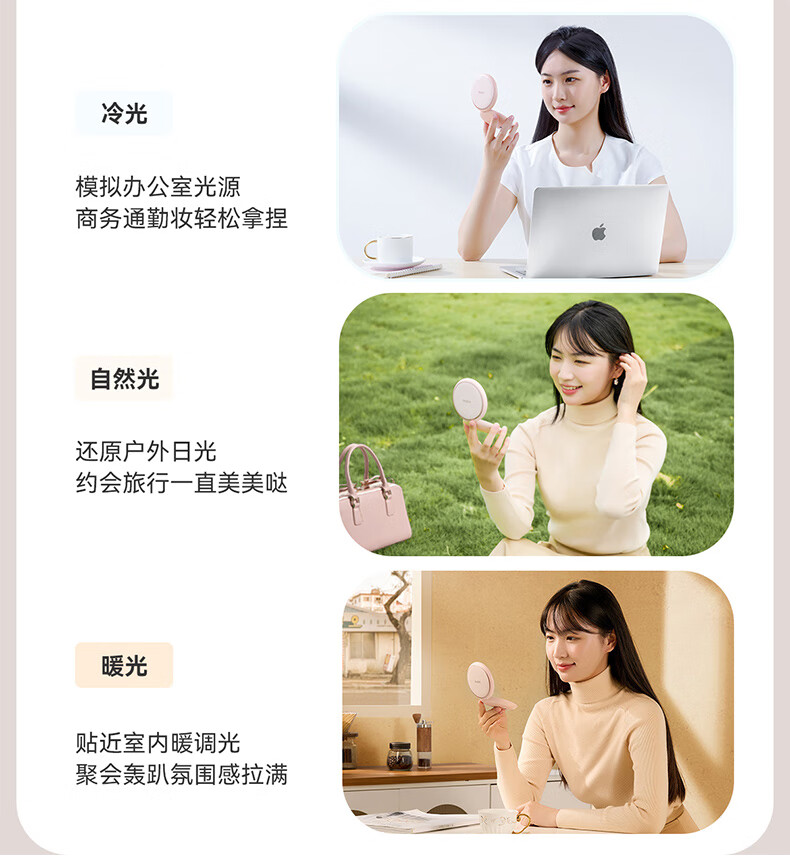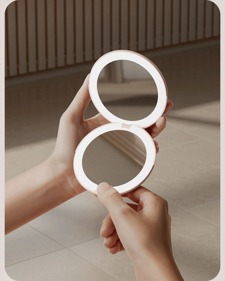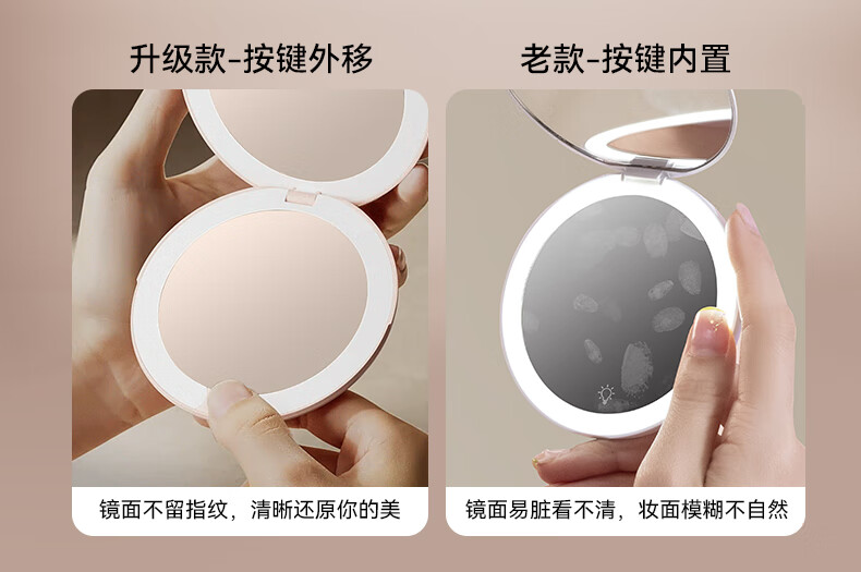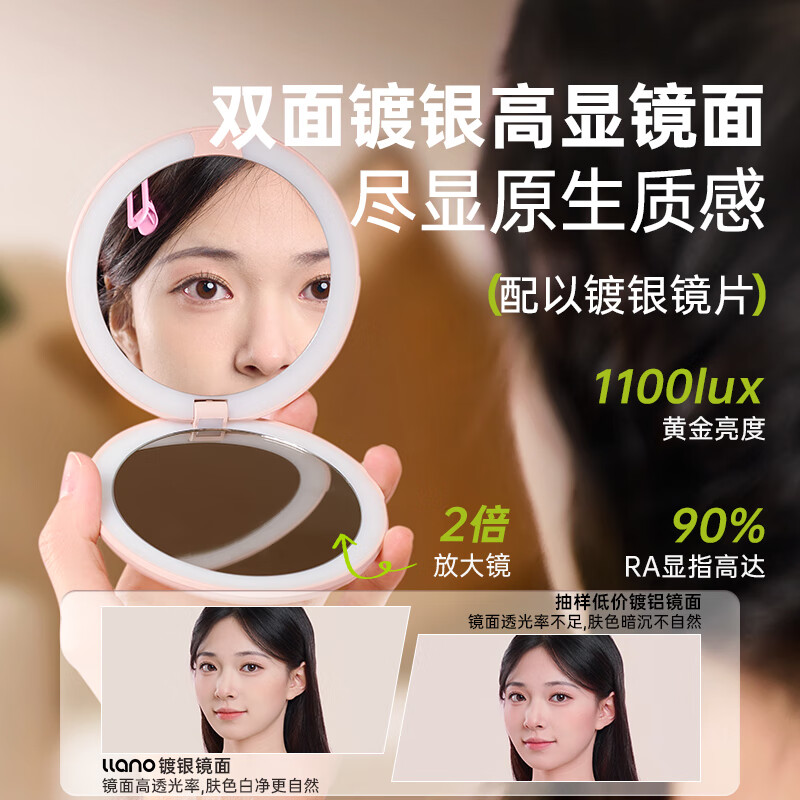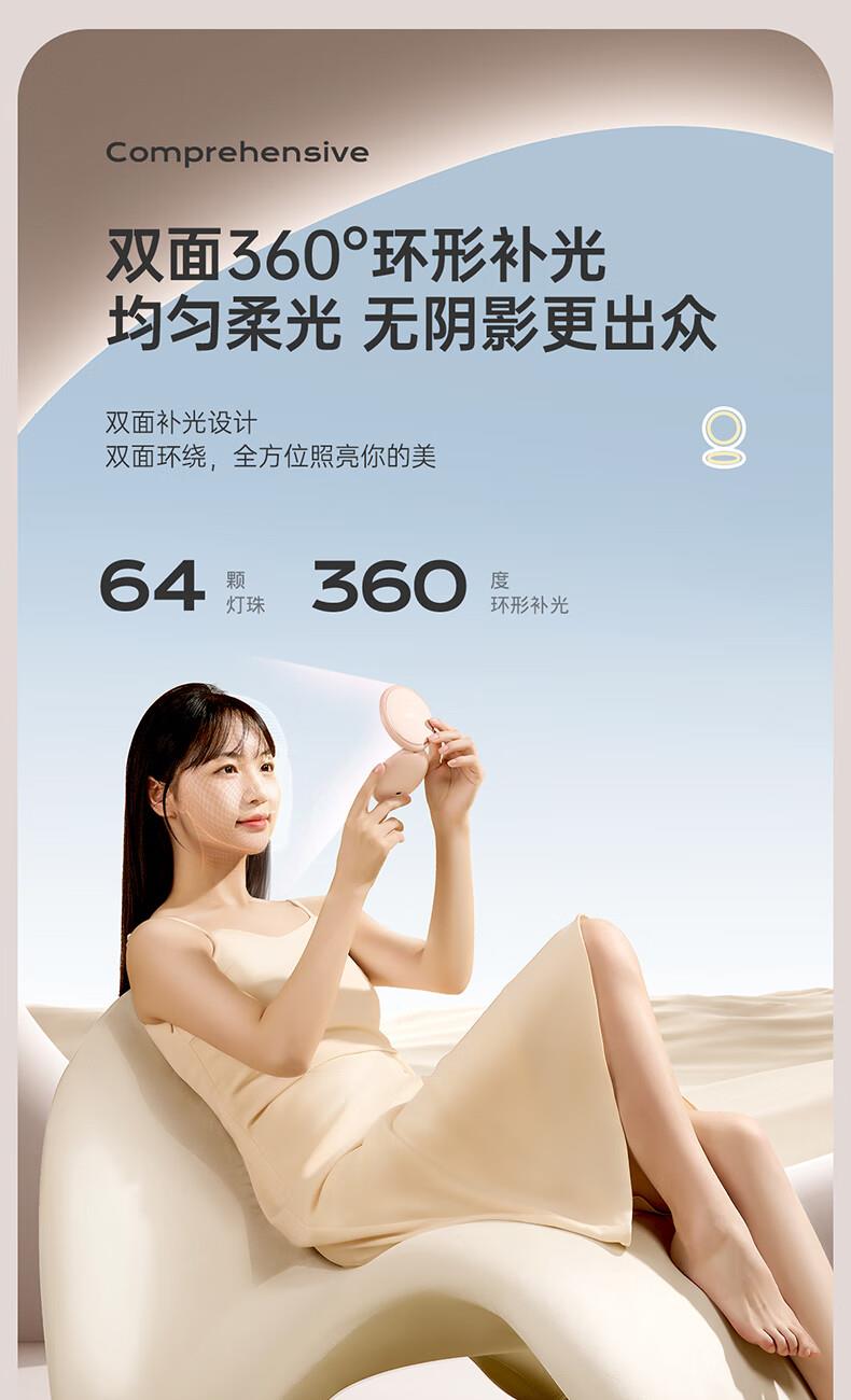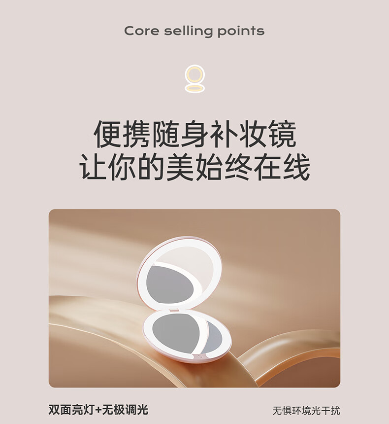 小巧便携,方便携带不占位置 配备2倍镜,外出补妆也不放过细节 双面亮灯,三色无极调光,环境灯关不足也能轻松补妆 植皮工艺,质感上乘 产品尺寸: 9*9*2.1cm 产品净重:110g 电池容量:500mah 额定功率:2.5W 产品材质:ABS+蛋白PU皮+高清铝镜