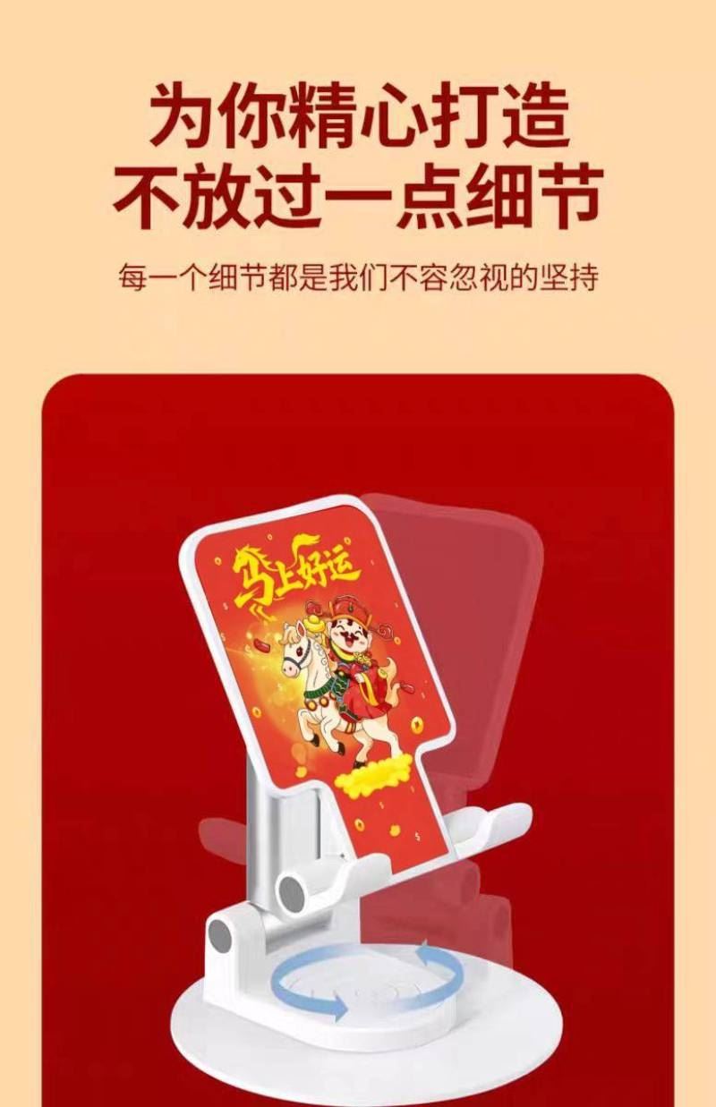 材质:PS+五金底座 颜色:白色 适用设备:手机/平板 包装尺寸:126*100*33mm 重量:195g • 财滚滚旋转折叠手机支架,手机平板都适用,可360度旋转、自由伸缩、折叠便携。 • 适用:家用/办公/直播/游戏/观影追剧等 • 可定制LOGO