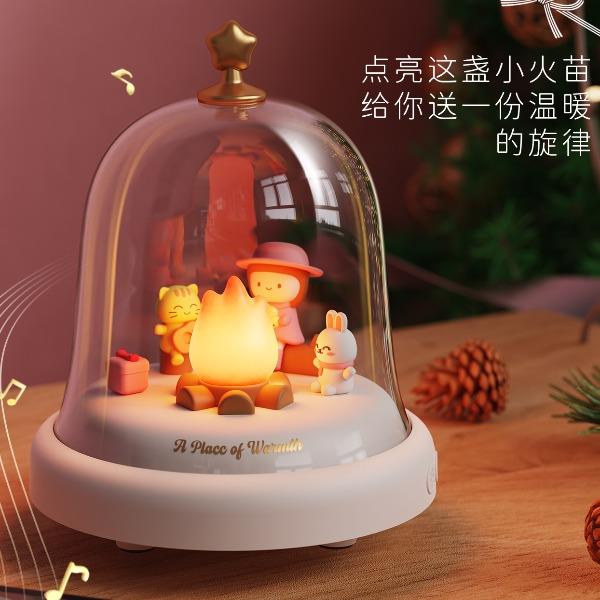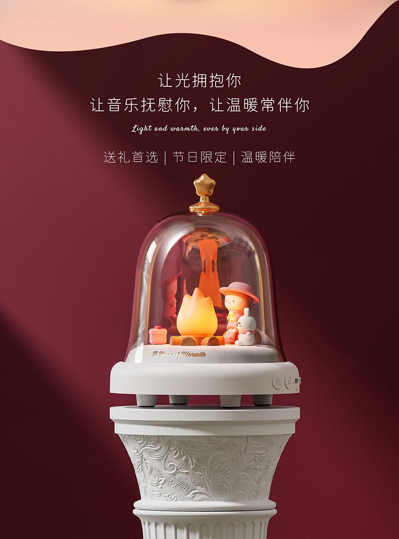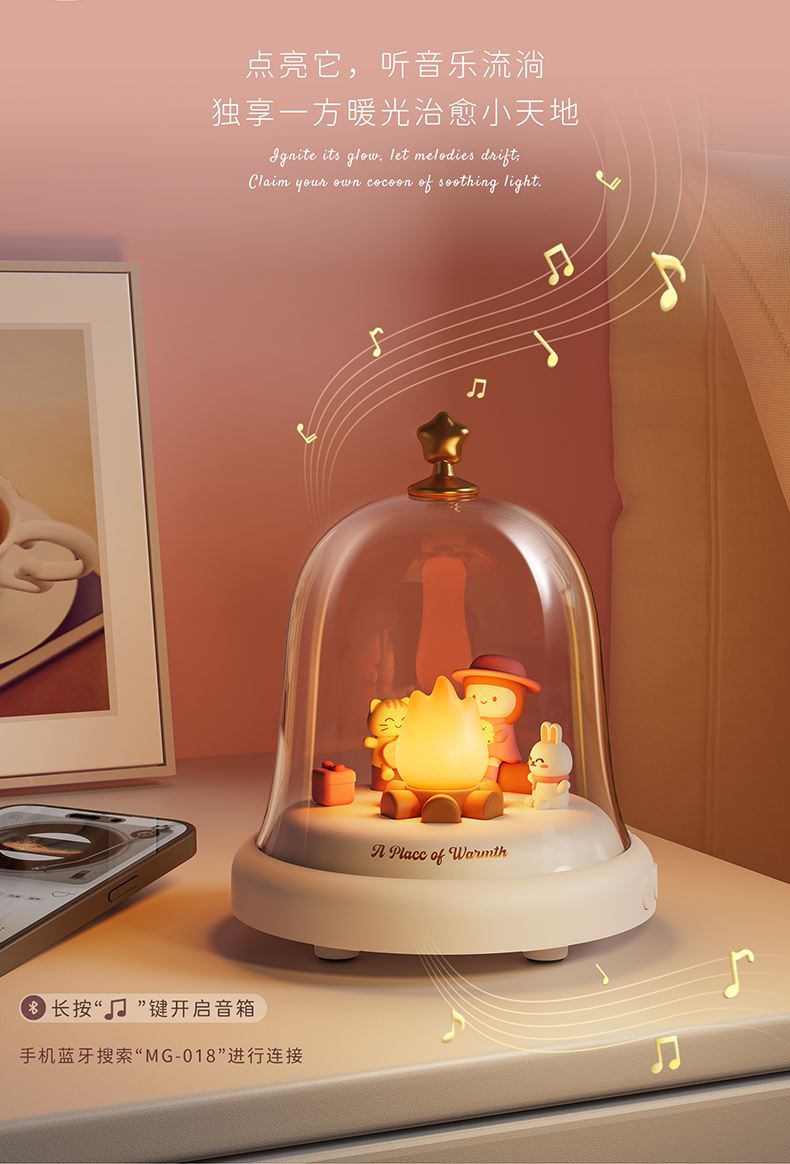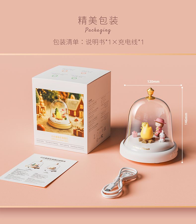 款式:蓝牙音箱款 八音盒款 材质:ABS+PC+PVC LED功率: 3*0.2W 输入电压:5V-1A 内置电池:蓝牙音箱1500MAH 八音盒 1200MAH 产品尺寸:120*120*146 包装尺寸:124*124*154 透明铃铛里跳动着温暖的小火苗 小女孩、小兔和小猫正围着光讲故事 像极了爱情里那些甜蜜的悄悄话 八音款 - 经典的旋律自动播放 蓝牙款 - 连接手机播放你们的专属BGM