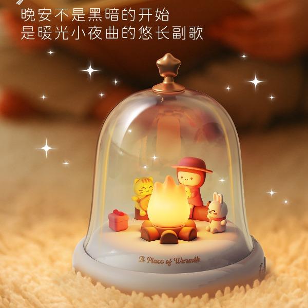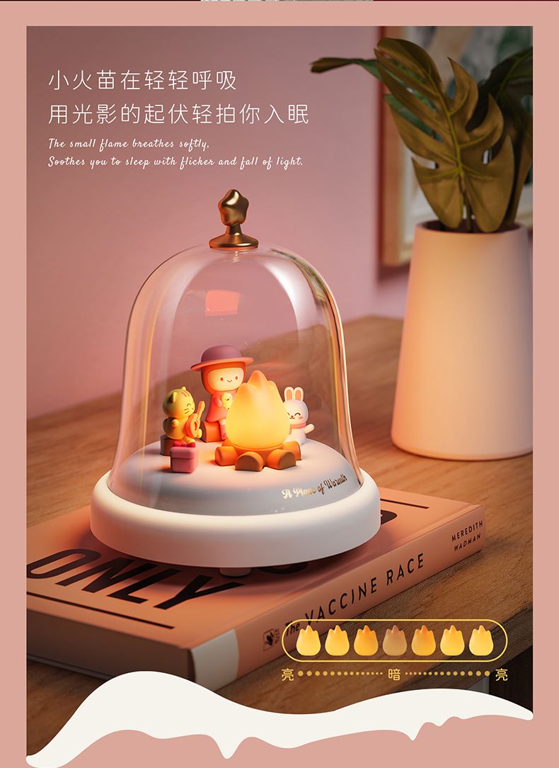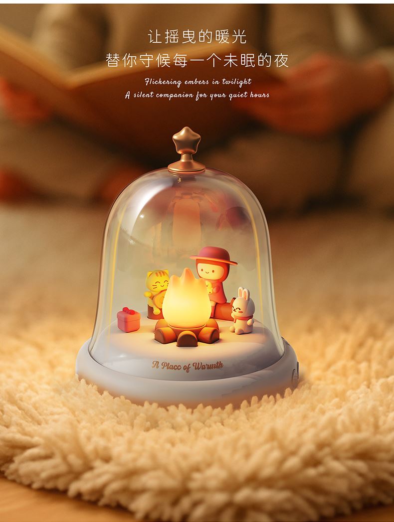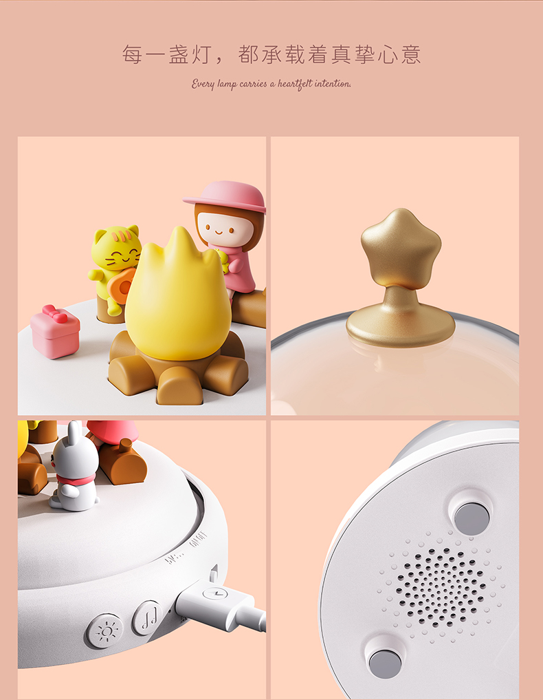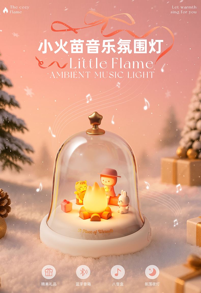 款式:蓝牙音箱款 八音盒款 材质:ABS+PC+PVC LED功率: 3*0.2W 输入电压:5V-1A 内置电池:蓝牙音箱1500MAH 八音盒 1200MAH 产品尺寸:120*120*146 包装尺寸:124*124*154 透明铃铛里跳动着温暖的小火苗 小女孩、小兔和小猫正围着光讲故事 像极了爱情里那些甜蜜的悄悄话 八音款 - 经典的旋律自动播放 蓝牙款 - 连接手机播放你们的专属BGM