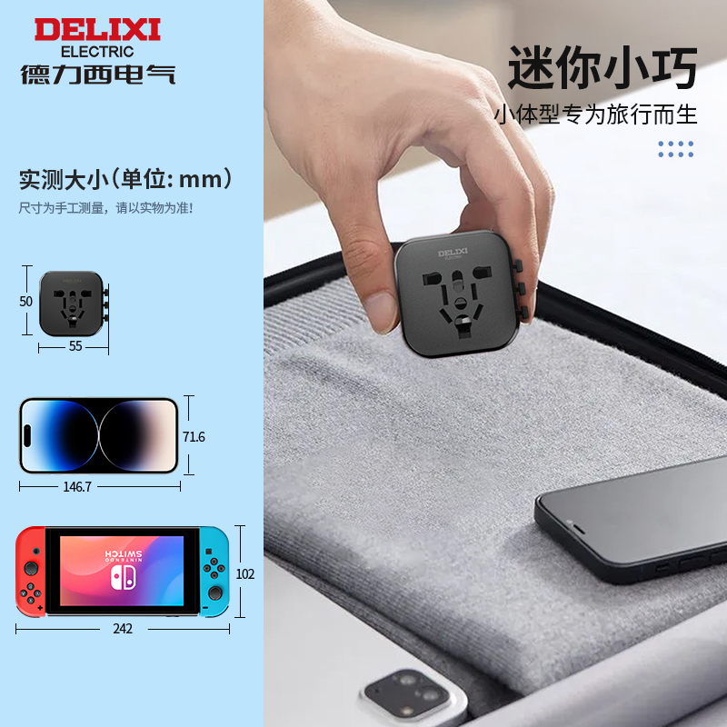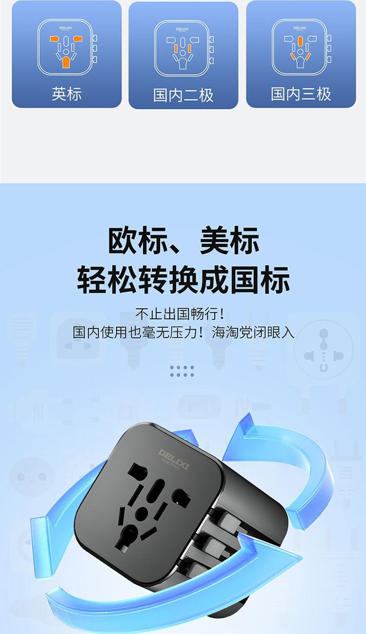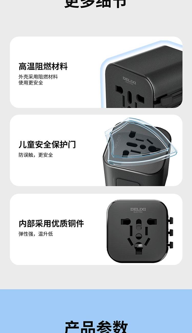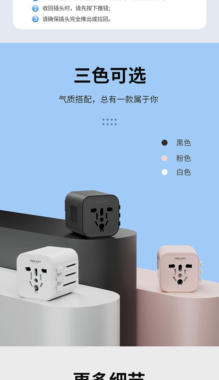 产品:德力西电气全球通旅行插座 基础款 白色 产品型号:CD98-SPQ(HE)Q (B) 产品颜色:白色 宽幅电压:100-240V适配 产品尺寸:55*50* 52mm 产品材质:PC+ABS 阻燃材料 电流:6A MAX 产品位数:欧标、英标、美标、澳标、一位二孔、一位三孔、无线