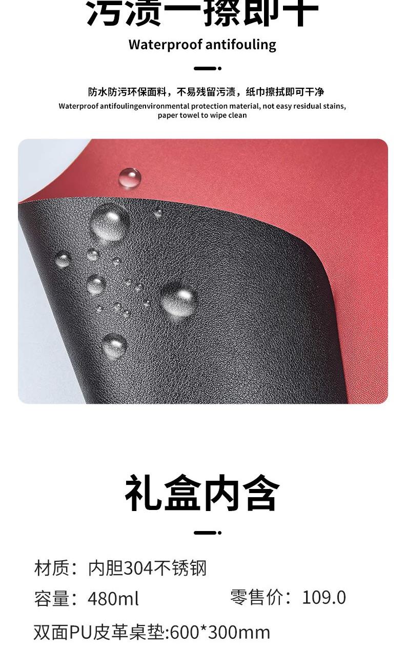 在忙碌与思绪交织的日常里,【暖坞】 是您的安心所在。天然皮革桌垫,以温润质感圈定您的专属领地,让伏案工作也变得优雅从容;保温杯,则静静守护着饮品的理想温度,为您补充能量,润泽身心。这不仅仅是一杯一垫,更是一种生活态度的宣告:真正的效率,源于对身心的周到照料。 愿您在【暖坞】的陪伴下,于纷繁中觅得一方属于自己的秩序与温暖。 PU皮革桌垫 尺寸:600*300mm 材质:双面PU皮 保温杯 材质:内304不锈钢,外201不锈钢 容量:480ml