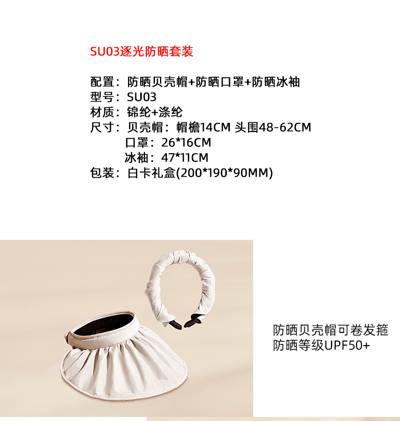 配置:防晒贝壳帽+防晒口罩+防晒冰袖 型号:SU03 材质:锦纶+涤纶 尺寸:贝壳帽:帽檐14cm 头围48-62cm 口罩:26*16cm 冰袖:47*11cm 包装:白卡礼盒(200*190*90mm)