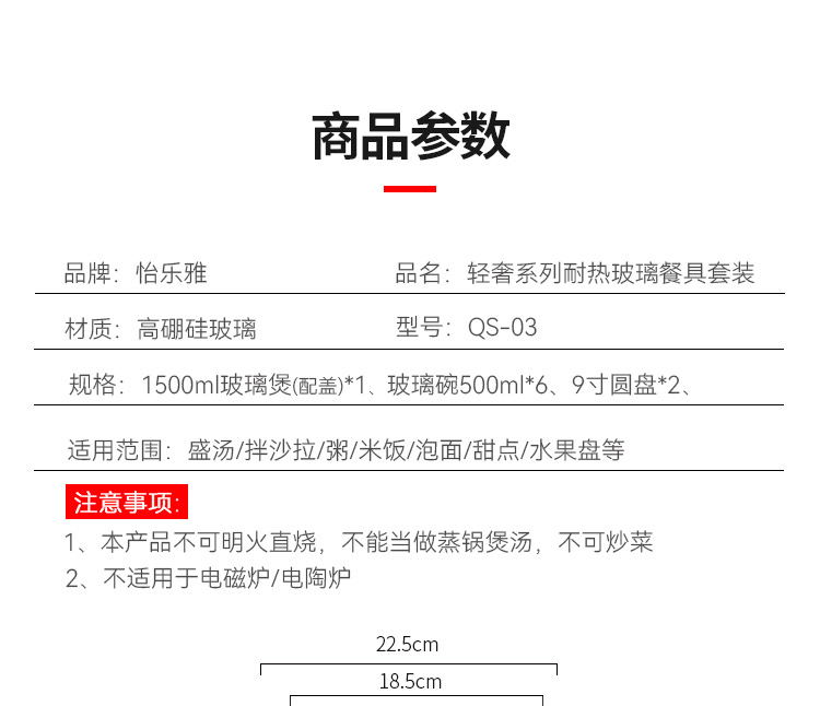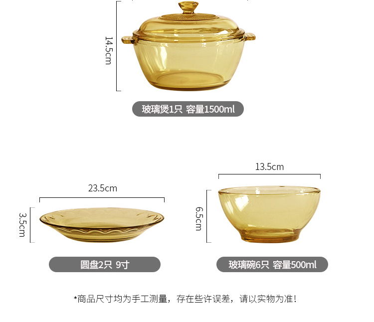 容量:玻璃碗500ml *6+圆盘9寸*2+玻璃煲 1500ml*1 材质:高硼硅耐热玻璃 包装方式:彩盒包装 优势:高品质,低价位,样品支持,前端服务体系完善,售后无忧