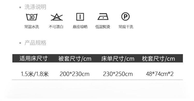 规格: 床单:230*250cm 被罩:200*230cm 枕套:48*74cmx2 面料:棉 1.甄选纯棉磨毛面料手感细腻,柔软舒适,活性印染不易褪色 2.磨毛工艺处理,使套件表面多一层短绒毛,不仅透气吸湿,且舒爽亲肤触感贴心,提升保暖性。 3.健康印染,无荧光增白剂,无致癌芳香胺,睡眠更加安心。