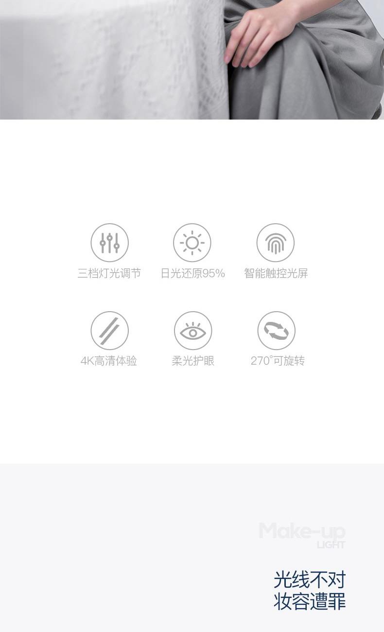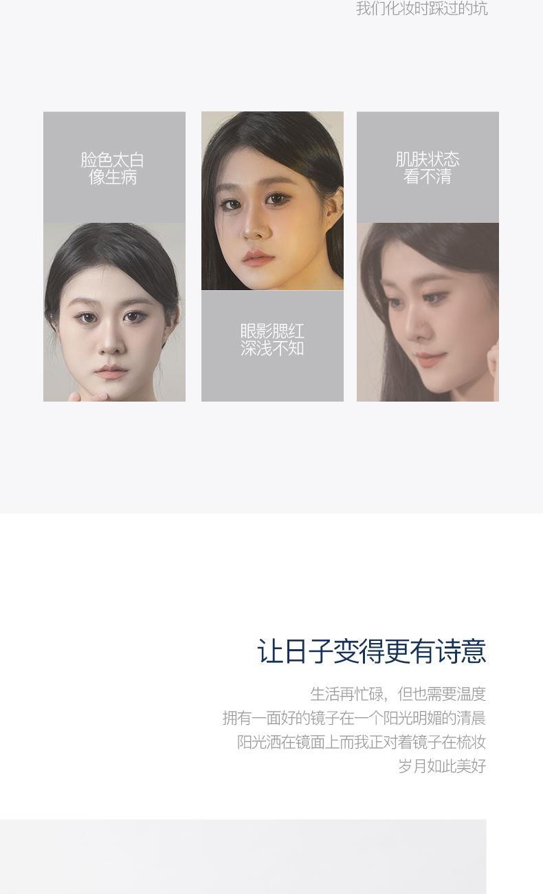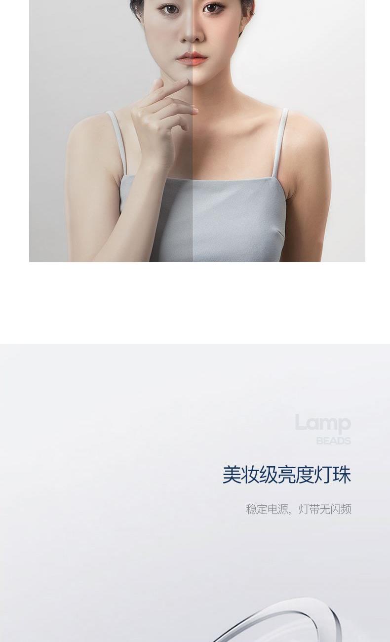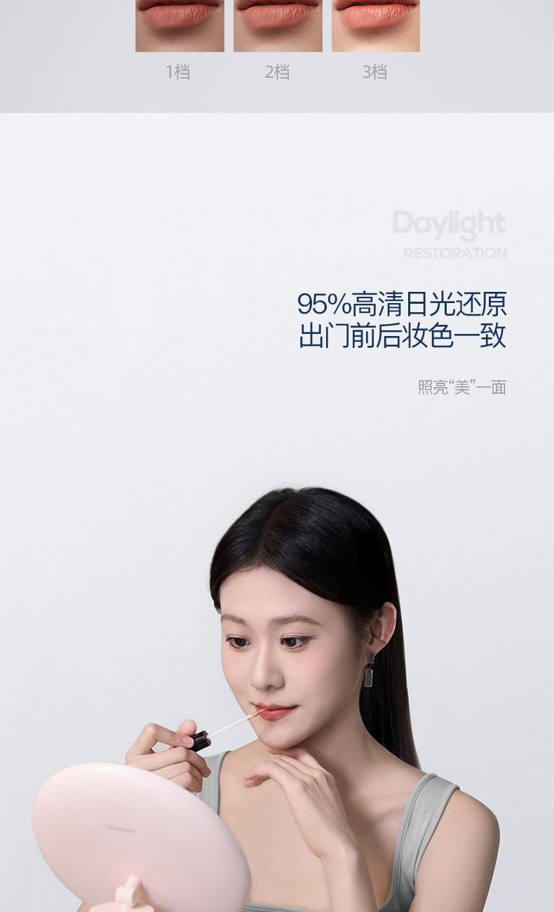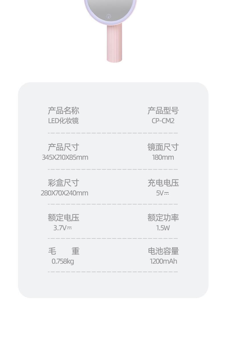 产品参数: 产品型号:CP-CM2 额定电压:3.7V⎓ 充电电压:5V⎓ 额定功率:1.5W 电池容量:1200mAh 商品条码 : 6972831860860 产品尺寸 : 345X210X85mm 包装尺寸:280X70X240mm 产品毛重 : 758g 核心卖点: 1、3个档位调节,触控光屏,一键调节 2、95%高清日光还原,出门前后妆色一致 3、美妆级亮度灯珠,稳定电源,灯带无闪频 4、4K高清体验,精选高清镀银镜面,无色偏,无变形 5、可调节镜面,270°可旋转,多角度灵活上妆,满足你的不同需求 6、180MM大镜面,无线长续航