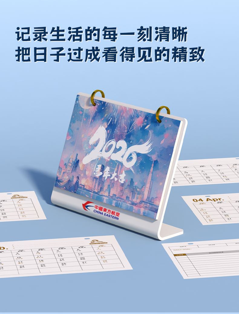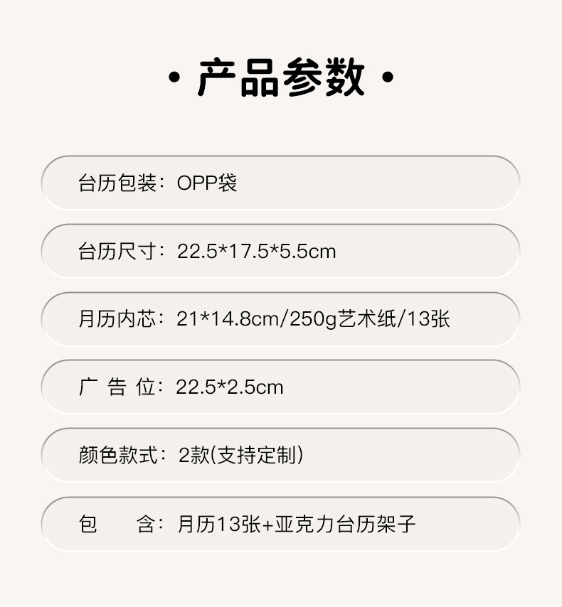台历尺寸:22.5*17.5*5.5cm 内芯尺寸:21*14.8cm 广告位:22.5*2.5cm 包含:13张内芯+亚克力台历架子