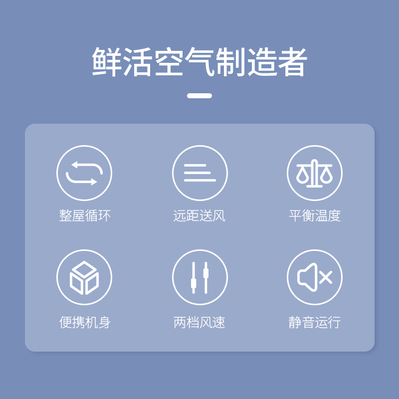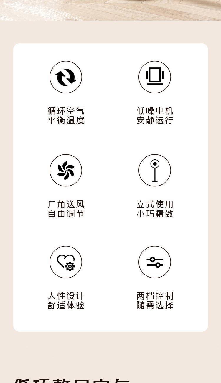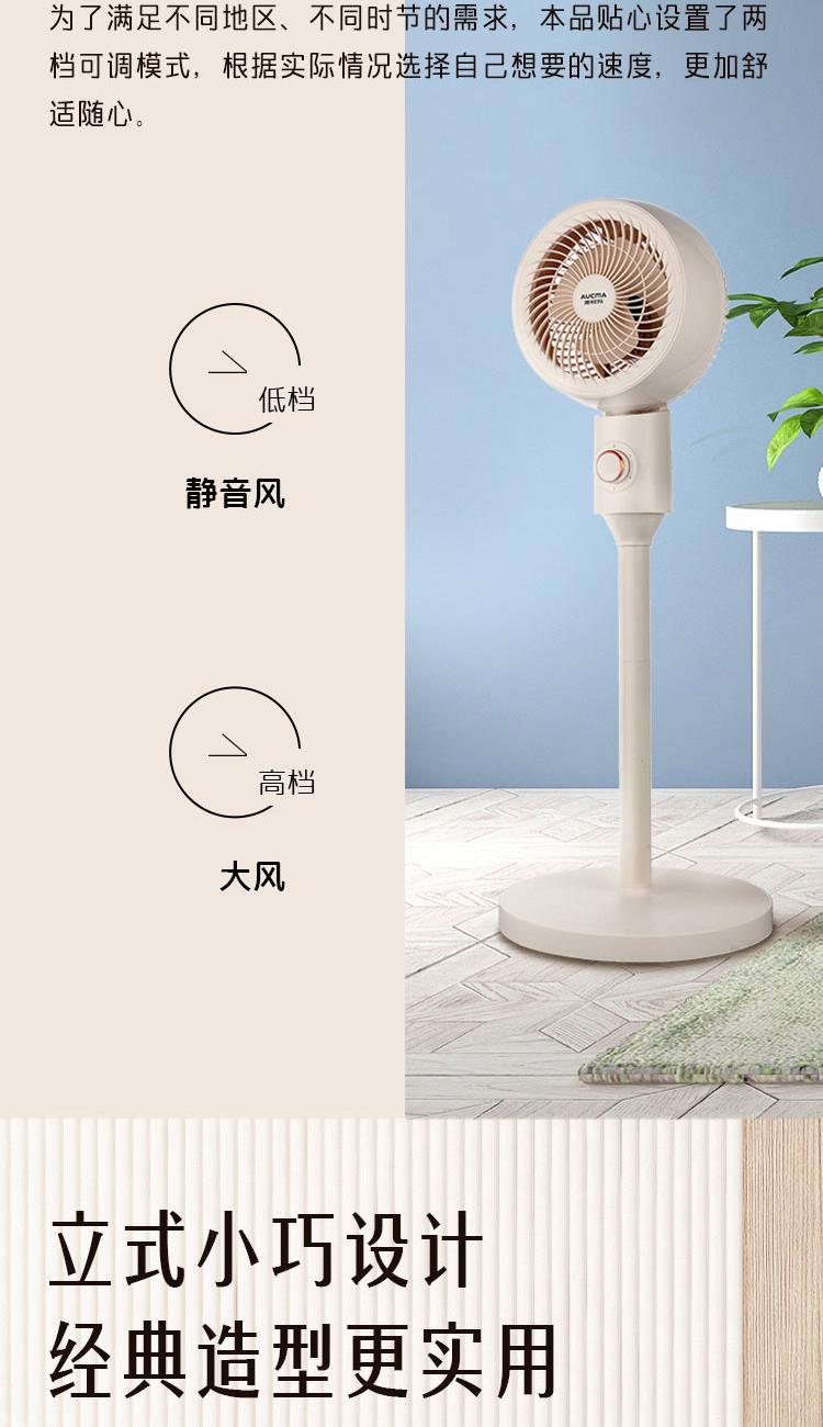 额定功率:45W 风 速:5.0m/s 档 位:2档 净 重:1.8kg 包装尺寸:350×265×380mm 产品尺寸:340*340*900mm 装 箱 数:1pcs 将室内空气形成对流循环,同时也可以循环室内外的空气,清新空气。 小巧精致机身,立式使用。 大扭角涡轮风叶搭配扩压风筒设计,增大风压,远距离送风 安静运行,柔风伴睡更安心,可用于夜间,不打扰睡眠,静谧安静 低档静音风,大风,随心选择。
