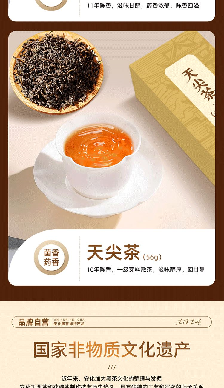 ②天尖:14年安化云台山陈年老料,叶底匀整成型,药香/参香,显茶韵,浓香耐泡,醇厚滑爽。