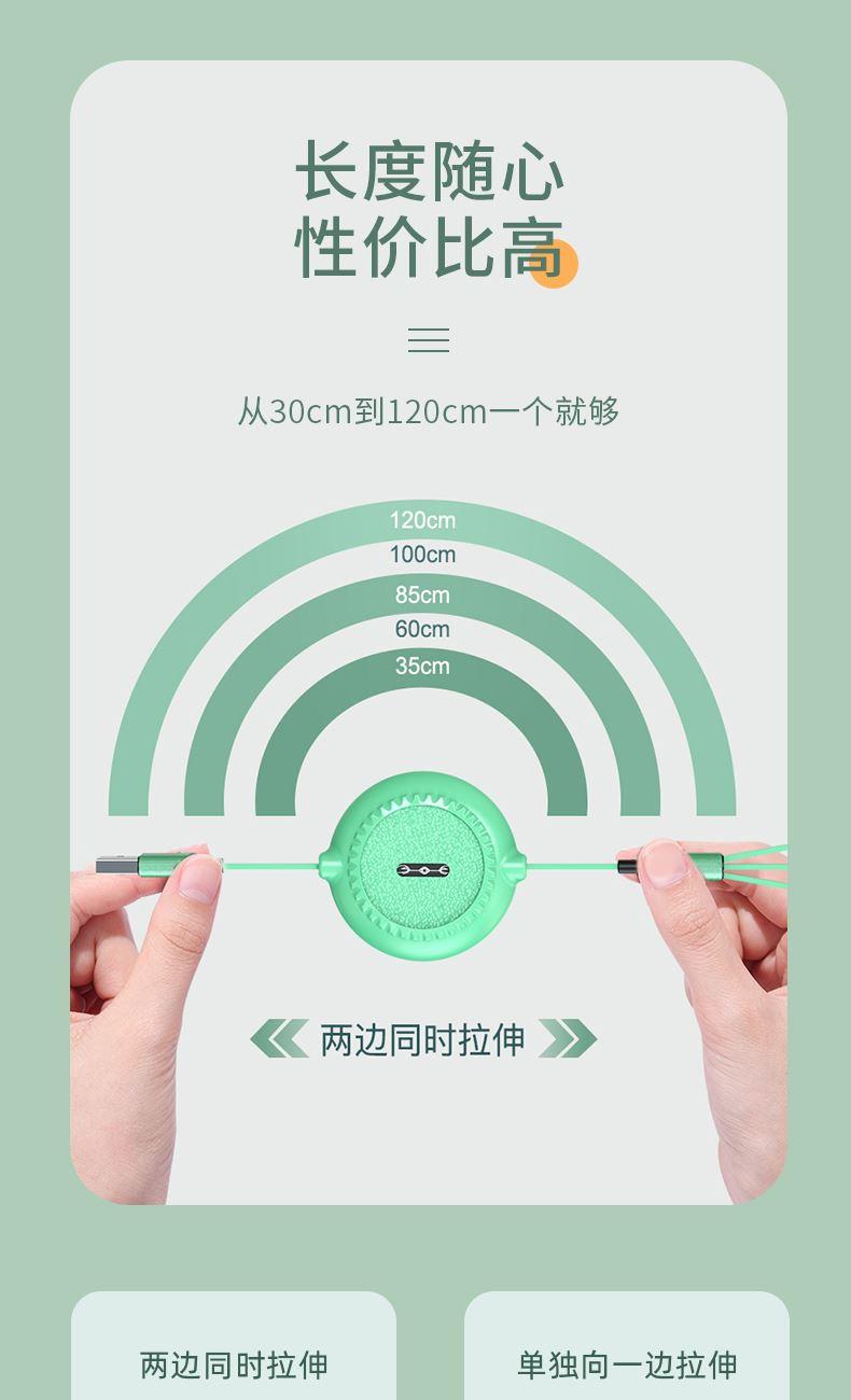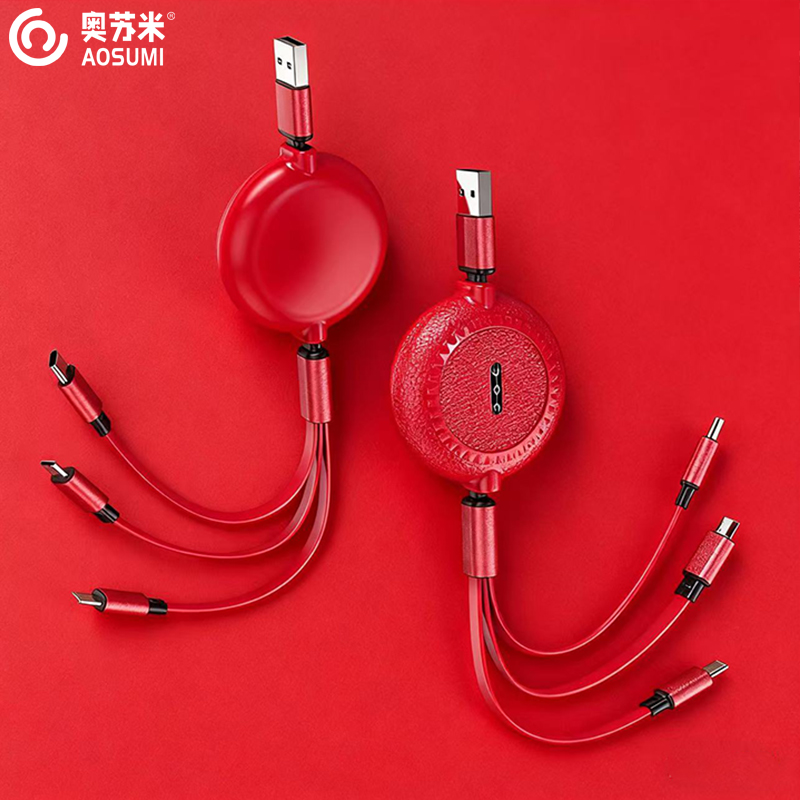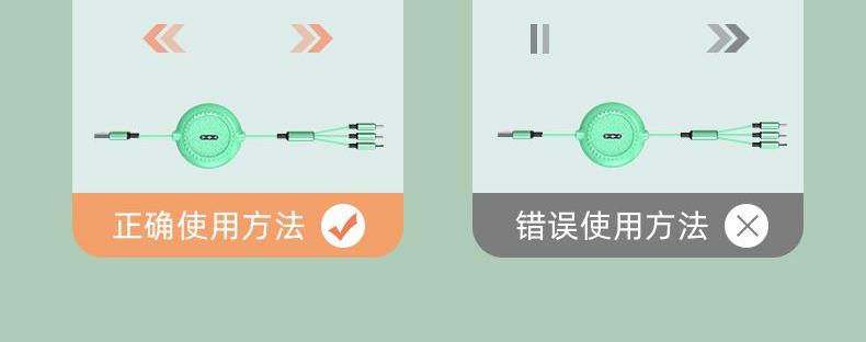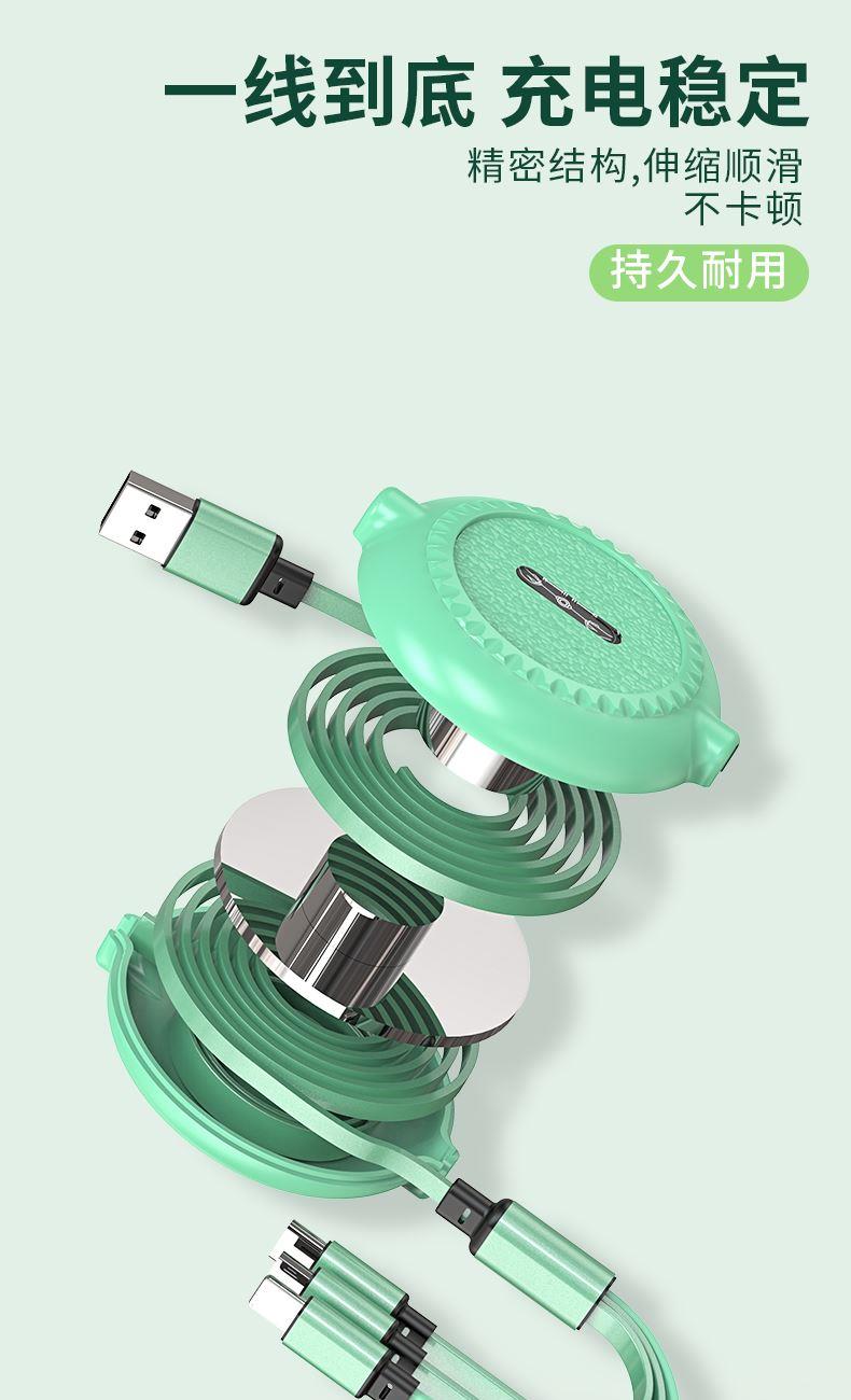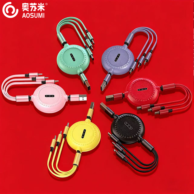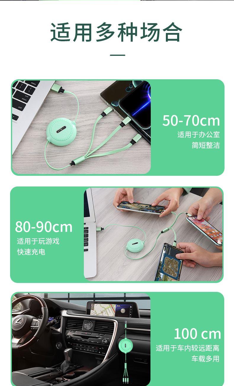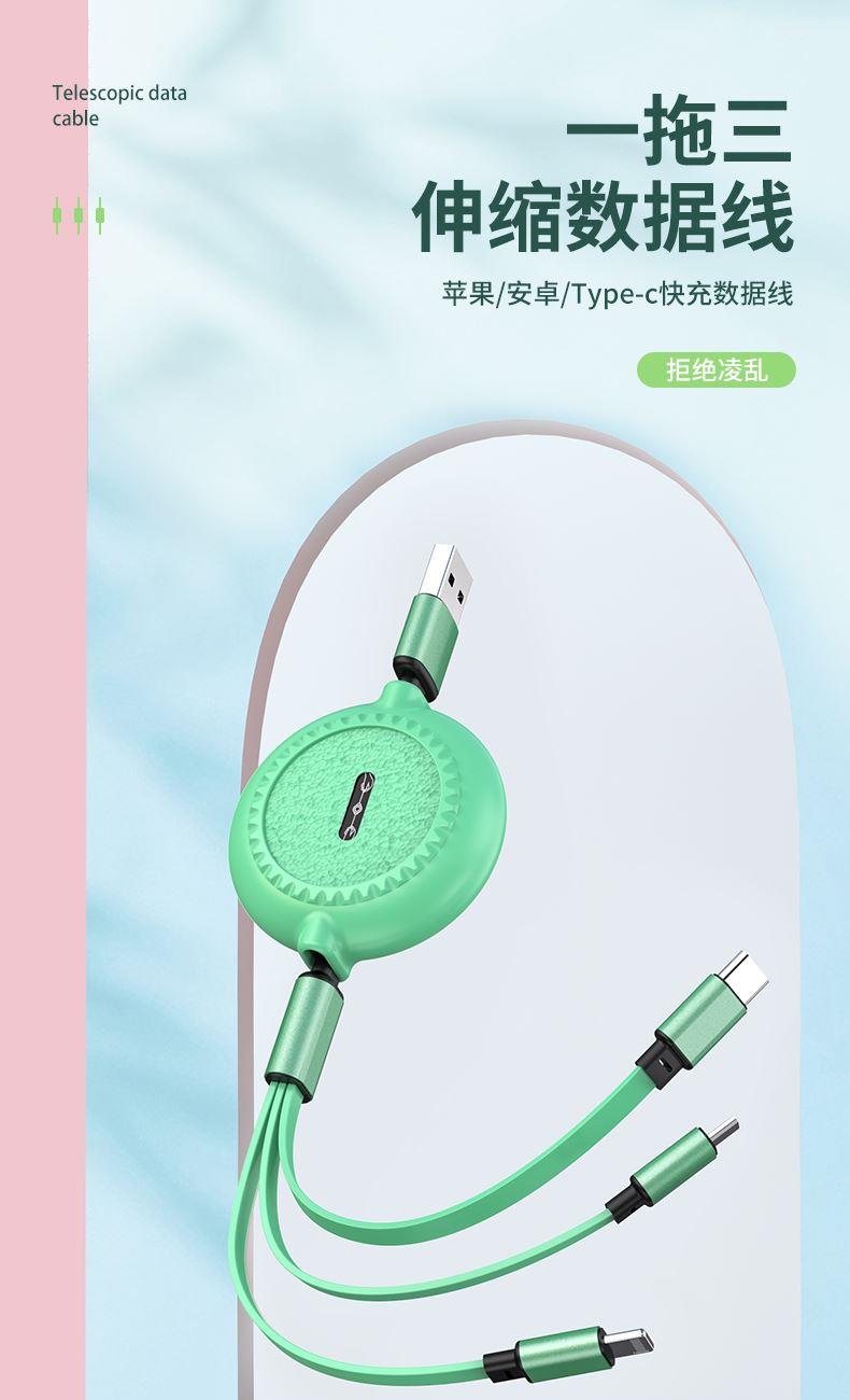彩虹一拖三数据线 颜色:蓝 粉 绿 黑 红 黄 材质:TPE线 尺寸:1.1M 包装:彩盒包装 【功能特点】: 3A快充数据线,充电更快 三种接口满足各种手机 1.1米长度设计,使用方便 TPE材质耐用,不易折断 马卡龙配色多种选择 五档伸缩调节