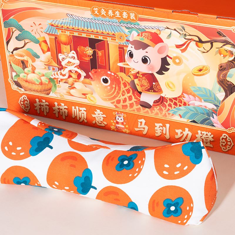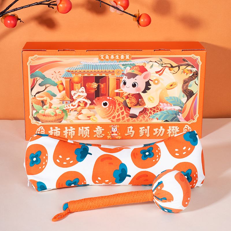 礼盒规格:460*240*100mm 产品配置:艾草三角枕40*12cm*1 艾草养生锤26cm*1 推荐理由: 1、主题“柿柿顺意 马到功橙”,吉祥寓意满满,既与产品面料颜色图案相呼应,又体现了马年开门红元素,是新年贺岁、开门红主题产品! 2、橙色系瓦楞礼盒,国潮图案,喜庆大气。 3、精选老粗布面料,亲肤耐磨,色彩艳丽,祥云片片/好柿连连双色可选,美得各有千秋。 4、艾草锤,填充多味本草,艾在手上,锤出安康;艾草三角枕,两侧高,中心低,更好承托颈部曲线,拉伸颈椎;搭配使用,健康翻倍。