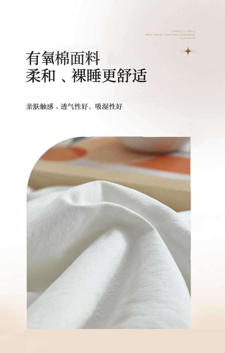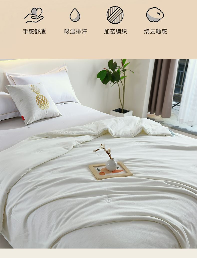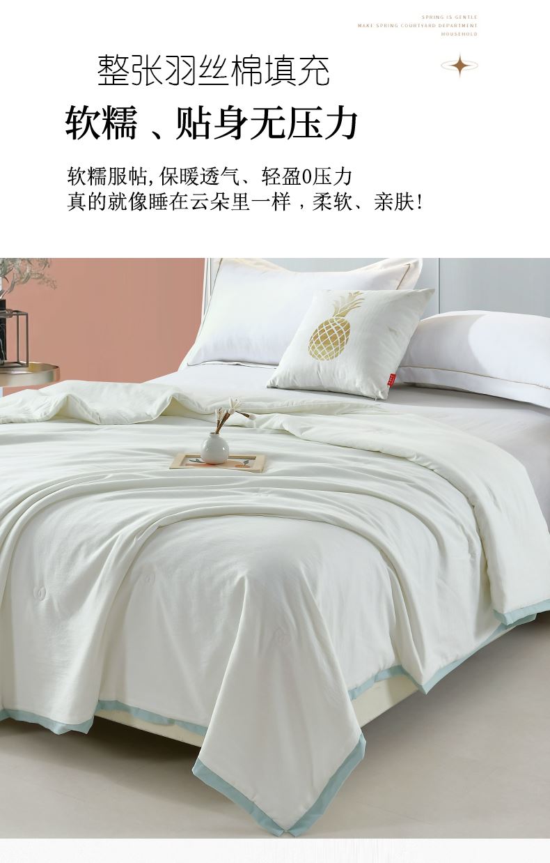 规格:200*230cm 面料:有氧棉(聚酯纤维) 填充:羽丝棉 重量:1300g 执行标准:GB/T22796-2021 安全类别:GB18401-2010 B类 1.臻选有氧棉面料,源于自然的绵软触感 质感丰盈软糯与肌肤零距离接触,弹性更优良。 2.填充超柔羽丝纤维适合肌肤敏感,零压体验,释放身心压力:科学分区设、计:根据人体工学原理,将被子划分为不同区域,有效缓解压力,促进血液循环。