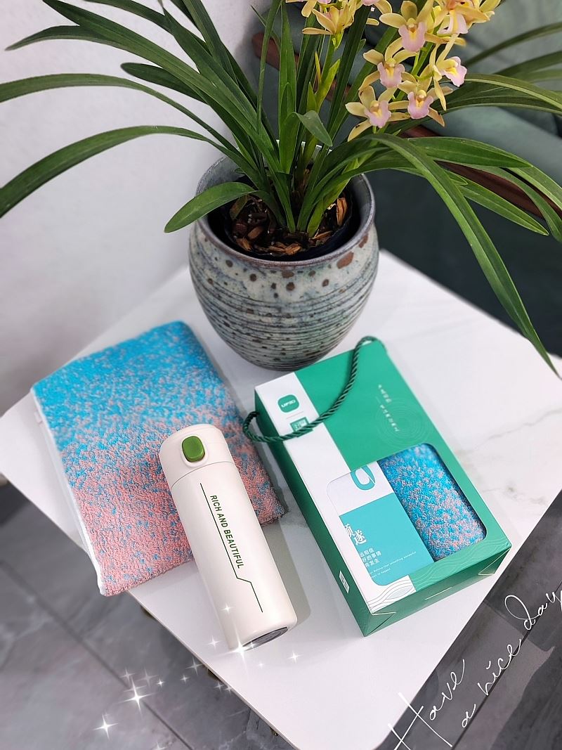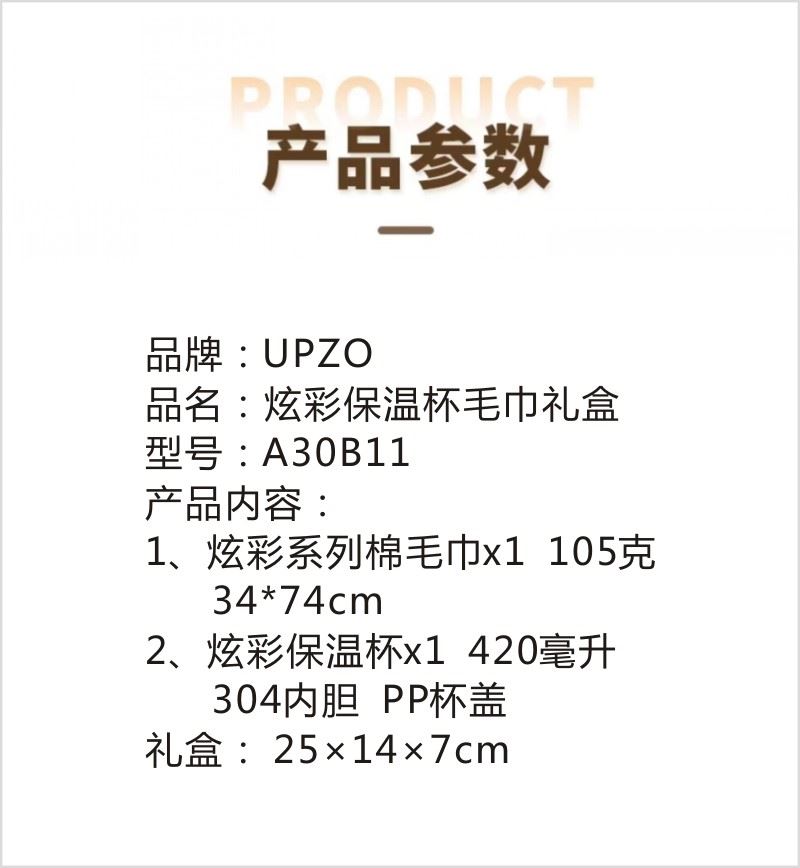 型号:A30B11 产品内容: 1、炫彩系列棉毛巾×1 (双色随机 渐变色) 规格: 34CM*74CM (105g每条) 2、炫彩保温杯×1 304内胆 PP杯盖 420毫升容量 礼盒规格:25*14*7CM 420毫升高颜值保温杯 304内胆 精美设计文案 炫彩系列毛巾精选精梳棉材质结合色织工艺 优质且靓丽
