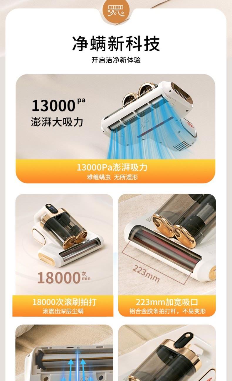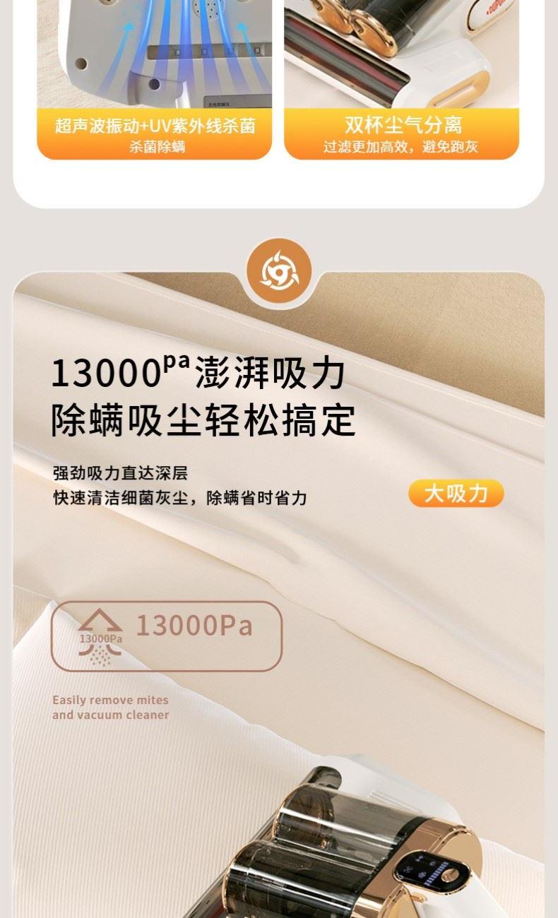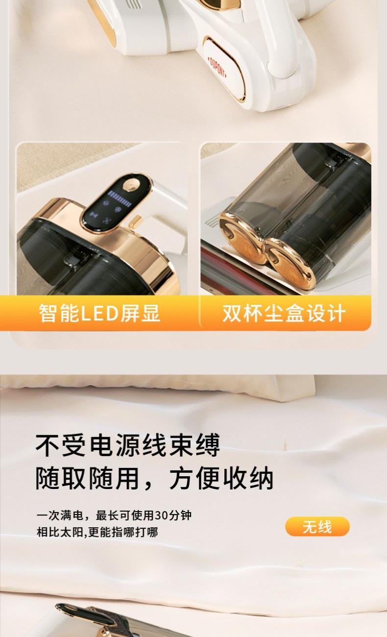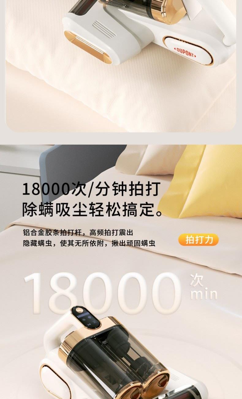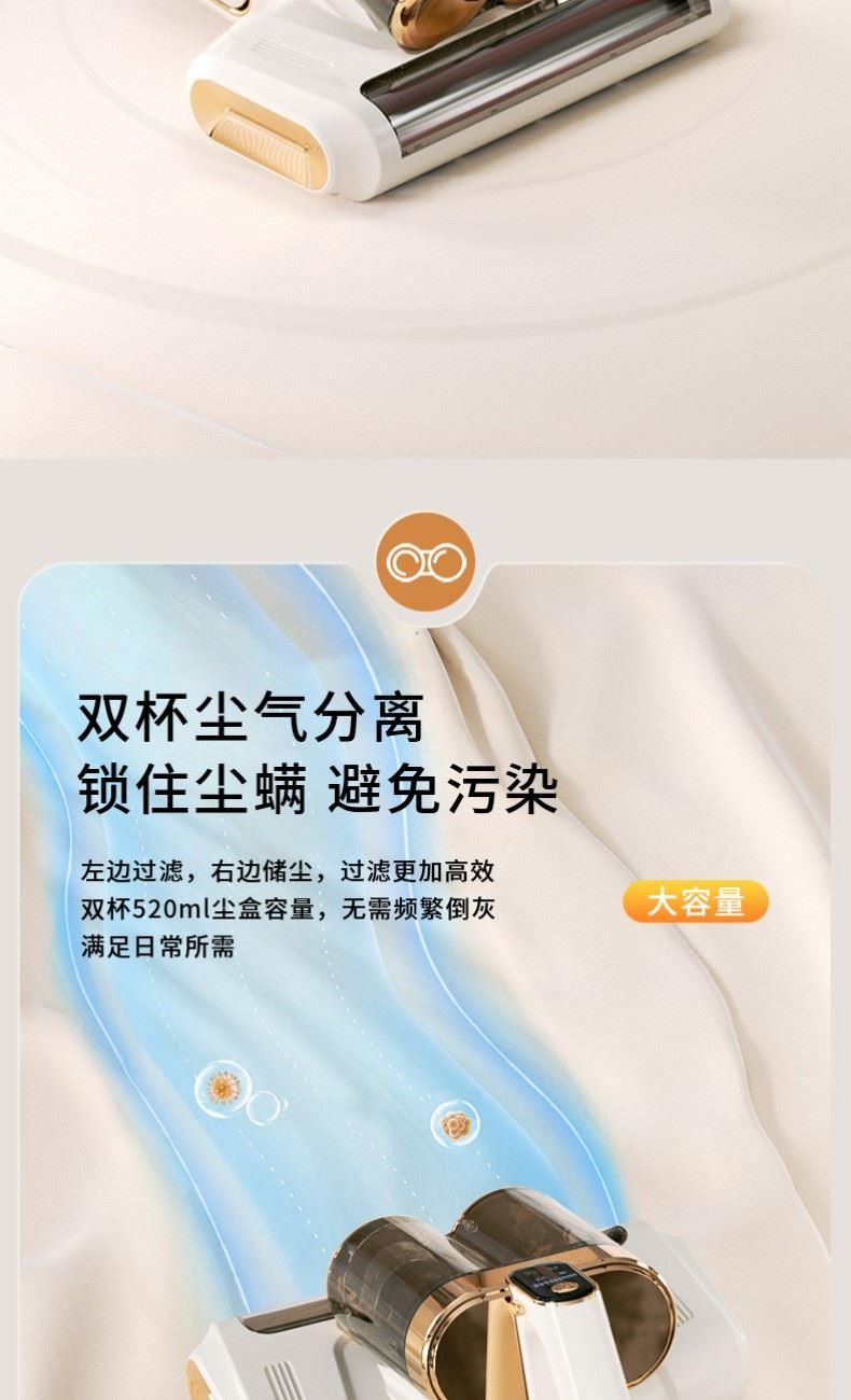 产品材质:PP+ABS+304不锈钢 充电输入:DC5V2A 工作电压:DC11.1V 尘盒容量:520mL 电池容量:1800mAh 真 空 度:13000Pa 额定功率:120W 产品净重:1.5kg 产品毛重:2.0kg 产品尺寸:294.5*270*185.4mm 包装尺寸:320*296*214mm 外箱尺寸:610*455*655mm 装 箱 数:8台/箱 外观简洁大气,金色电镀装饰件美观更显档次。 智能LED屏显,除螨,超声,滚刷一键显示,一目了然。 双杯尘气分离,左边过滤,右边储尘,过滤更加高效,避免跑灰。 双杯520ml尘盒容量,无需频繁倒灰,满足日常所需。 双杯一键拆卸,倒灰清洗更便捷。 滚刷,吸尘双电机,除螨大吸力,工作更高效。 223mm加宽吸口,配合铝合金胶条拍打杆,高效除螨。 13000Pa澎湃吸力,18000次/分钟拍打,除螨吸尘轻松搞定。 无线除螨,随取随用,不受电源线束缚,方便收纳