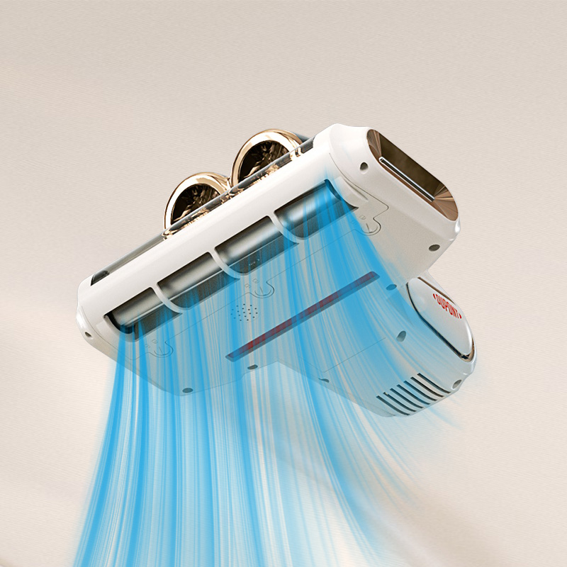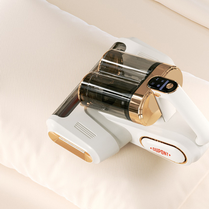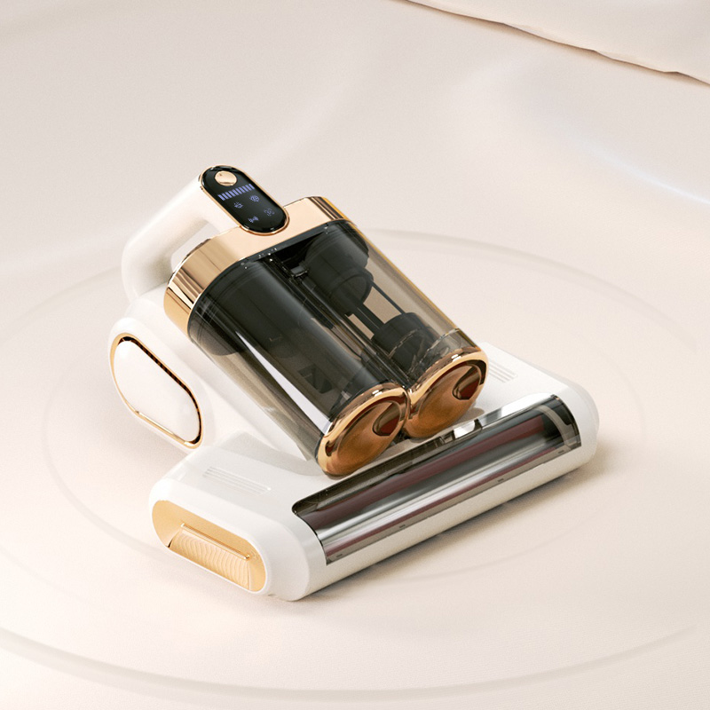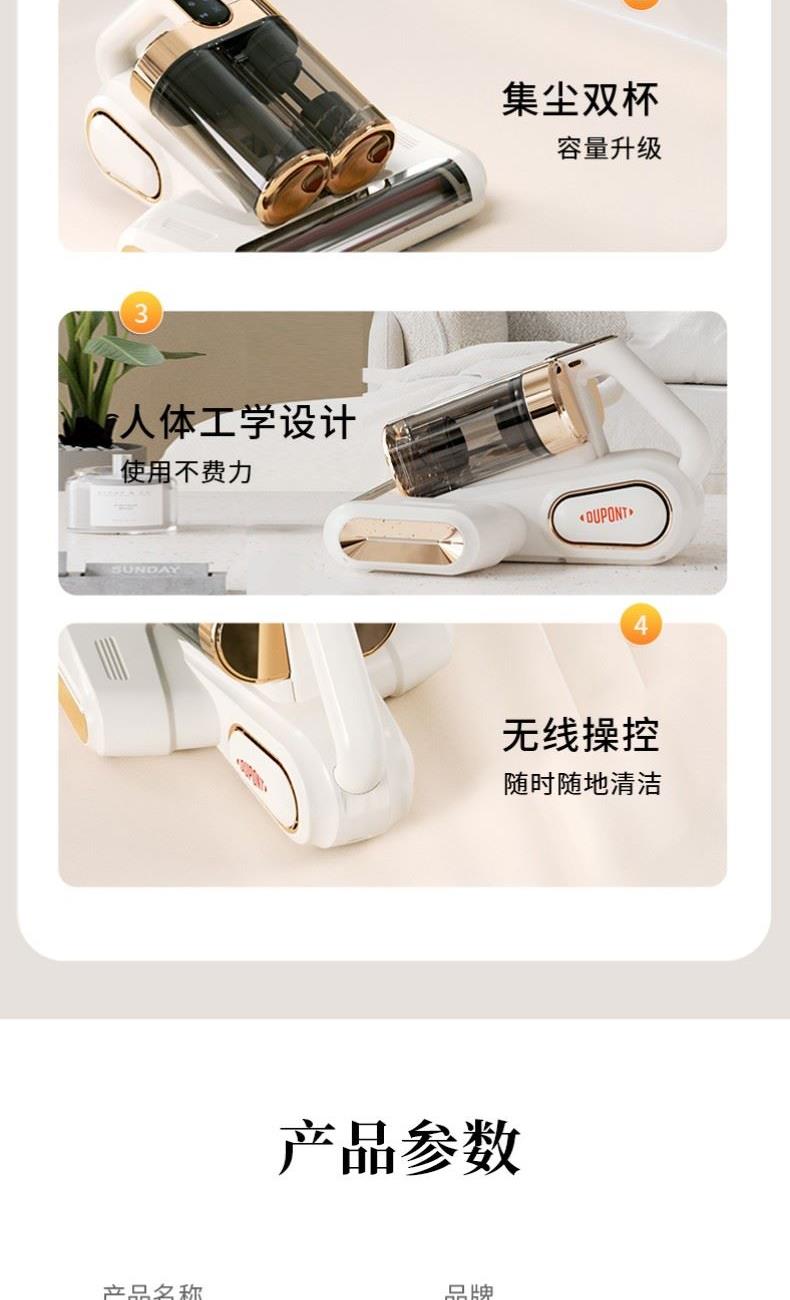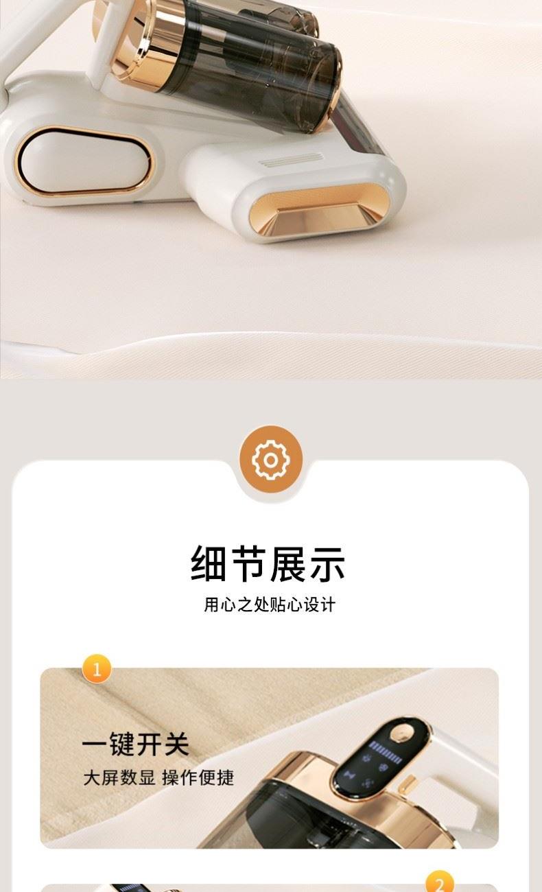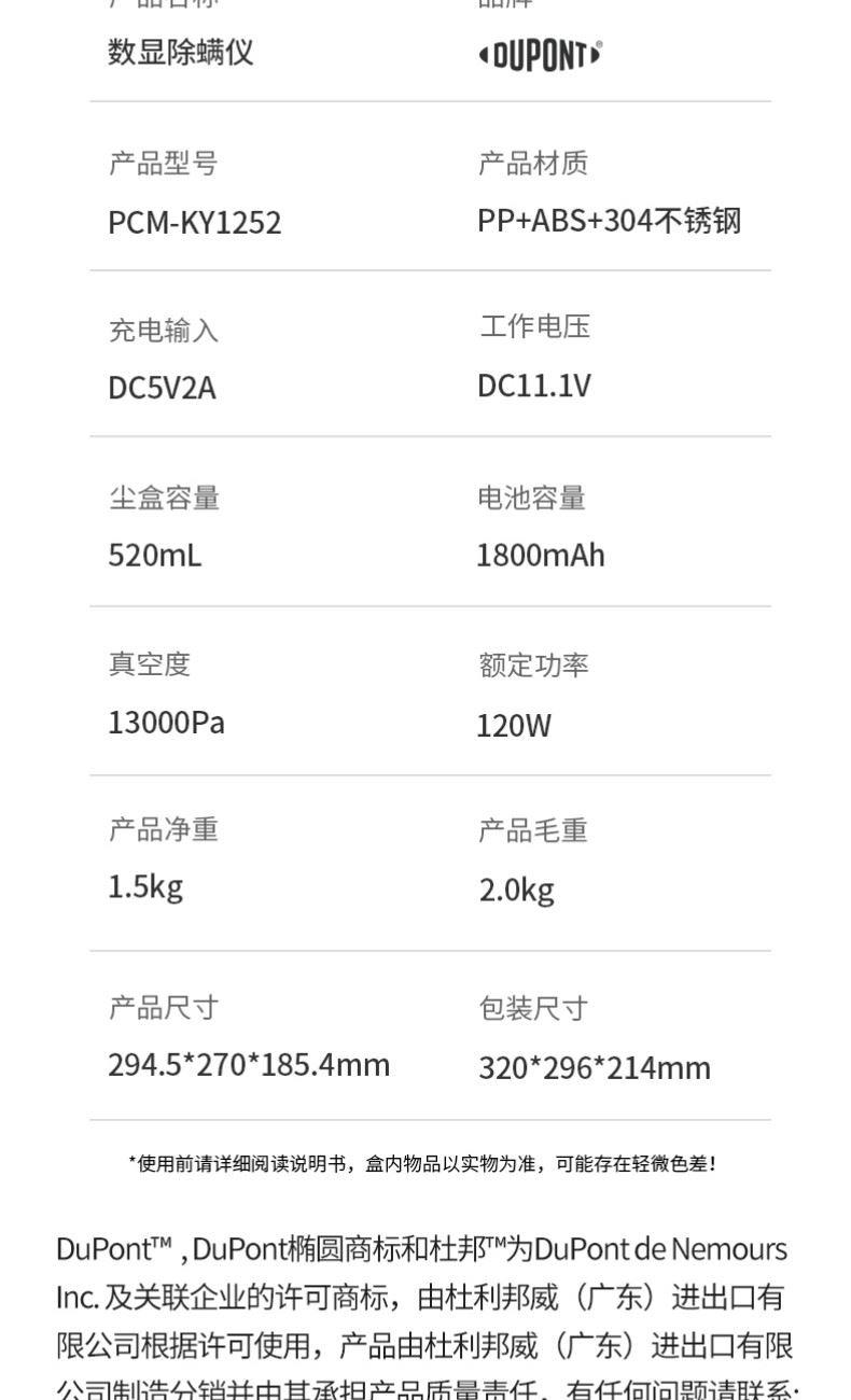 产品材质:PP+ABS+304不锈钢 充电输入:DC5V2A 工作电压:DC11.1V 尘盒容量:520mL 电池容量:1800mAh 真 空 度:13000Pa 额定功率:120W 产品净重:1.5kg 产品毛重:2.0kg 产品尺寸:294.5*270*185.4mm 包装尺寸:320*296*214mm 外箱尺寸:610*455*655mm 装 箱 数:8台/箱 外观简洁大气,金色电镀装饰件美观更显档次。 智能LED屏显,除螨,超声,滚刷一键显示,一目了然。 双杯尘气分离,左边过滤,右边储尘,过滤更加高效,避免跑灰。 双杯520ml尘盒容量,无需频繁倒灰,满足日常所需。 双杯一键拆卸,倒灰清洗更便捷。 滚刷,吸尘双电机,除螨大吸力,工作更高效。 223mm加宽吸口,配合铝合金胶条拍打杆,高效除螨。 13000Pa澎湃吸力,18000次/分钟拍打,除螨吸尘轻松搞定。 无线除螨,随取随用,不受电源线束缚,方便收纳