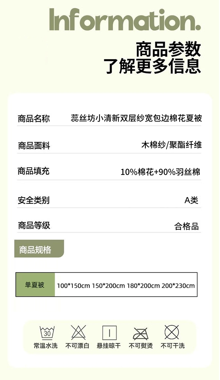 规格:150*200cm 面料:双层纱/聚酯纤维 填充:10%棉花+90%羽丝棉 花型:蓝点点、春日小猫、动感星星、繁花-蓝、花影、花之兔、苹果猫、小熊猫、星星小马、云感-蓝 ✅ 甄选双层纱面料,自带空气感蓬松肌理,摸起来软而不塌,像云朵裹身 ✅ 透气不闷汗,空调房不凉、常温不闷,敏感肌、裸睡党友好 ✅ 10% 棉花 + 90% 整张棉黄金填充,既有棉花的天然温润,又有整张棉的蓬松回弹 ✅ 加宽包边工艺,锁边更牢固,耐洗耐造