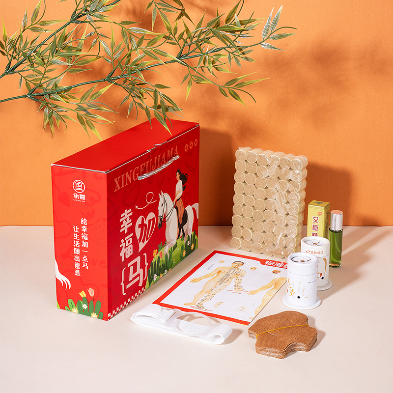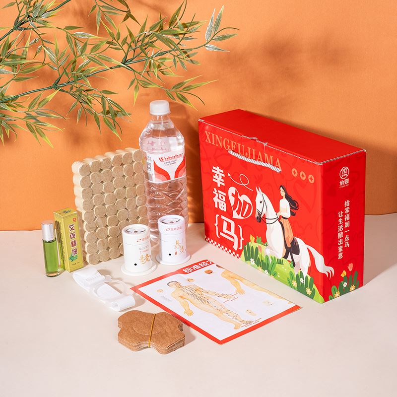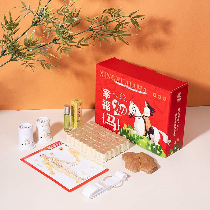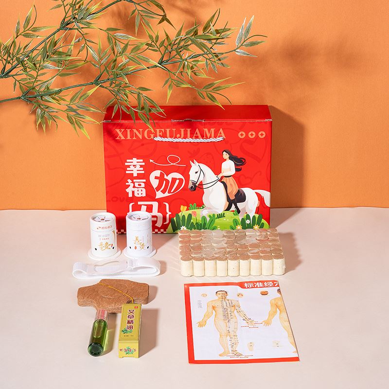 产品配置:人体穴位图*1 艾草精油10ml*1 艾柱54粒*1 悬灸仪*2 悬灸胶贴*20 固定绑带*1 幸福加马彩盒*1个