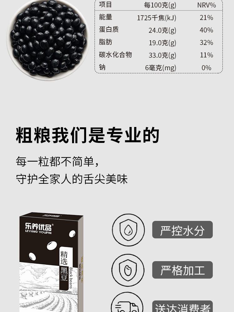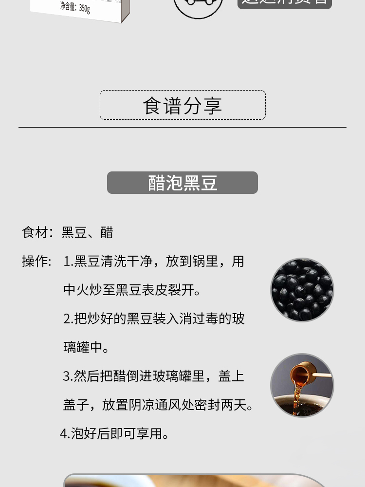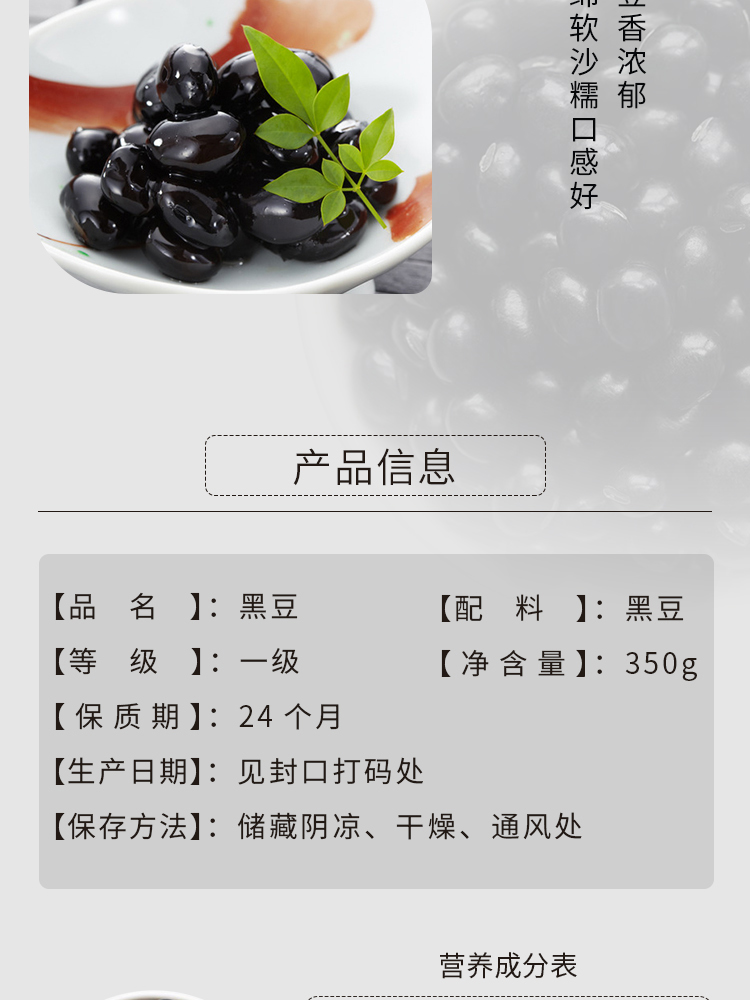 注:该产品二盒起发! 配料:黑豆 净含量:350g 等级:一级 保质期:24个月