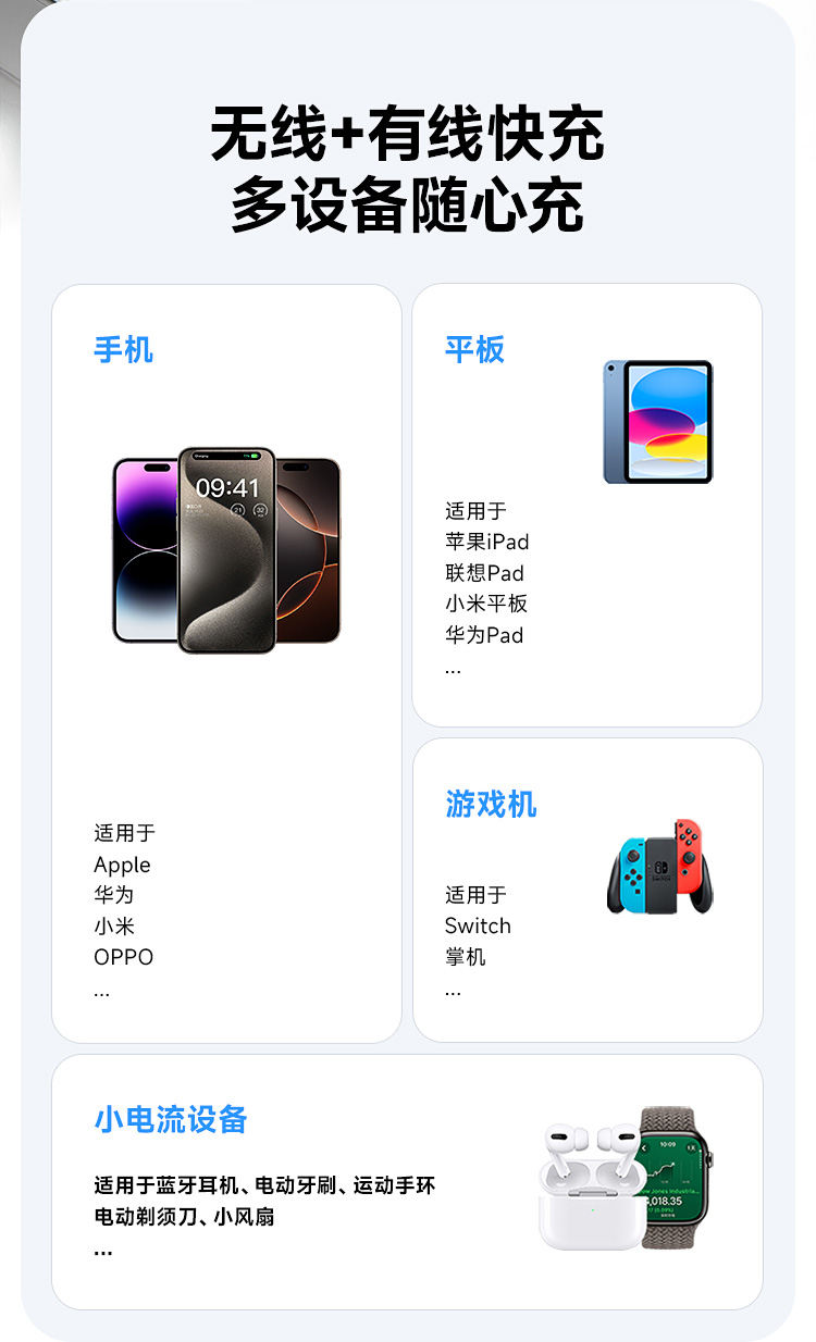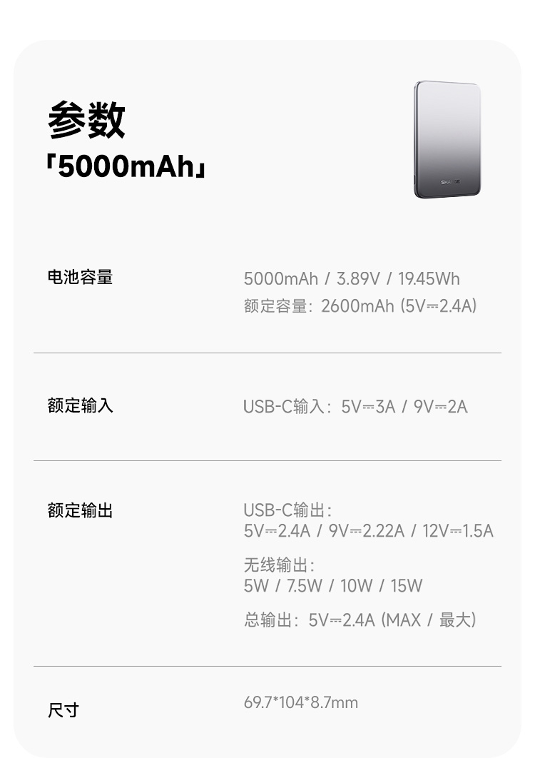 型号:M6 材质:铝合金+硅胶 容量:5000mAh 输出:USB-C:20W Max 无线输出:5W/7.5W/10W/15W Max 总输出:5V⎓2.4A 产品尺寸:6.97*10.4*0.87cm 包装尺寸:14.1*9.9*2cm 5000mAh,3C安全认证 无线5W-15W,有线20W,二合一快充 轻113g,薄8.7mm,手感亲肤细腻 独特渐变效果,金属阳极氧化工艺 兼容PD3.0/PPS/QC/FCP/SCP等快充协议