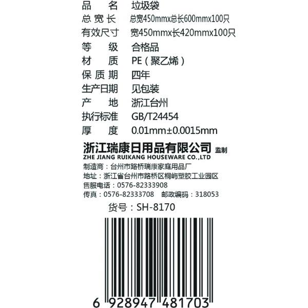 规格:450mm*600mm*20只*5卷 材质:PE(聚乙烯)
