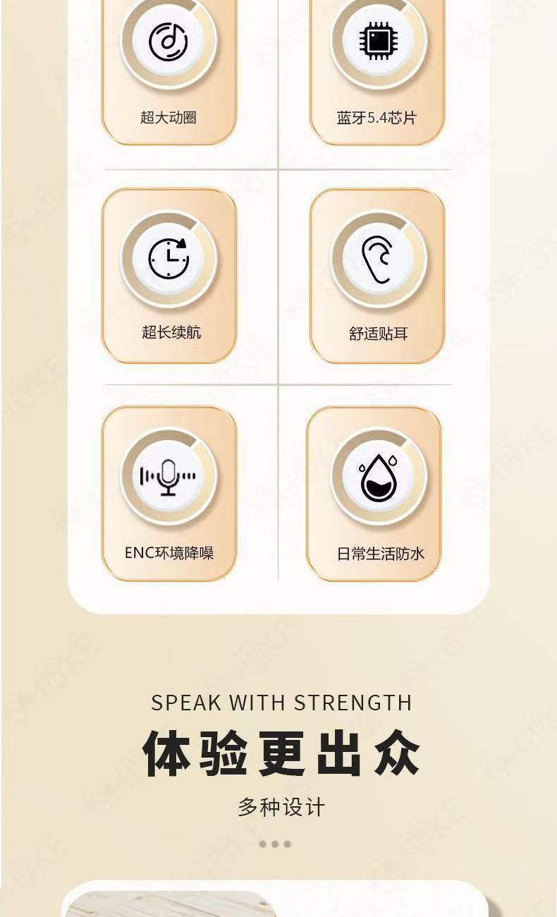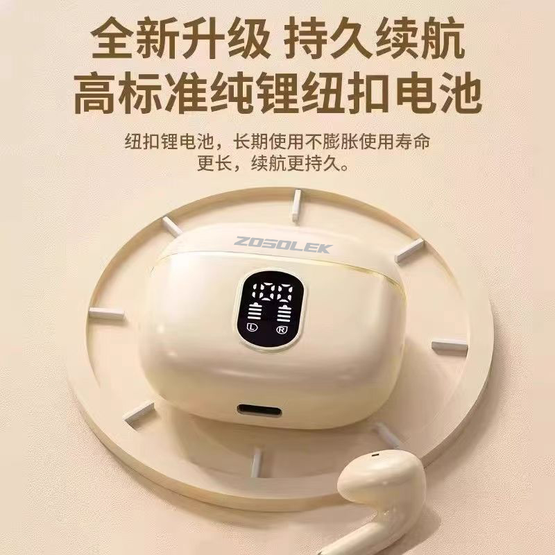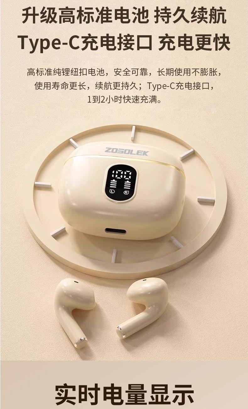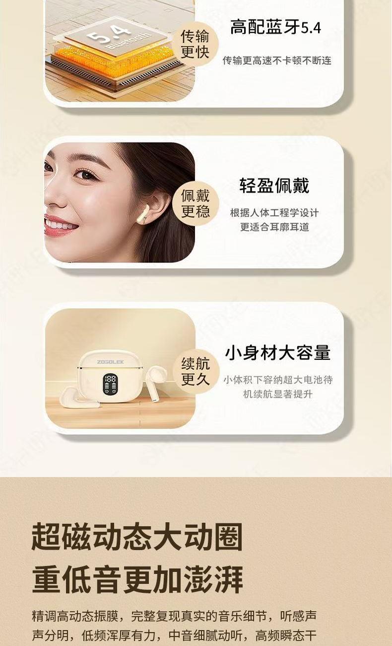 产品特点:1、精致小巧、佩戴舒适、携带方便;2、德国专业调音团队,无限调试,适合每一双挑剔的耳朵;3、数显电量,一目了然,掌控电量,畅享无忧;4、低功耗DSP抗干扰Bluetooth5.4芯片,连接顺畅不卡顿;5、ACC+SBC音频解码,无感延迟,音画同步;6、封闭式腔体设计,减少失真,超大双动圈发声,无损音质,畅享重低音HIFI音效;7、ENC通话降噪,双重抗风噪,实现高清通话;8、安全高标准锂电池,续航更持久;9、生活防水,防水防汗,无惧风雨;10、礼盒包装,支持定制。
