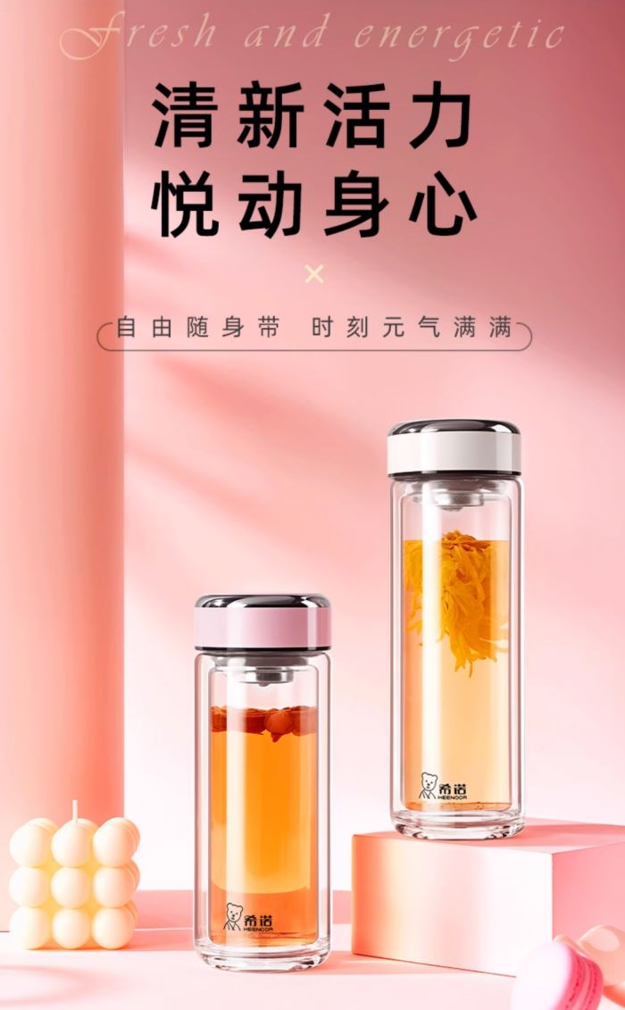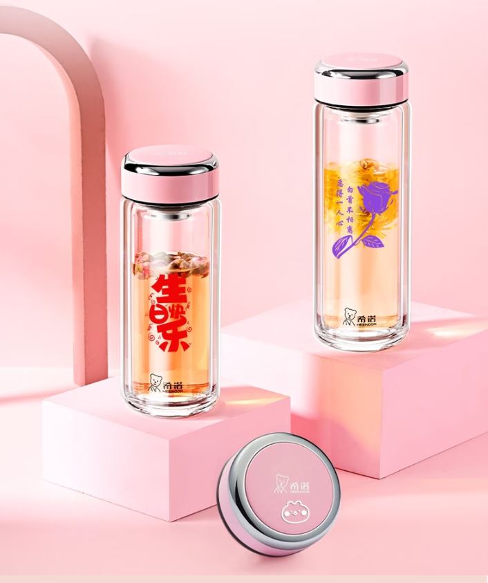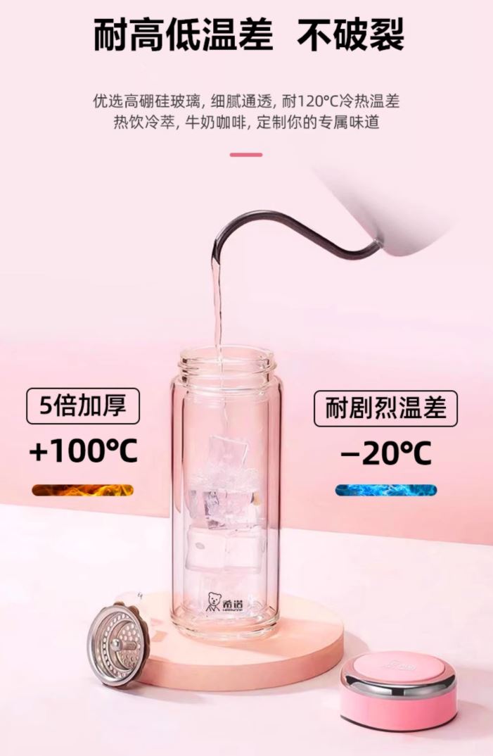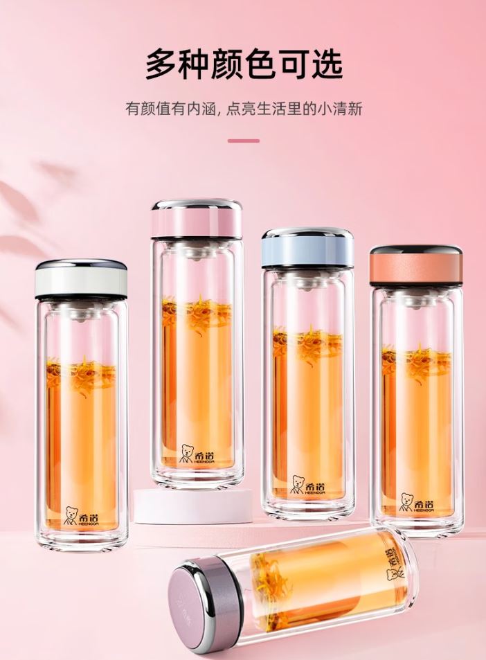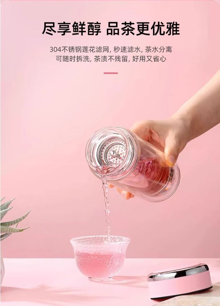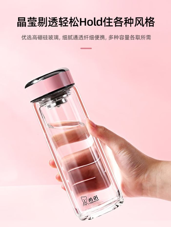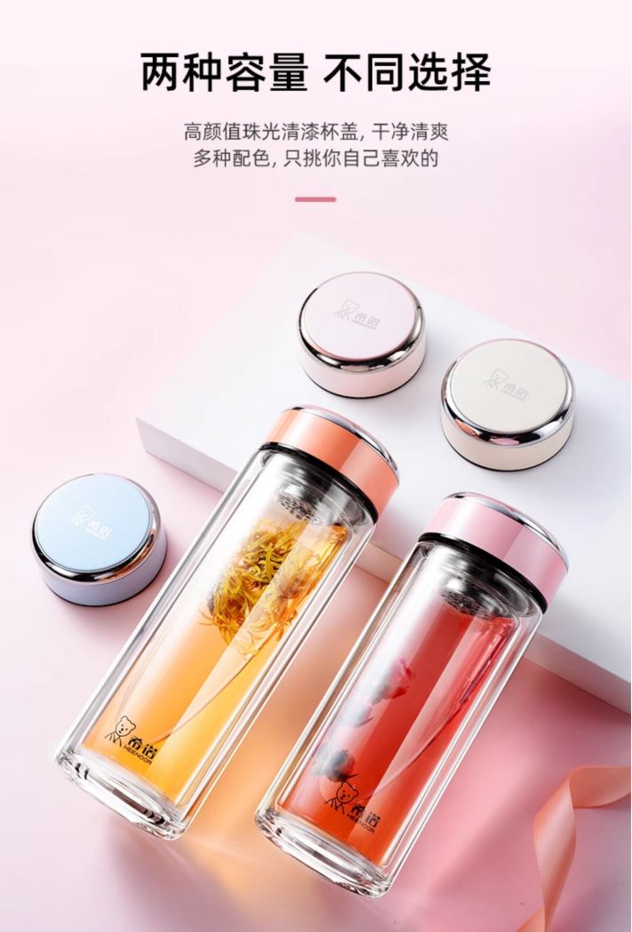 产品规格: 容量:XN-9393/320ml 规格: XN-9393/20.3*6.6cm 颜色:紫罗兰、珠光本、粉色、浅蓝、橙色、米白、浅紫、玫瑰粉 杯体:双层高硼玻璃 滤网:莲花滤网