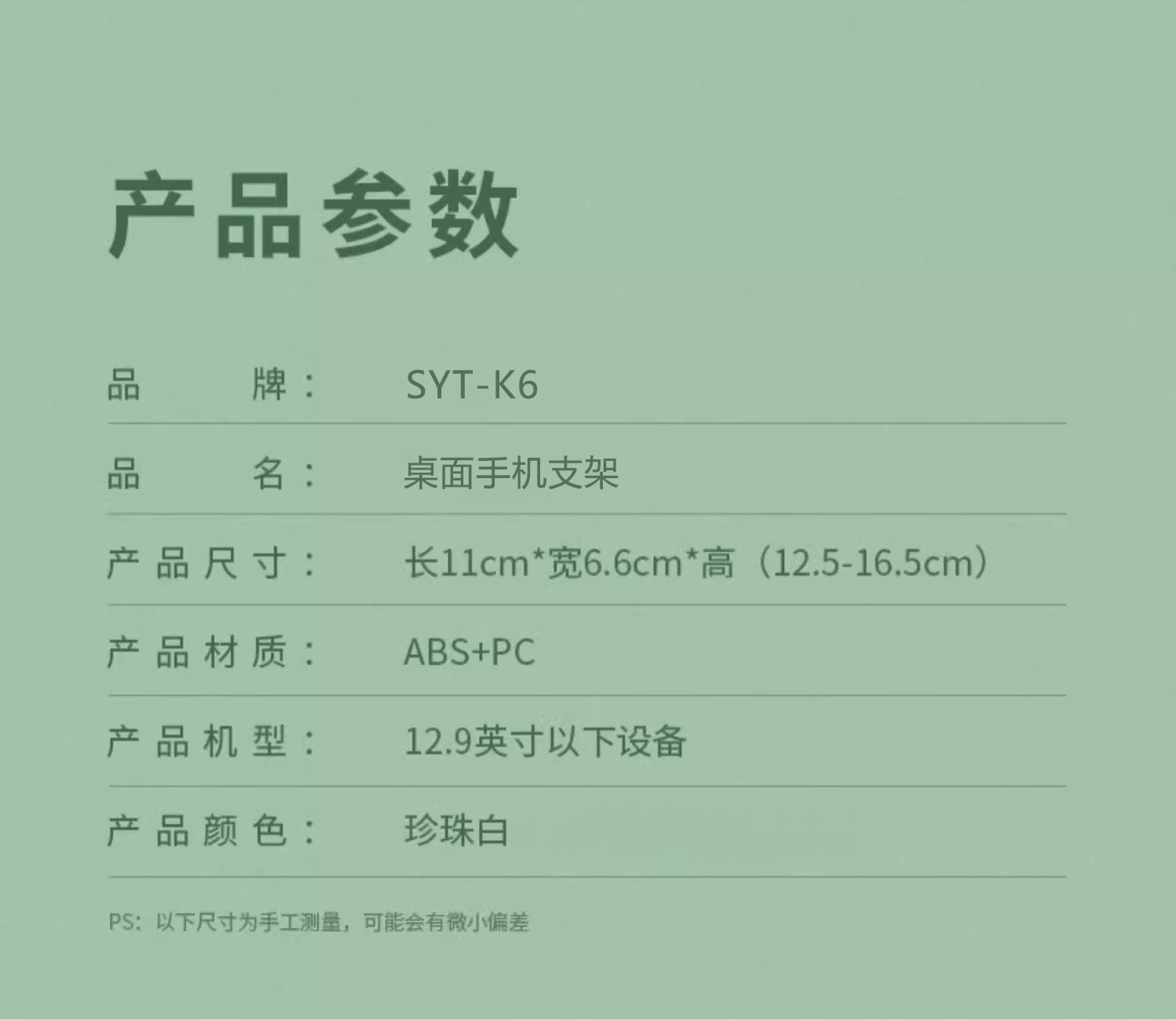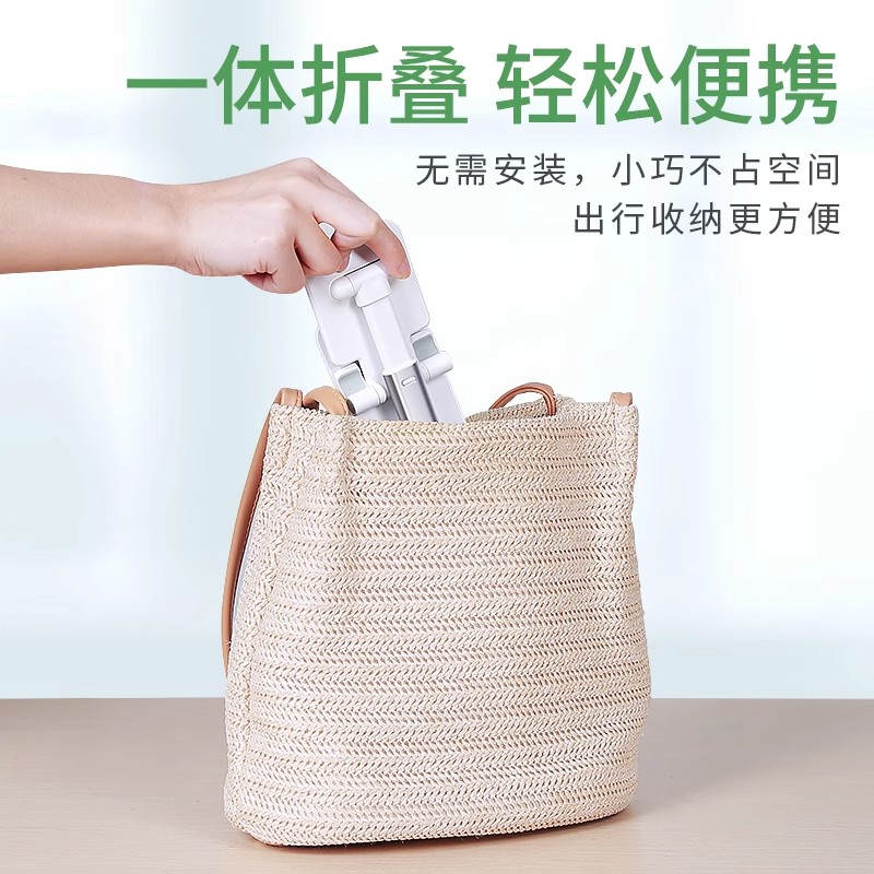 颜 色: 白色 材 质:pp原料+泡棉面板 产品尺寸:130*66*27mm 包装尺寸:11.2*6.7*2.8cm 产品净重:129g 可伸缩折叠收纳,方便携带 高度自由调节 角度自由调节 适合礼品/赠品 定制方便