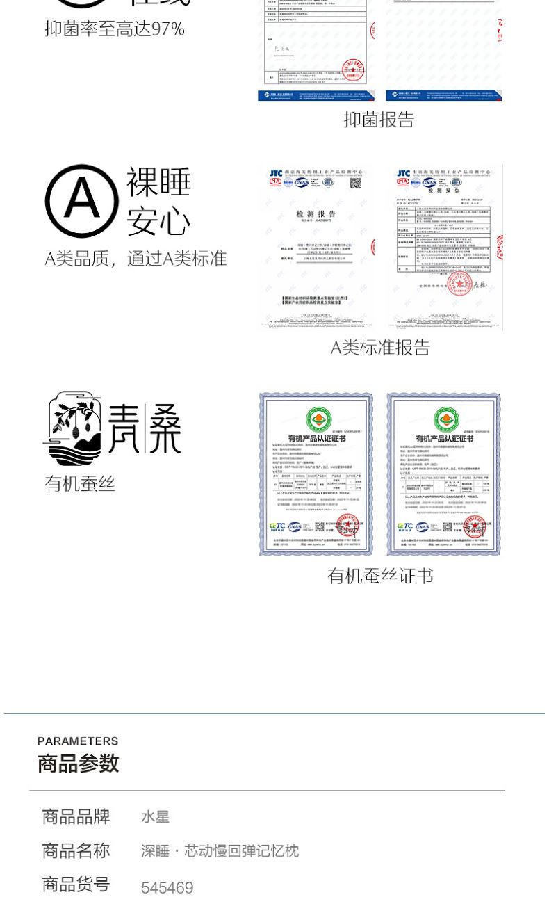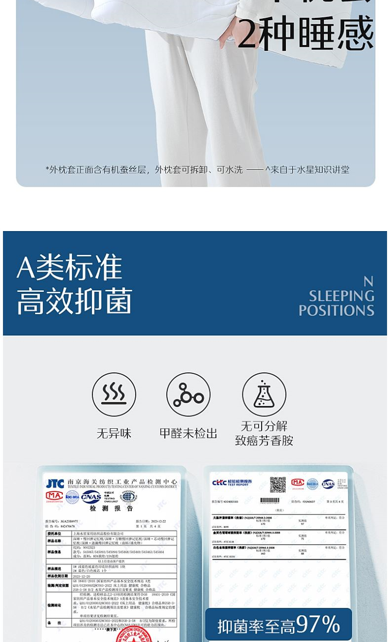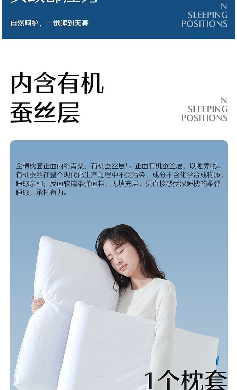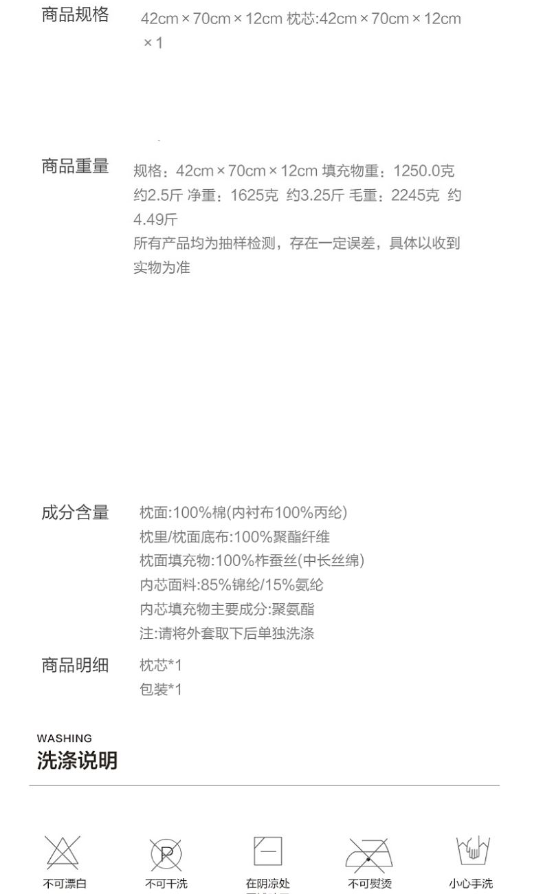 枕面材质:棉(内衬布%丙纶) 枕里/枕面底布材质:%聚酯纤维 规格:42cm*70cm*12cm 枕面填充物:%柞蚕丝(中长丝绵) 内芯材质:85%锦纶/15%氨纶 内芯填充物主要成分:聚氨酯