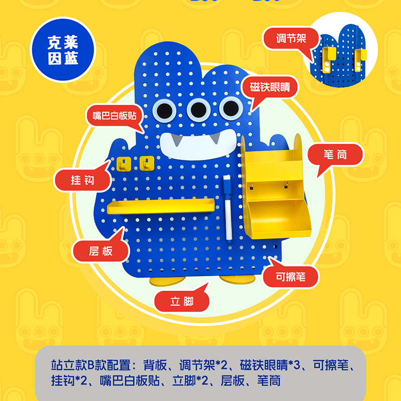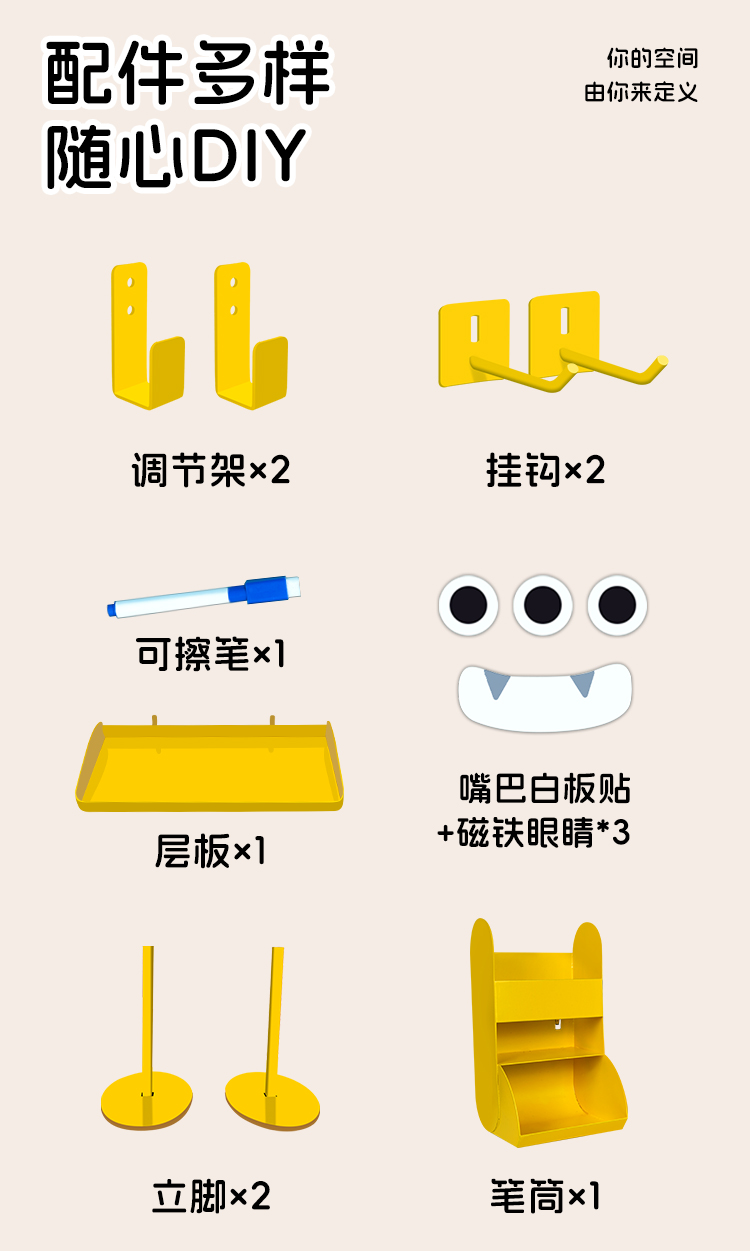 背板*1 调节架*2 磁铁眼睛*3 可擦笔*1 嘴巴白板贴*1 挂钩*2 立脚*2 层板*1