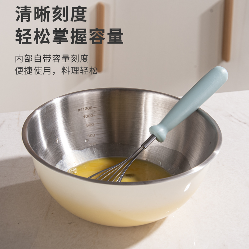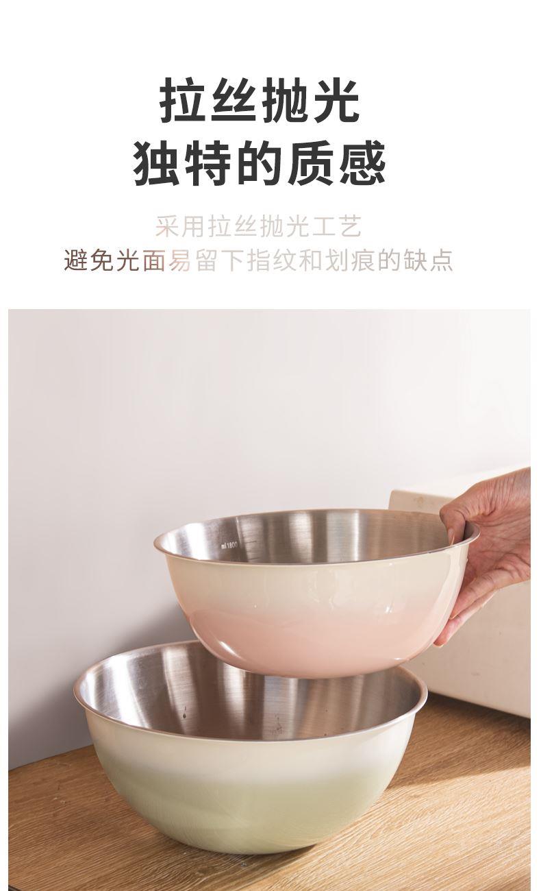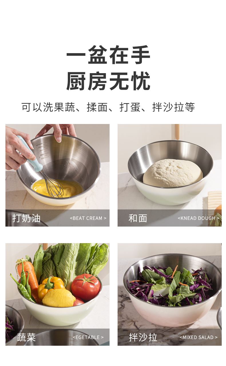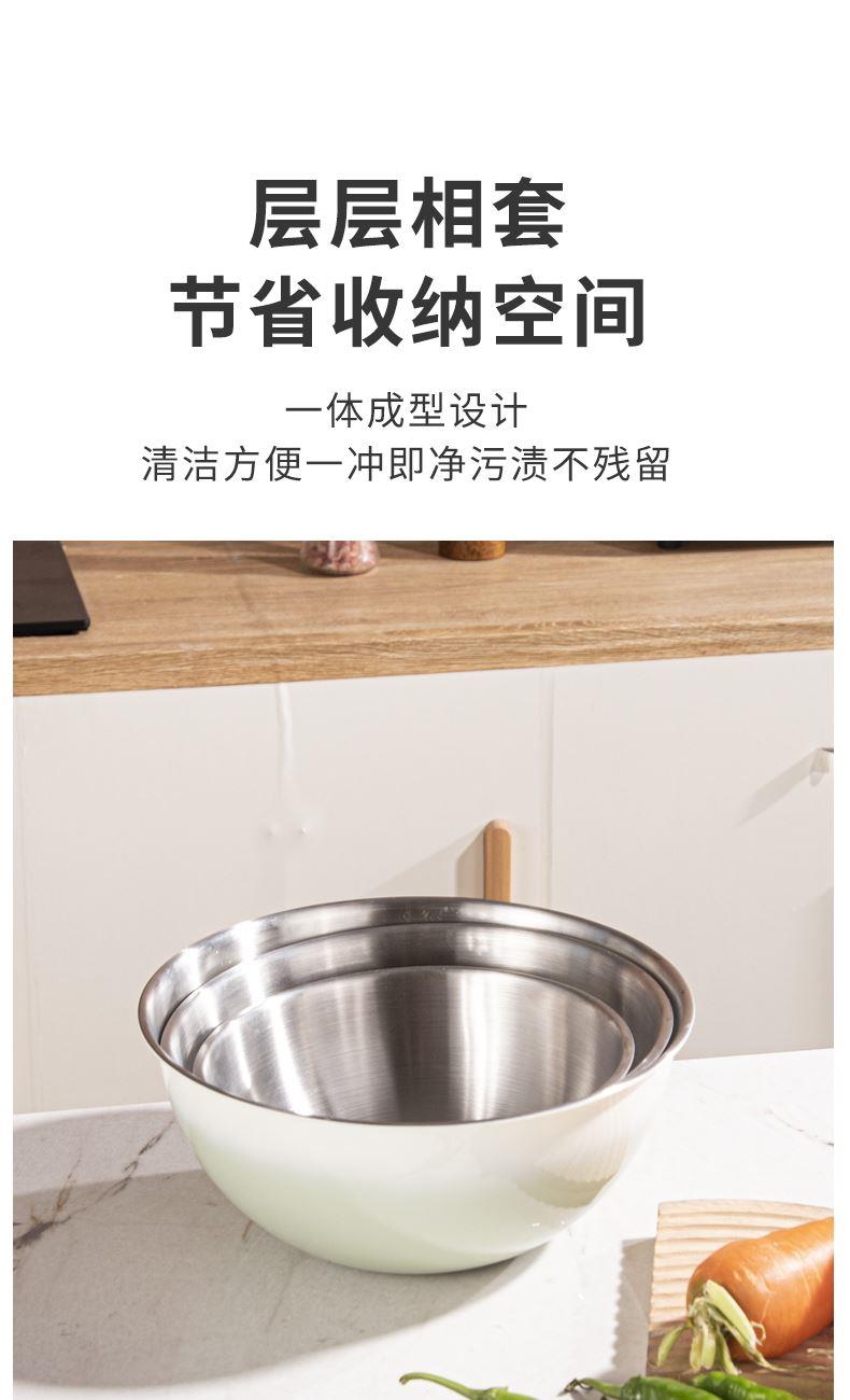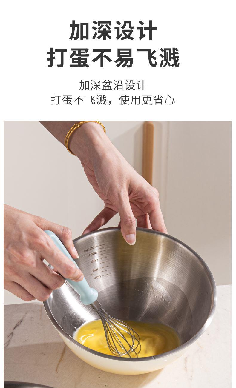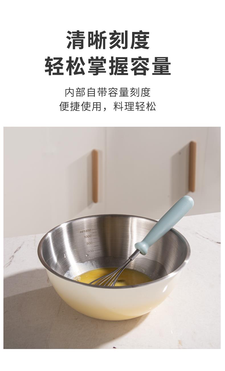 容量:1.5L+2L+3L 材质:奥氏体不锈钢(201) 包装尺寸:25.1*11*25.1cm 包装重量:0.75KG 拉丝抛光,易清洁,污渍不残留 加深设计,打蛋和面不飞溅 刻度标识,容量易掌握,控量更科学 一盆在手,厨房无忧