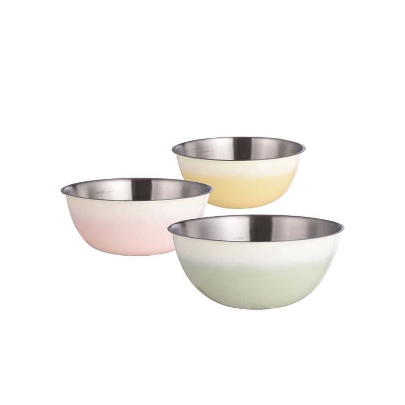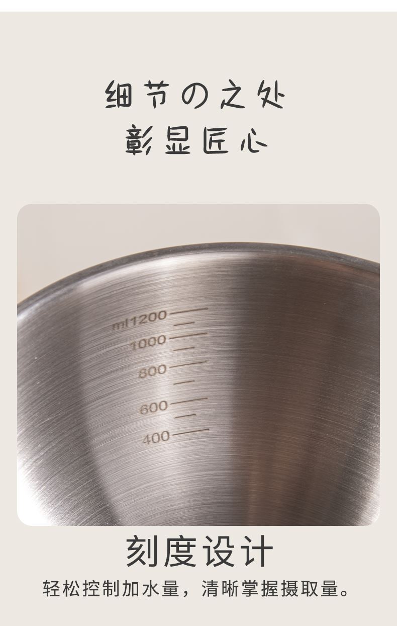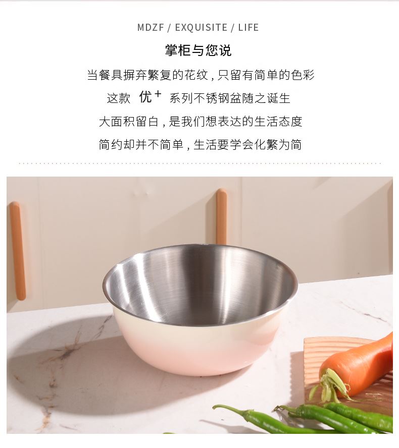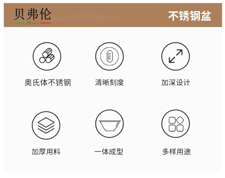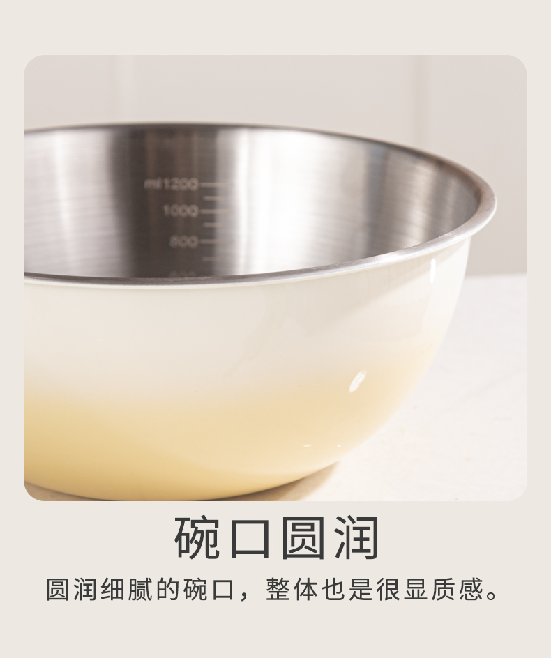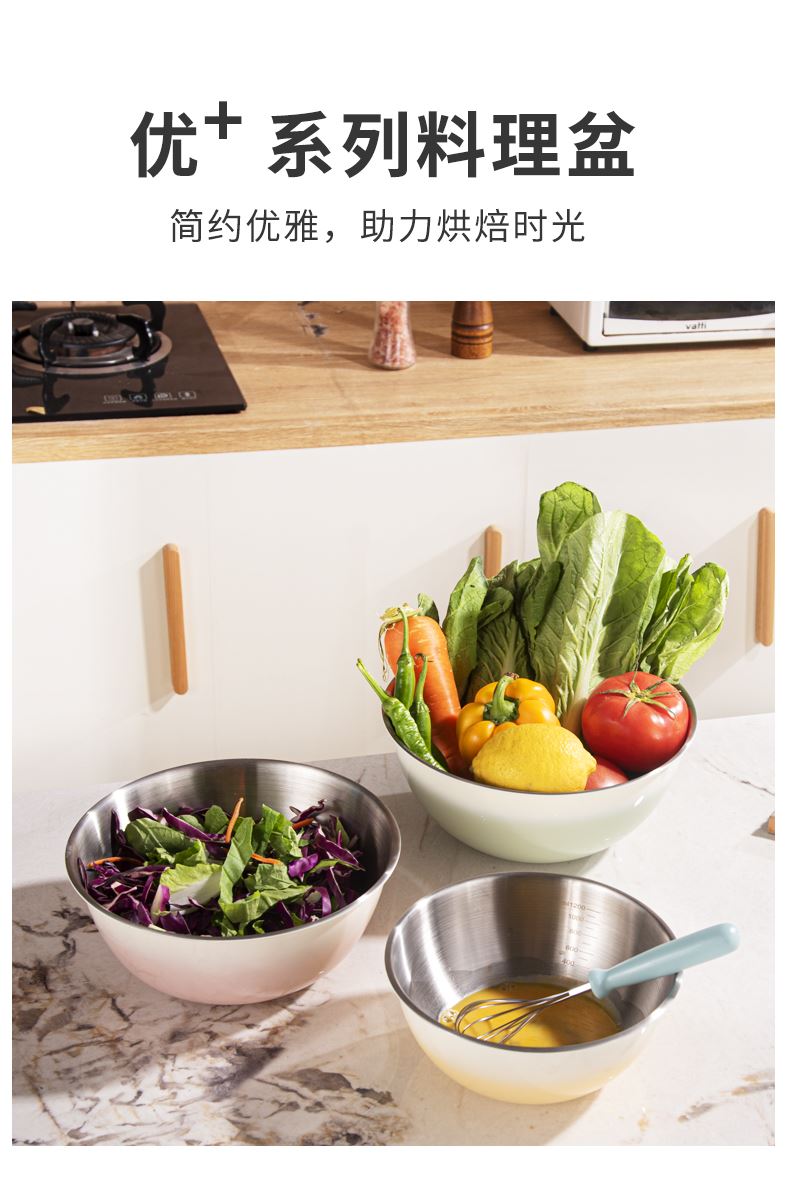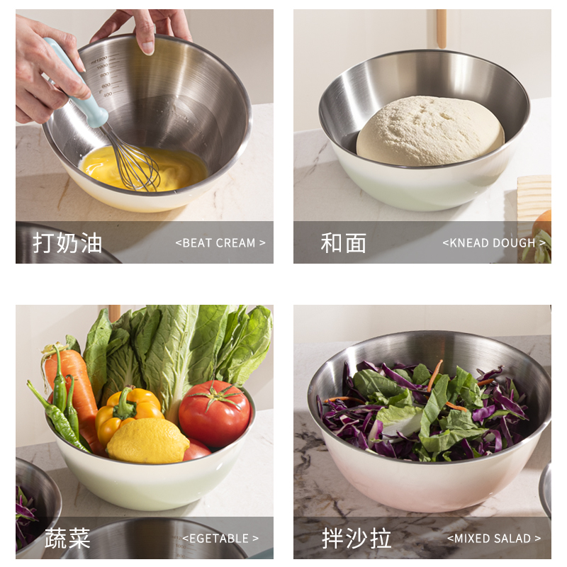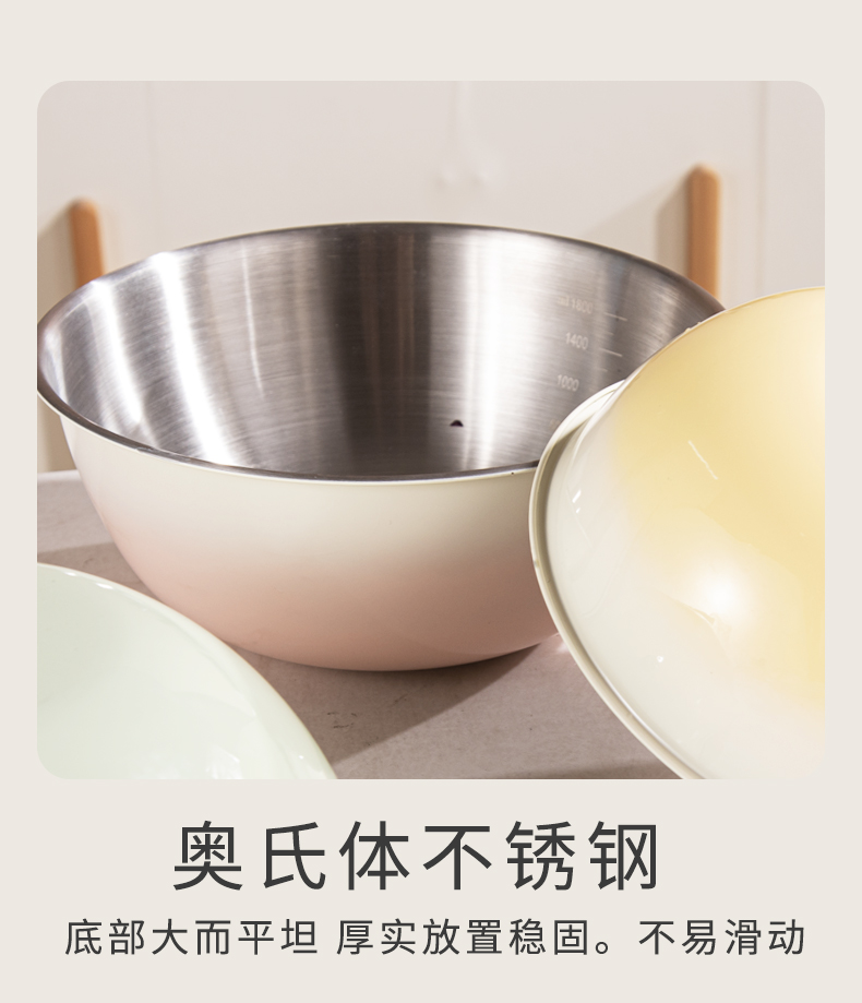 容量:1.5L+2L+3L 材质:奥氏体不锈钢(201) 包装尺寸:25.1*11*25.1cm 包装重量:0.75KG 拉丝抛光,易清洁,污渍不残留 加深设计,打蛋和面不飞溅 刻度标识,容量易掌握,控量更科学 一盆在手,厨房无忧