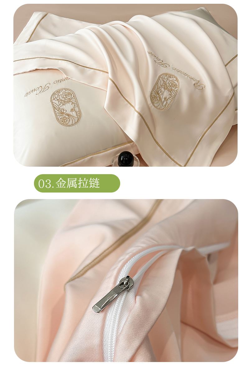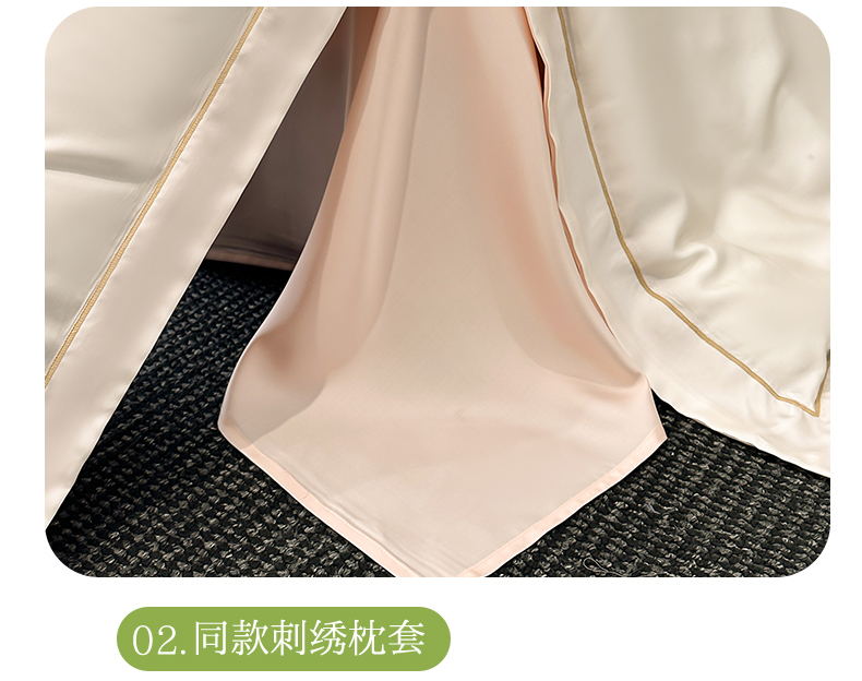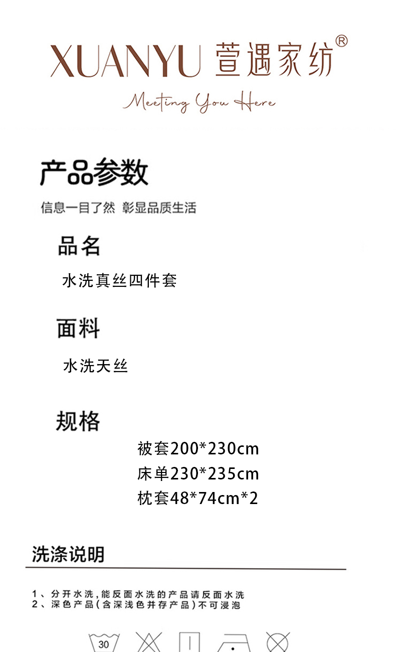 被套:200*230cm 床单:230*235cm 枕套:48*74cm*2 面料:水洗天丝 执行标准:GB/T22796-2021 安全类别:GB18401-2010 B类 1.舒适水洗真丝面料,柔软舒适亲肤贴身、不褪色。以再生纤维为原料,经过精梳工艺处理,面料手感柔软如贴身内衣,睡感舒适,透气。凉而不冰,触感舒适不粘身,有着棉的柔软与丝的冰滑,灵感加持,吸湿透气不闷热。 2.面料缩水率低,色牢度高,经洗耐用。