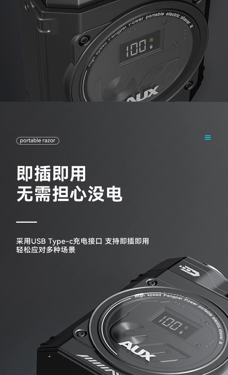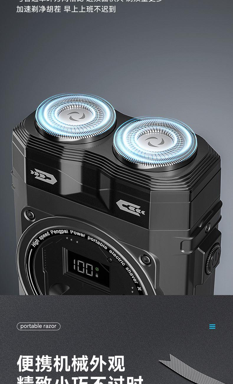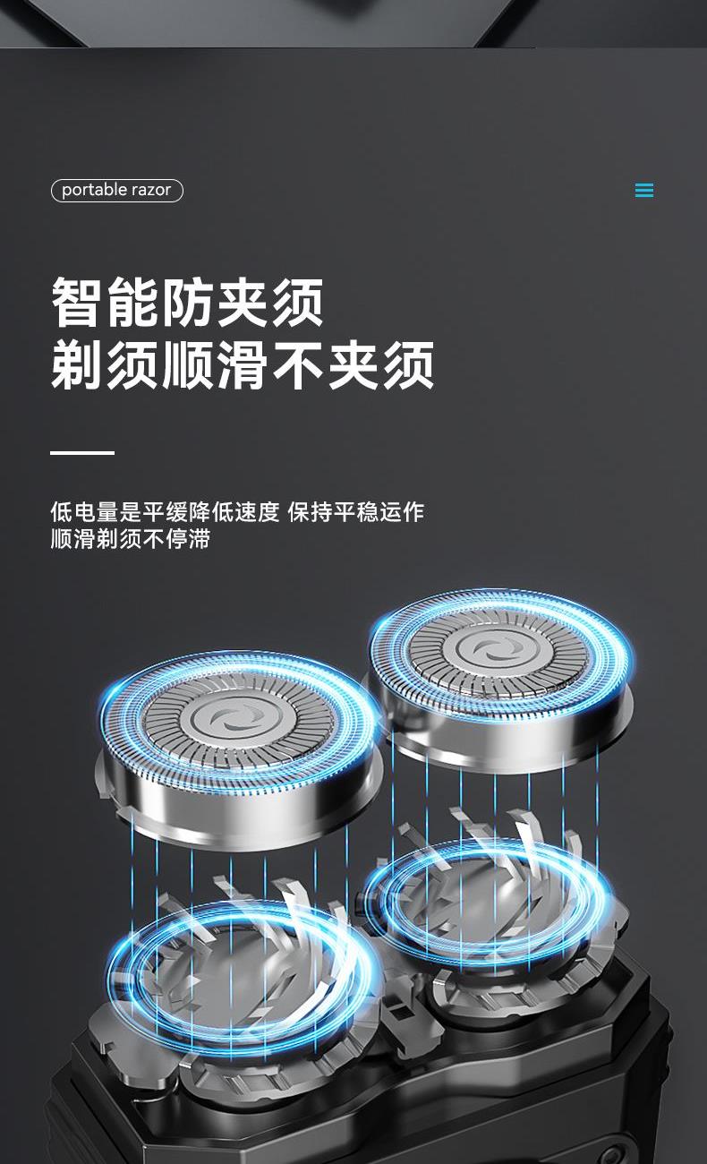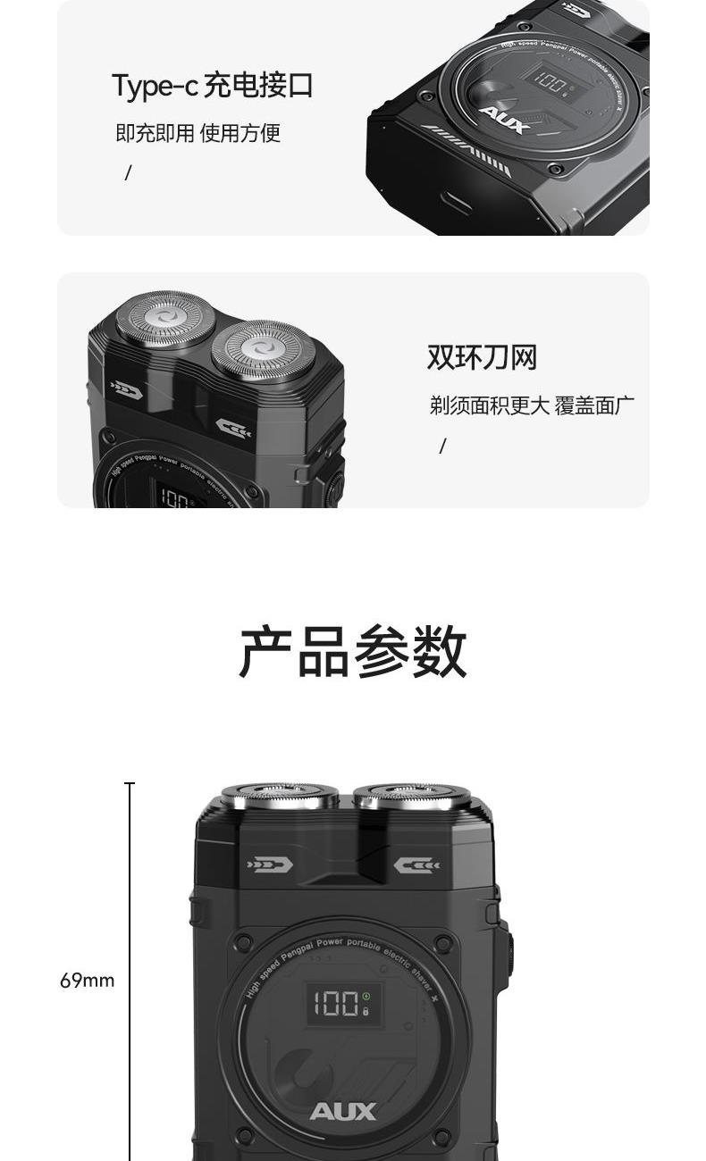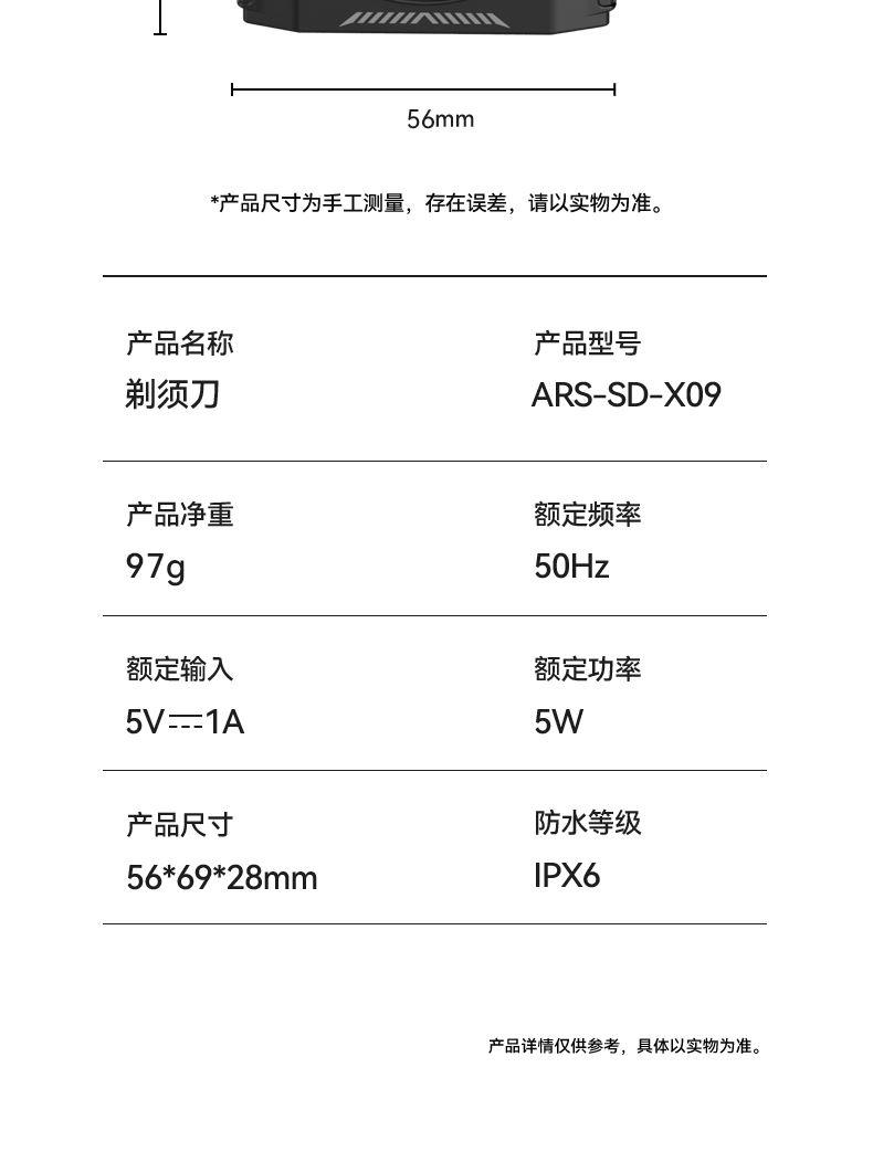 额定电压:3.7V⎓ 额定功率:5W 额定输入:5V~1A 电池容量:400mAh 防水等级:IPX6 包装清单:剃须刀,说明书,Type-C充电线,清洁刷 迷你便携,单手可握 双环浮动刀网,双倍提升进须量 TYPE-C快充,60天长效续航 IPX6级防水,机身随心洗 刀头磁吸设计,灵活好拆洗