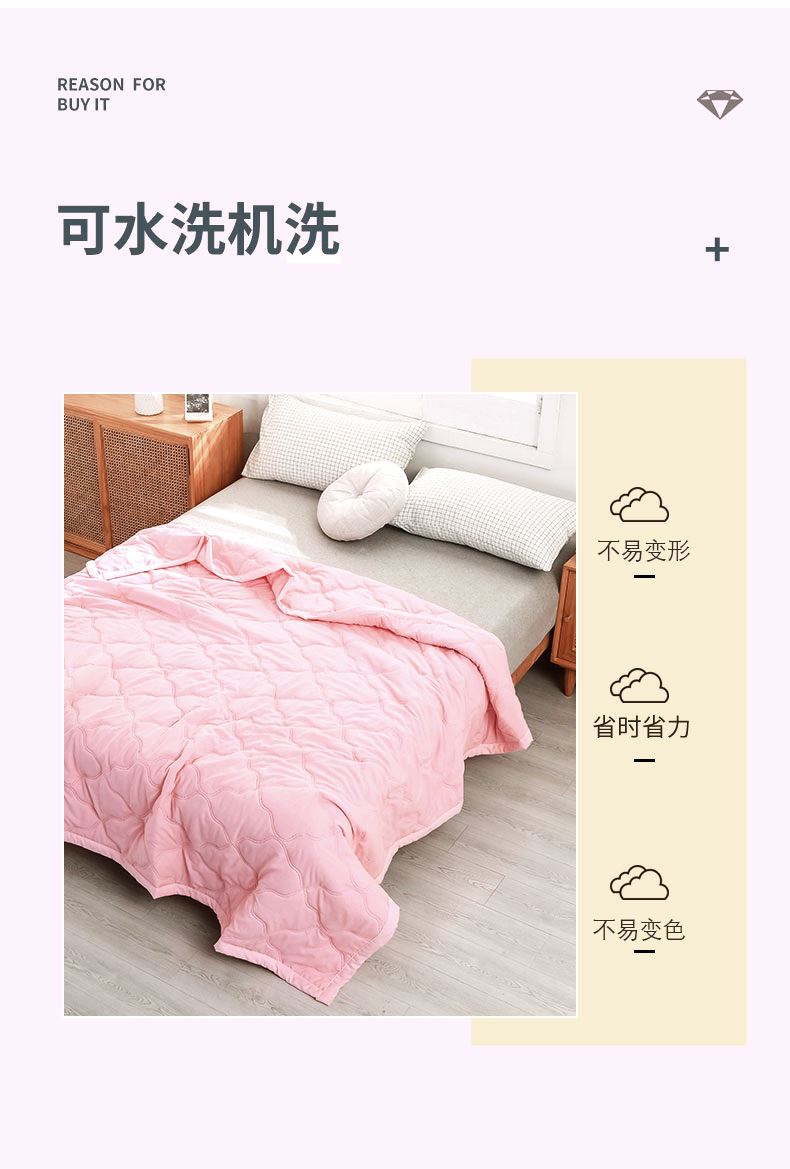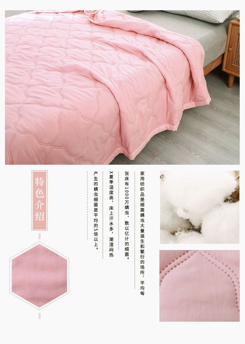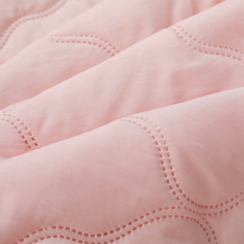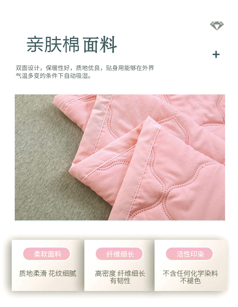 尺寸:180*200cm 面料:亲肤棉 填充:羽丝棉 填充克重:800g 执行标准:GB/T22796-2021 安全类别:GB18401-2010 B类 .1.甄选优质水洗面料,亲肤磨毛织物是一种功能性织造方式,在保留面料原有性能的同时,通过再加工,使织物表面形成一层层细腻的短绒毛层的感觉,增加了贴身接触的柔软性和亲肤性。 2.采用羽丝棉填充,柔软蓬松,亲肤性佳,回弹性优,贴身覆盖且轻盈。