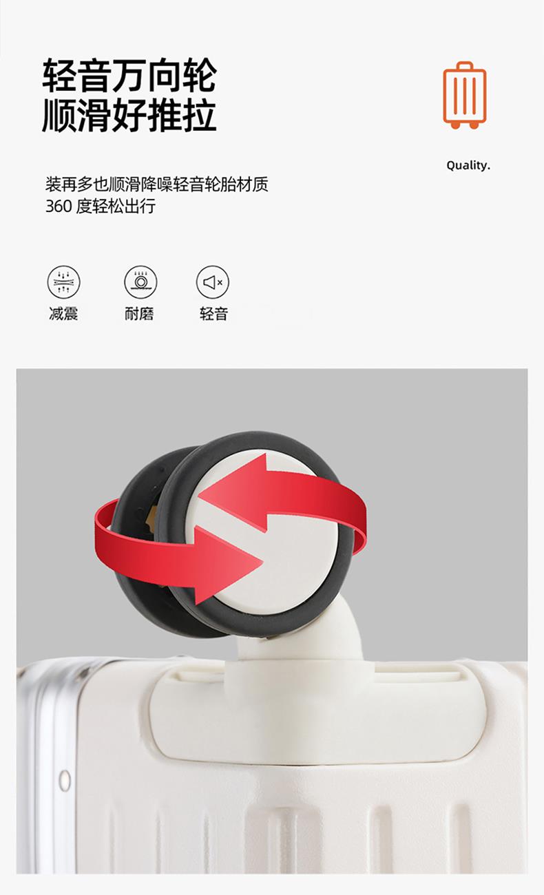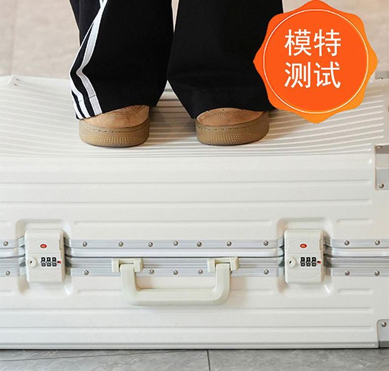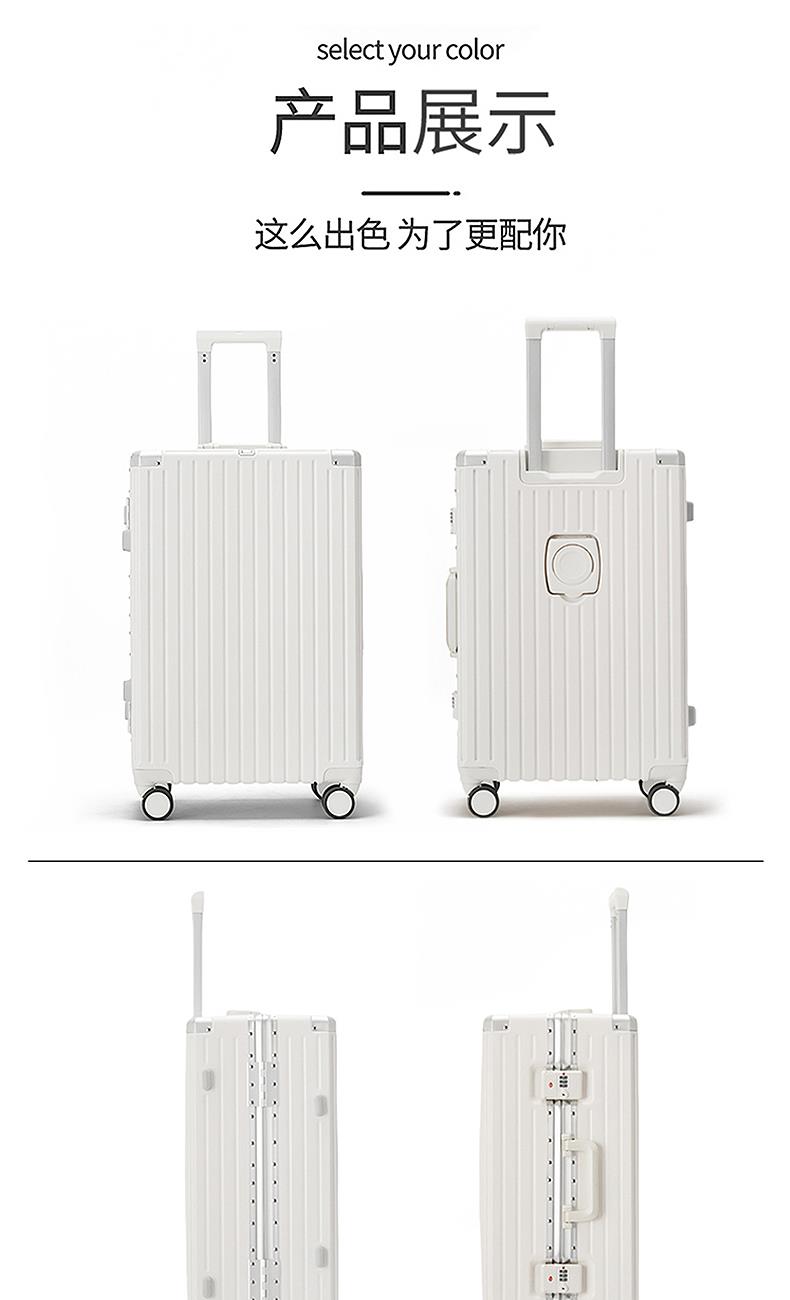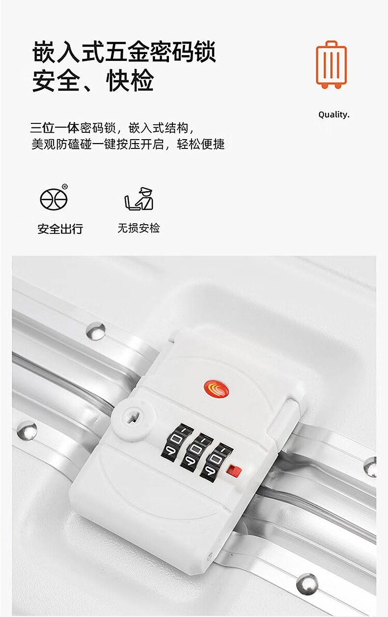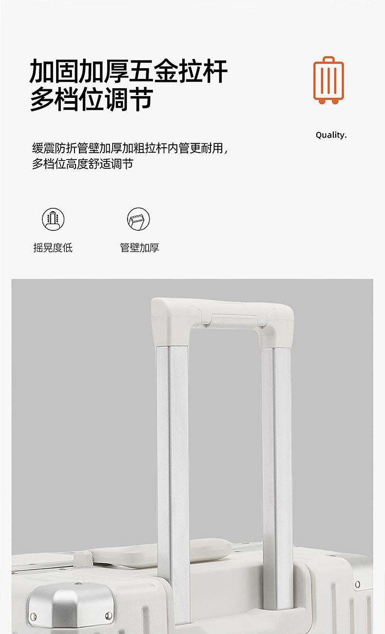型号:TJ2012 规格:20英寸 材质:ABS+PC 里料:涤纶 颜色:矿金色/白色/粉色/蓝色 等级:一等合格品 执行标准:QB/T 2155-2018 产品特点: 1、加厚ABS+PC箱体外壳及铝框和合页,防刮坚固,耐磨防爆;2、加厚合金伸缩拉杆,稳固顺畅,握手处带手机支架功能,方便实用;3、带慢回弹顶部和侧部提手,竖提横提都方便;4、侧部顶脚及前部带方便行李挂架功能;5、干湿分离,分区合理;6、双嵌入式三码密码锁,安全性高,放心旅行;7、双排TPE万向静音飞机轮,高承重,肆意而行;8、防撞金属包角,美观大方,时尚有质感。