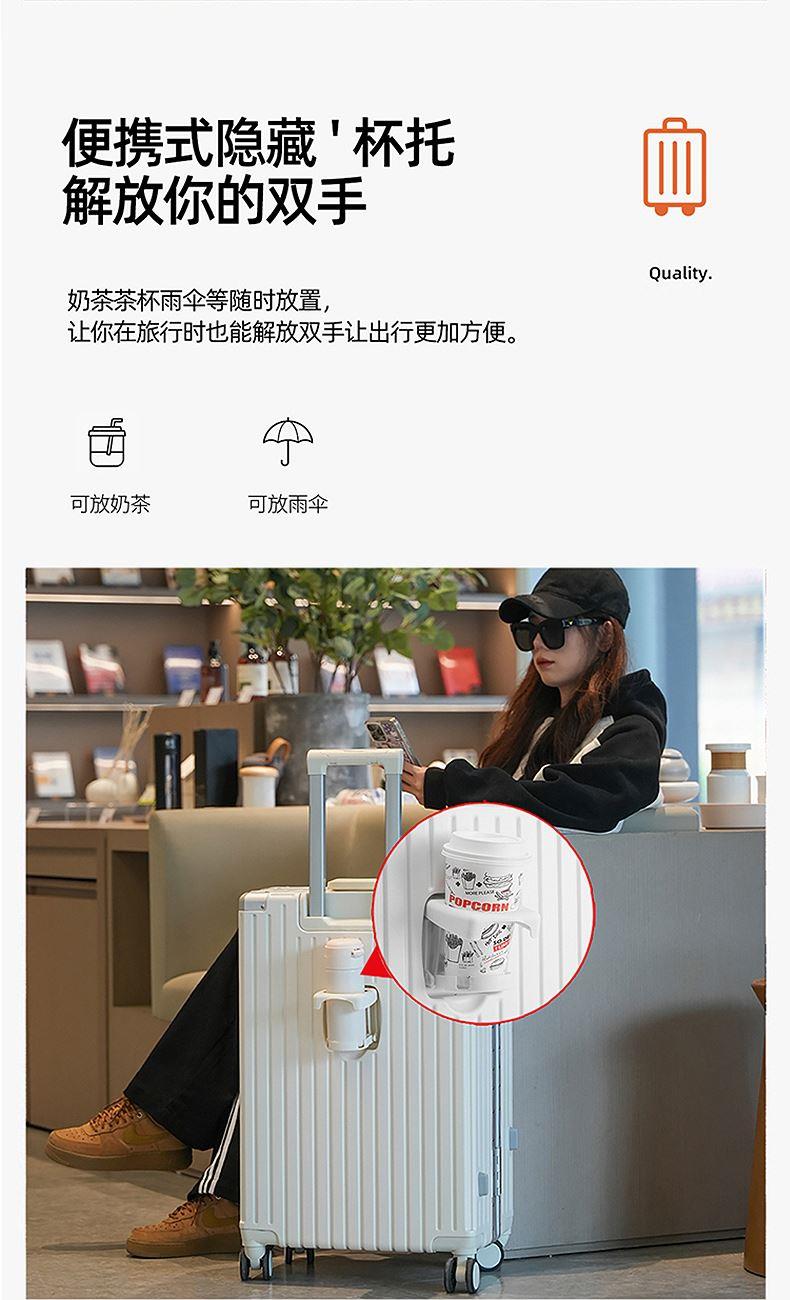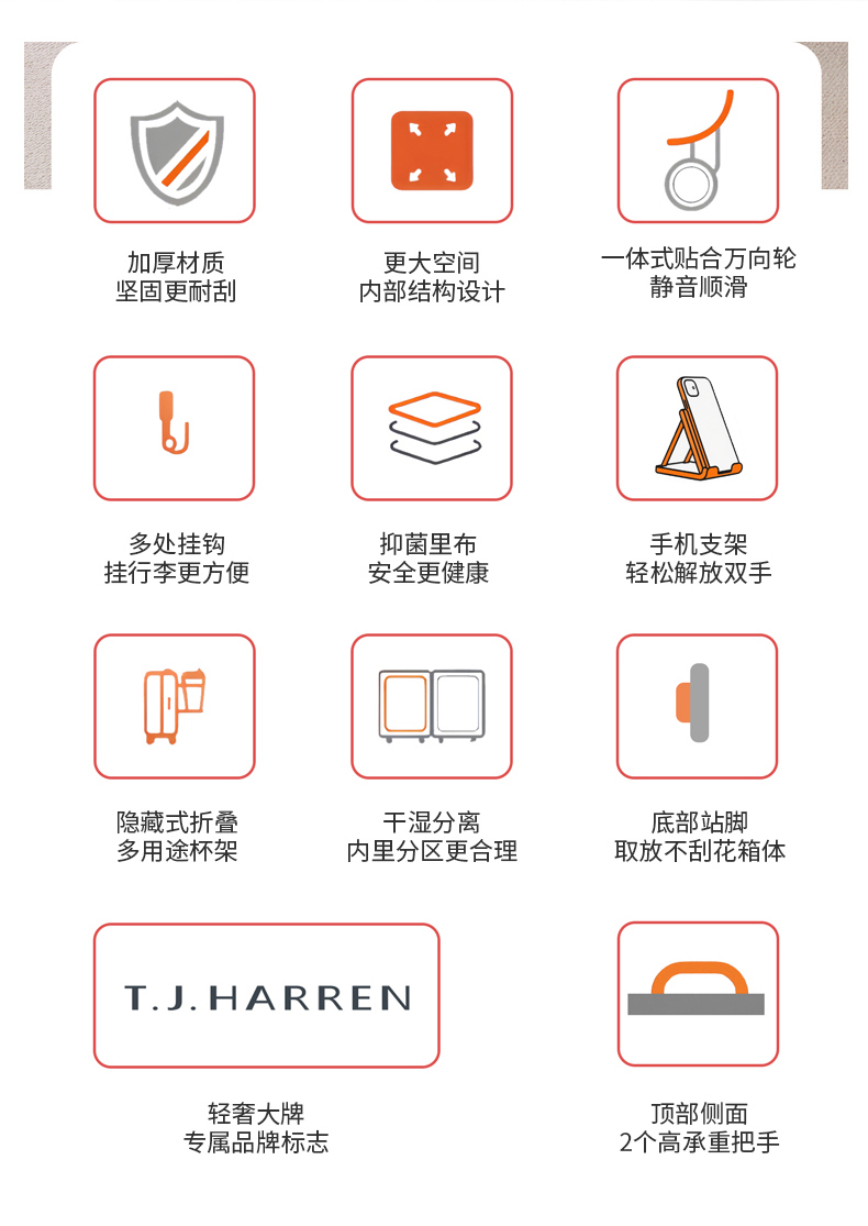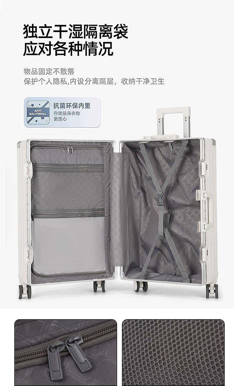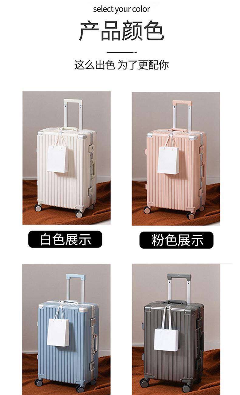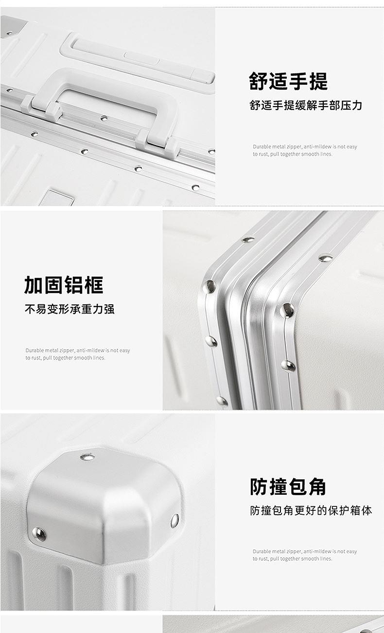 型号:TJ2012 规格:20英寸 材质:ABS+PC 里料:涤纶 颜色:矿金色/白色/粉色/蓝色 等级:一等合格品 执行标准:QB/T 2155-2018 产品特点: 1、加厚ABS+PC箱体外壳及铝框和合页,防刮坚固,耐磨防爆;2、加厚合金伸缩拉杆,稳固顺畅,握手处带手机支架功能,方便实用;3、带慢回弹顶部和侧部提手,竖提横提都方便;4、侧部顶脚及前部带方便行李挂架功能;5、干湿分离,分区合理;6、双嵌入式三码密码锁,安全性高,放心旅行;7、双排TPE万向静音飞机轮,高承重,肆意而行;8、防撞金属包角,美观大方,时尚有质感。
