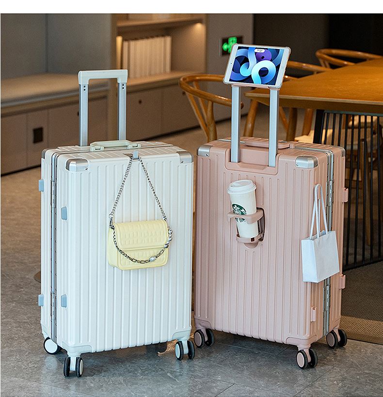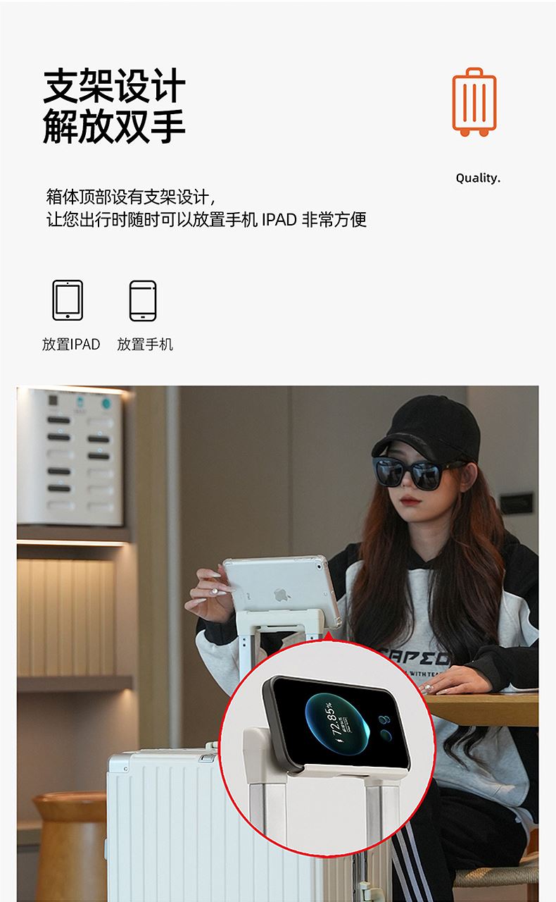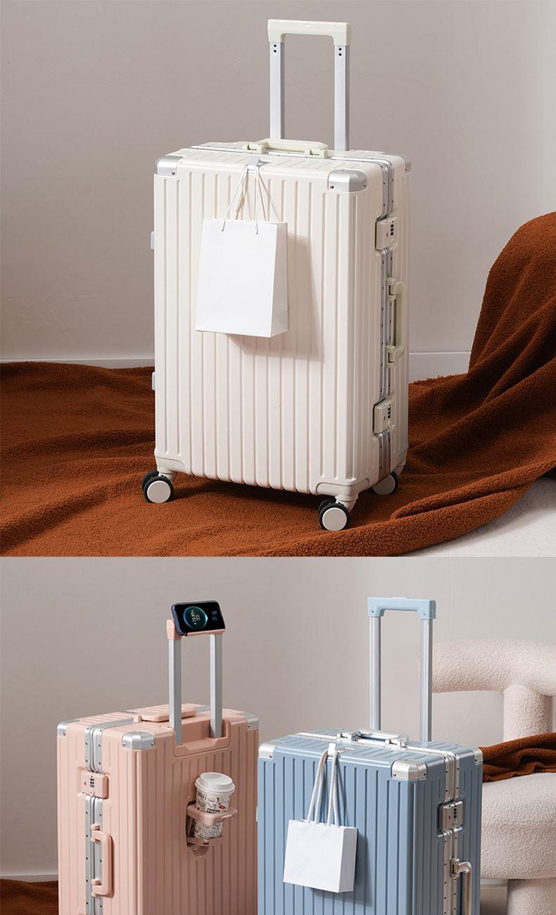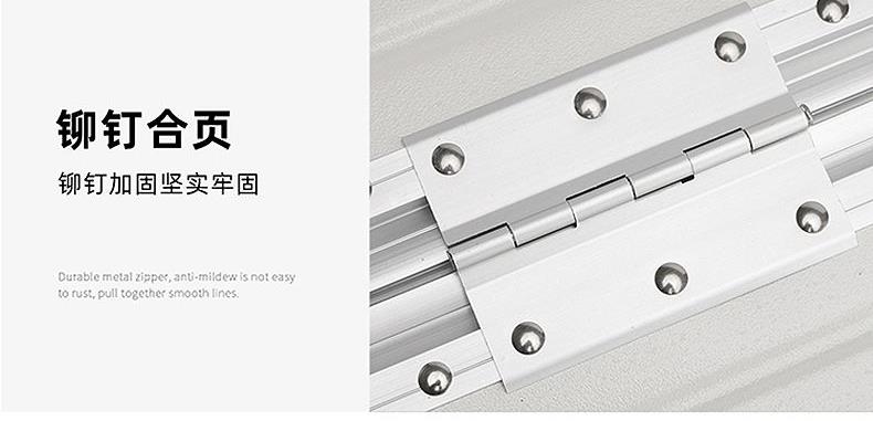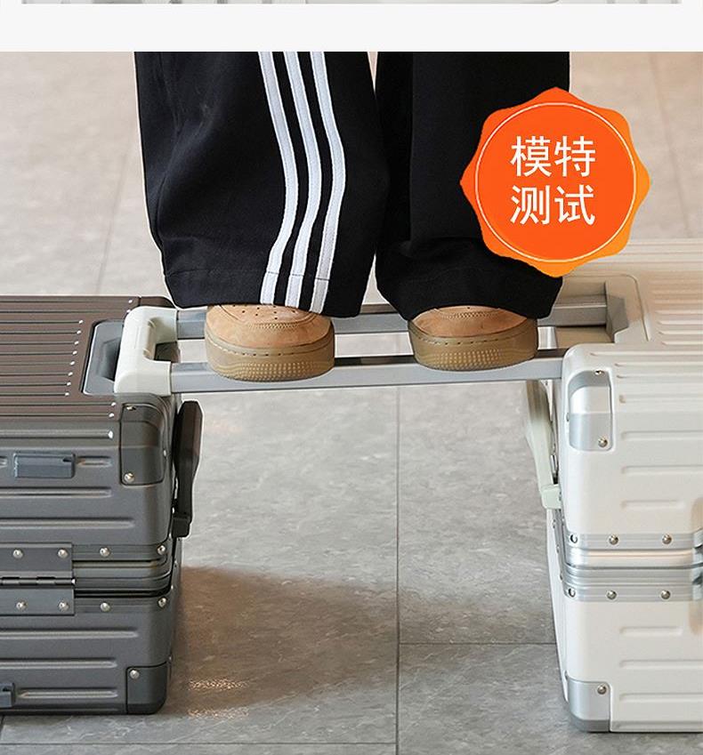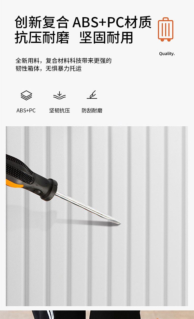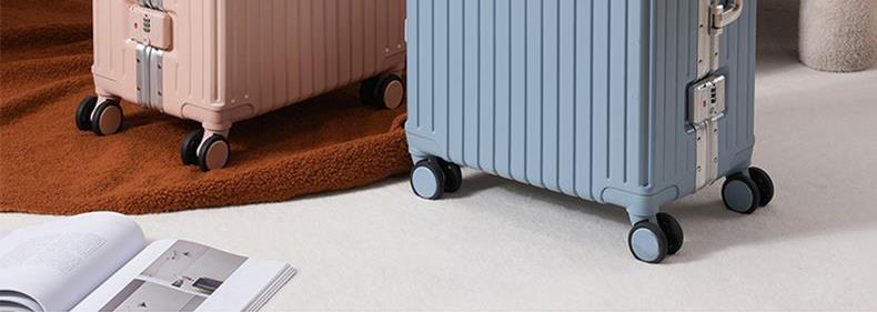 型号:TJ2012 规格:20英寸 材质:ABS+PC 里料:涤纶 颜色:矿金色/白色/粉色/蓝色 等级:一等合格品 执行标准:QB/T 2155-2018 产品特点: 1、加厚ABS+PC箱体外壳及铝框和合页,防刮坚固,耐磨防爆;2、加厚合金伸缩拉杆,稳固顺畅,握手处带手机支架功能,方便实用;3、带慢回弹顶部和侧部提手,竖提横提都方便;4、侧部顶脚及前部带方便行李挂架功能;5、干湿分离,分区合理;6、双嵌入式三码密码锁,安全性高,放心旅行;7、双排TPE万向静音飞机轮,高承重,肆意而行;8、防撞金属包角,美观大方,时尚有质感。