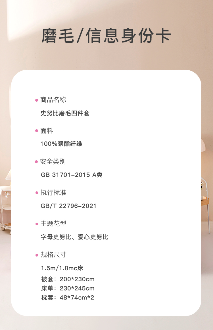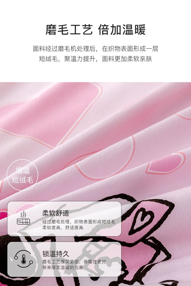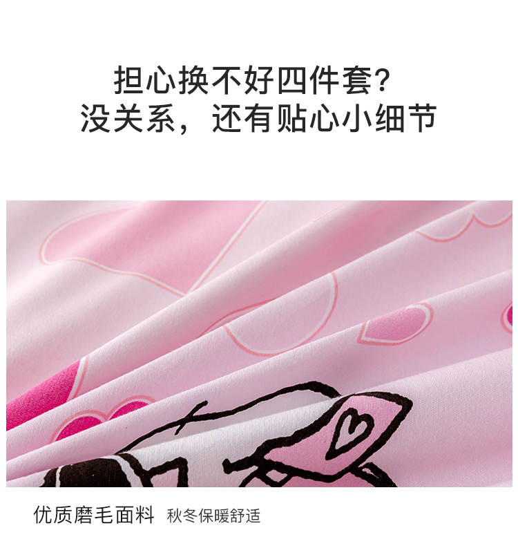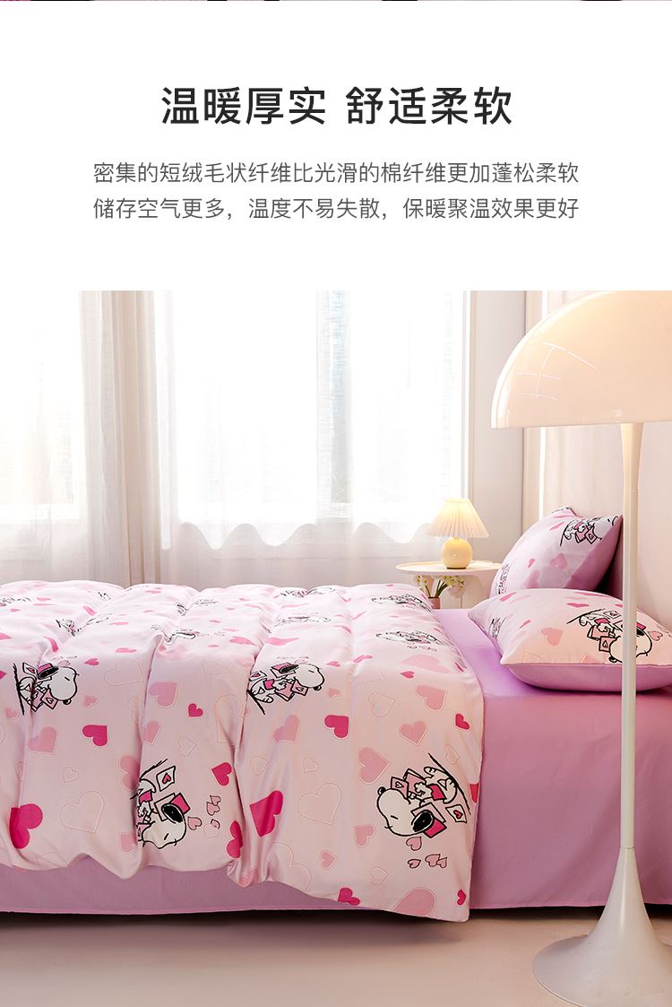 四件套:200*230cm(被套1床单1枕套2) 商品货号:STJ21 商品面料:聚酯纤维 商品颜色:字母史努比、爱心史努比 面料柔软密实 轻磨毛工艺 形成短毛绒层 瞬间提升接触暖感 细腻透气 柔软亲肤 活性印染 安全健康 不易掉色 AB版设计 一套两用 性价比高 多种卡通花型 多种选择 加厚设计 棉质触感 经久耐用 被角绑带 不易跑偏 舒心安睡