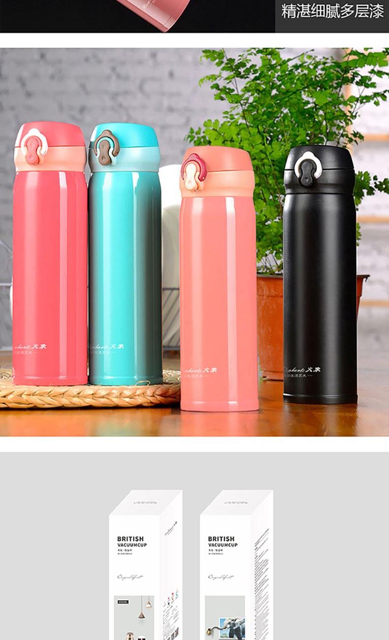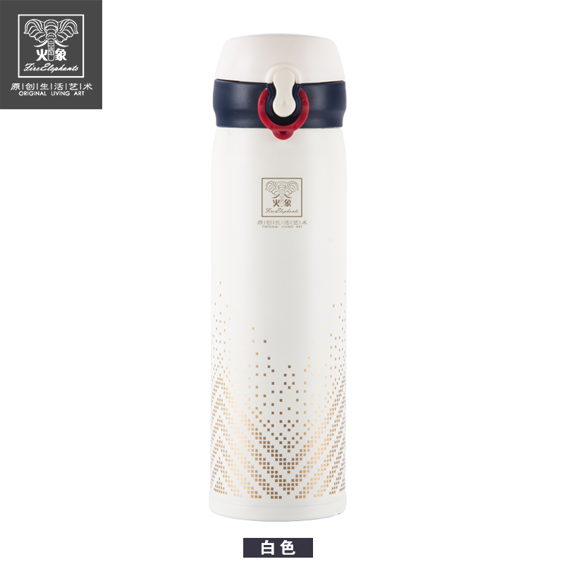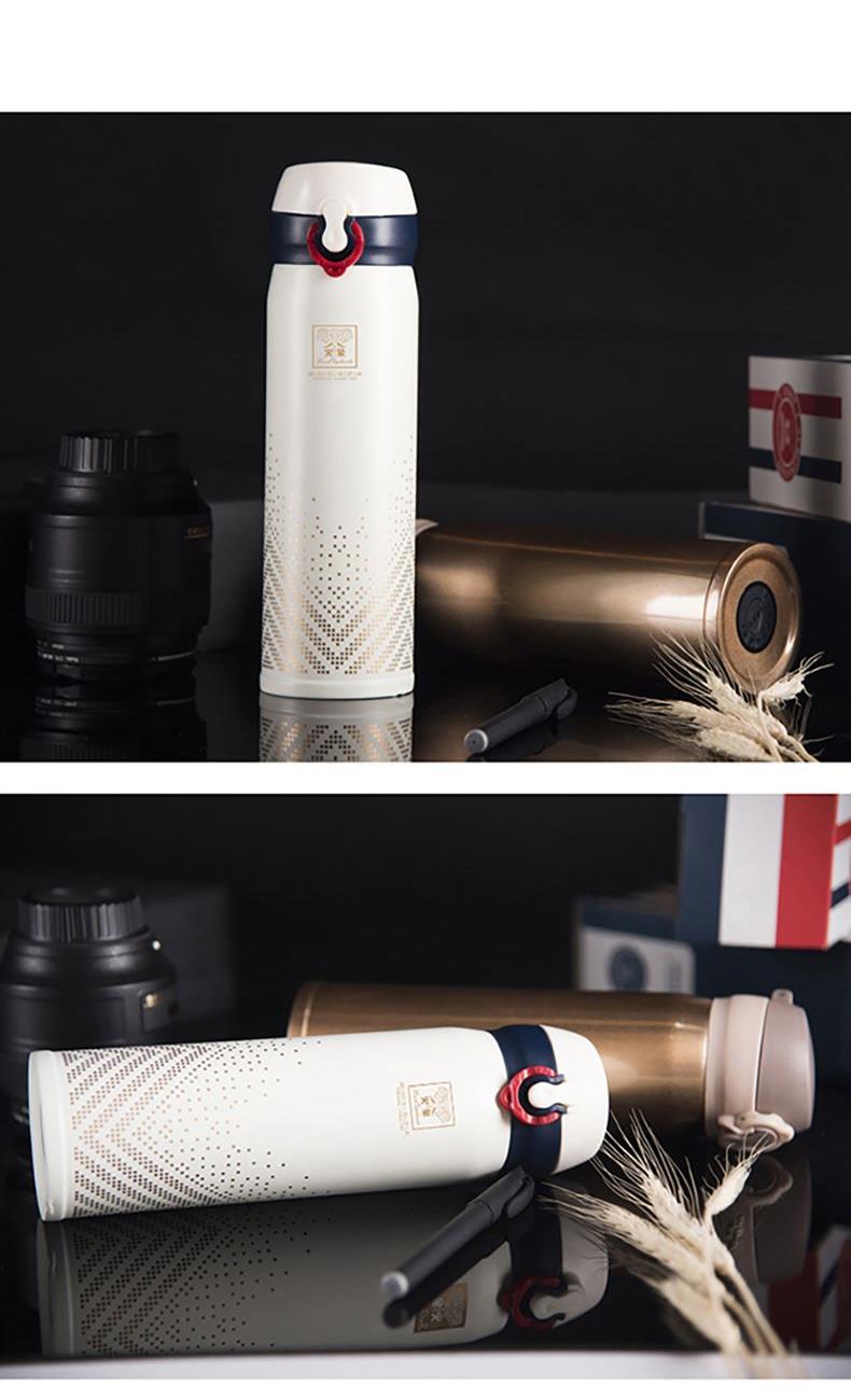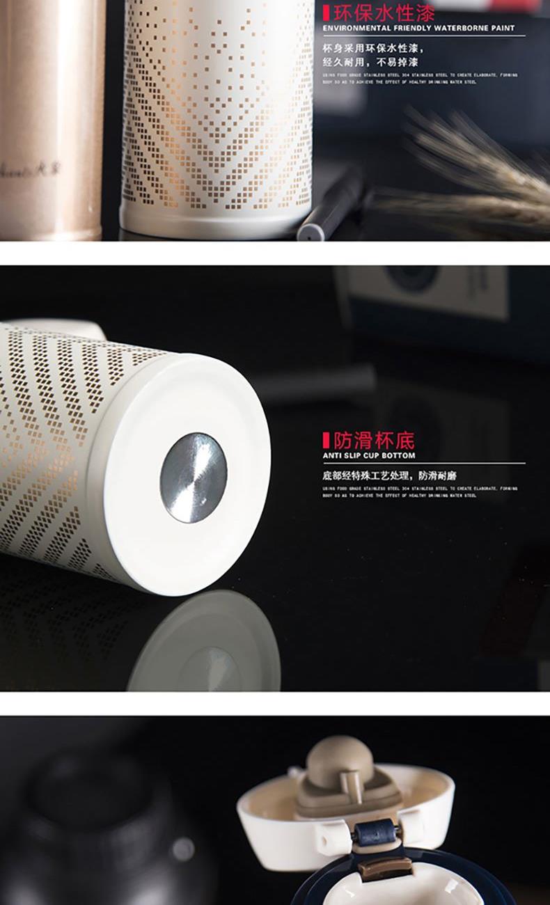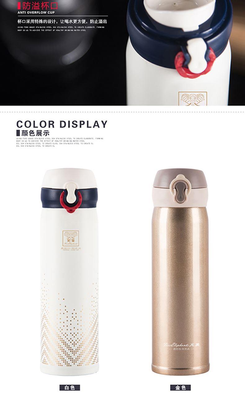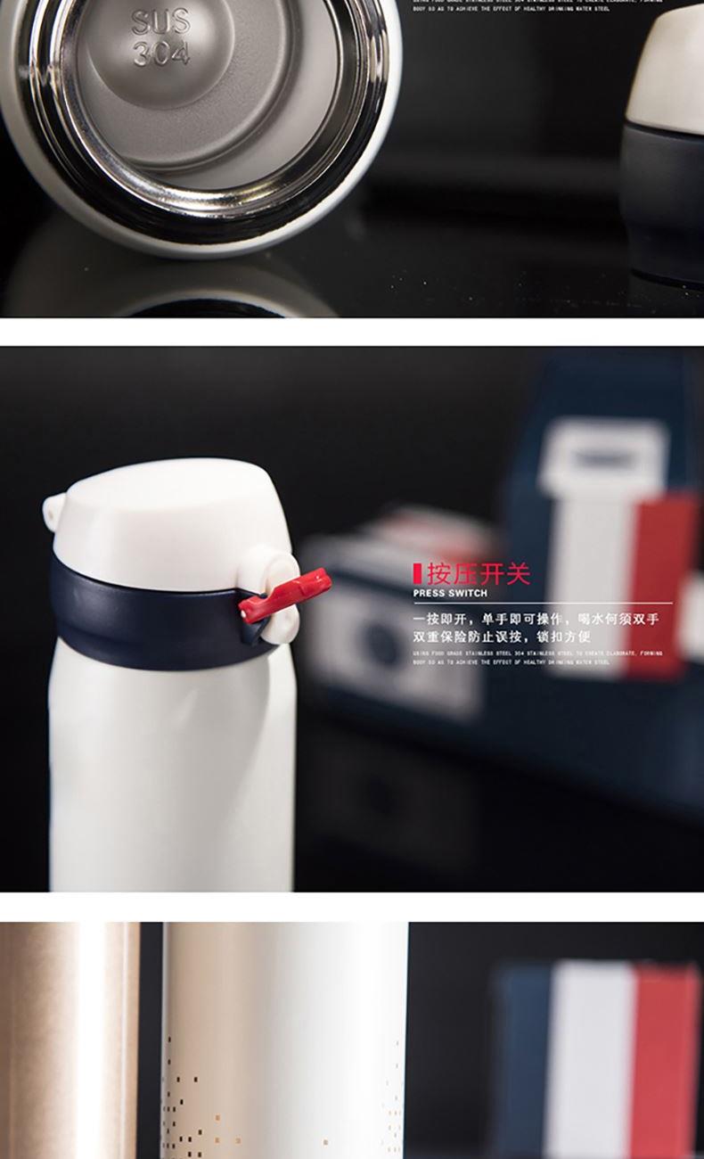 产品规格:450ML 产品材质:SUS304不锈钢 产品颜色:白色 (香槟金可定制) 彩盒尺寸:L70*W70*H235MM 外箱尺寸:L73xW37xH26CM 1、外观英伦风格设计,金色星点图案,彰显欧洲皇室风范。 2、内胆采用SUS304食品级不锈钢打造,健康安全。 3、杯盖采用一键式弹跳设计,方便实用。