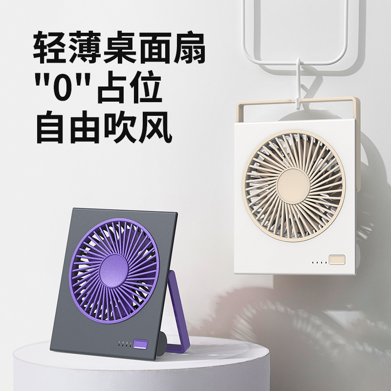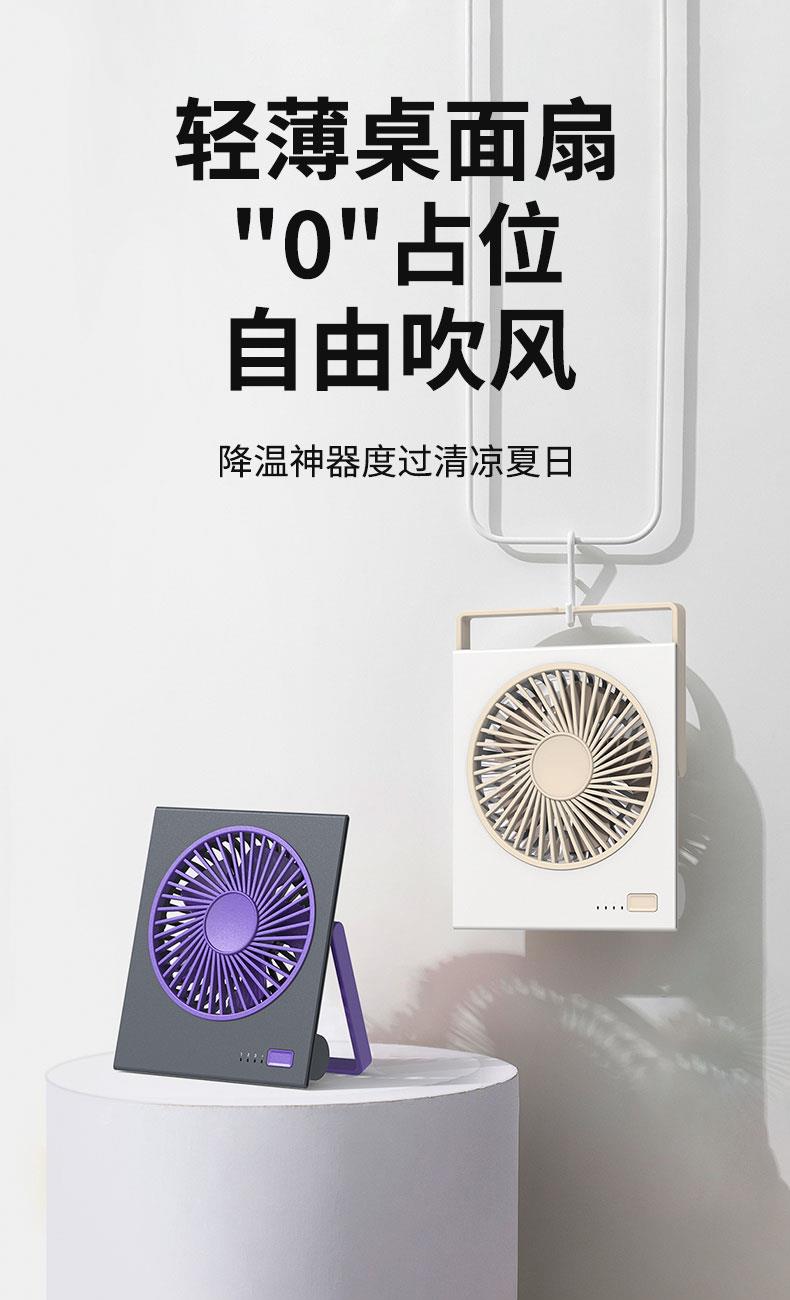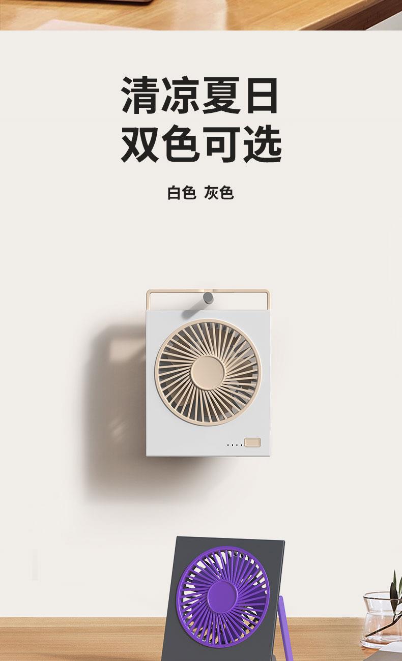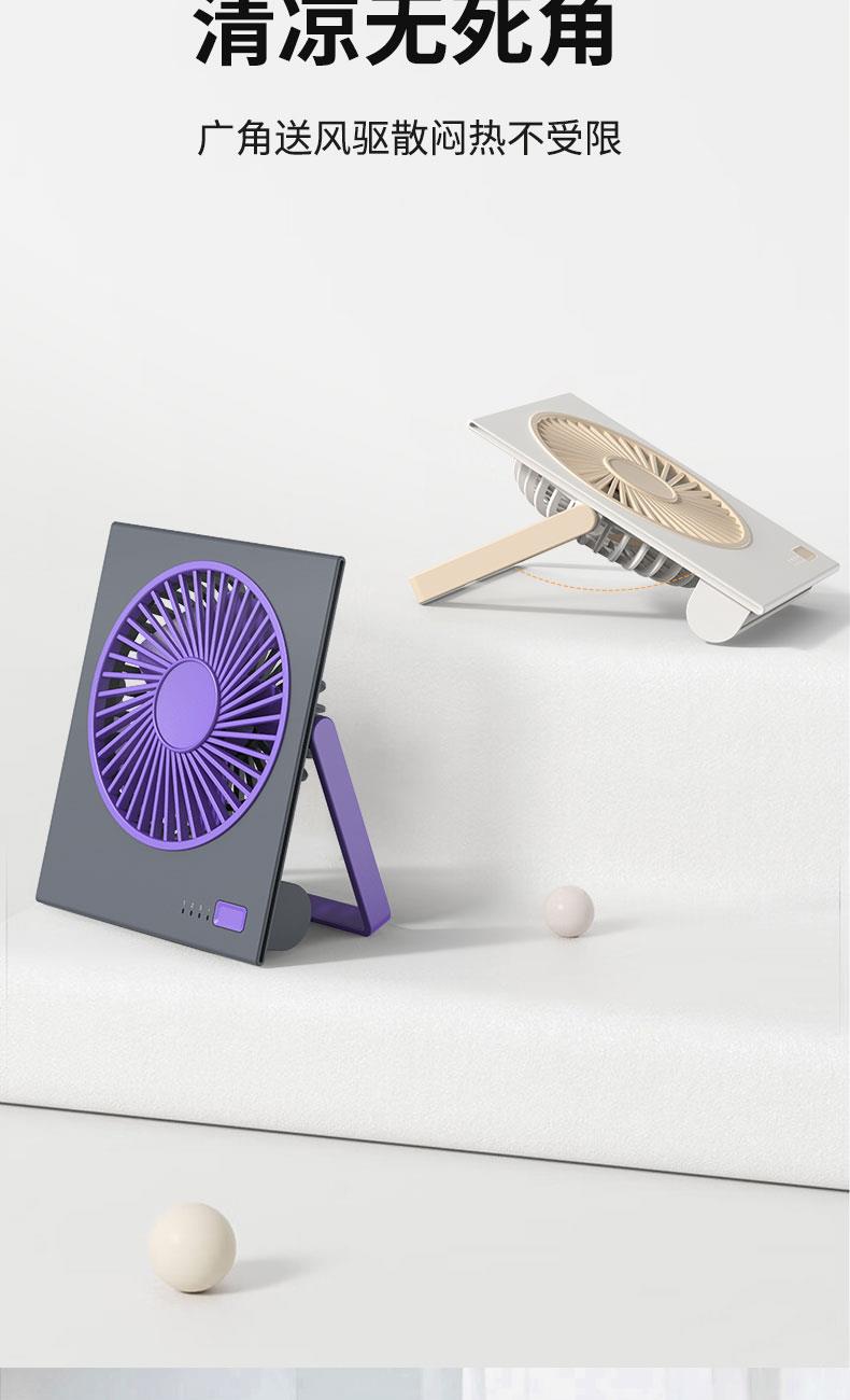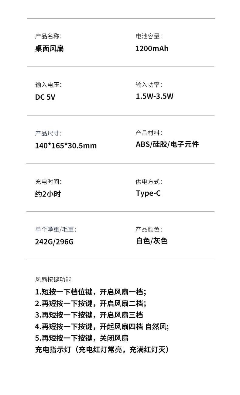 *角度可手动调节、时尚风格 *三档风力、电池1200毫安 *轻薄便携、可挂可立 *材质:ABS+电子元件 *产品尺寸:140*165*30.5mm *产品重量:242g/296g *包装盒:144**36*169mm *外箱尺寸:45*39.5*35cm *整箱重量:17.8kg/18.6kg *颜色:白色/灰紫色 *标配:风扇*1 usb电源线*1 说明书*1