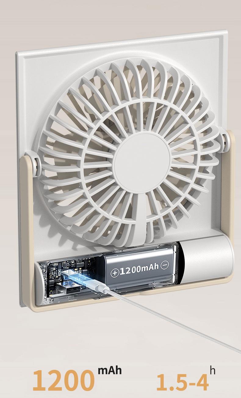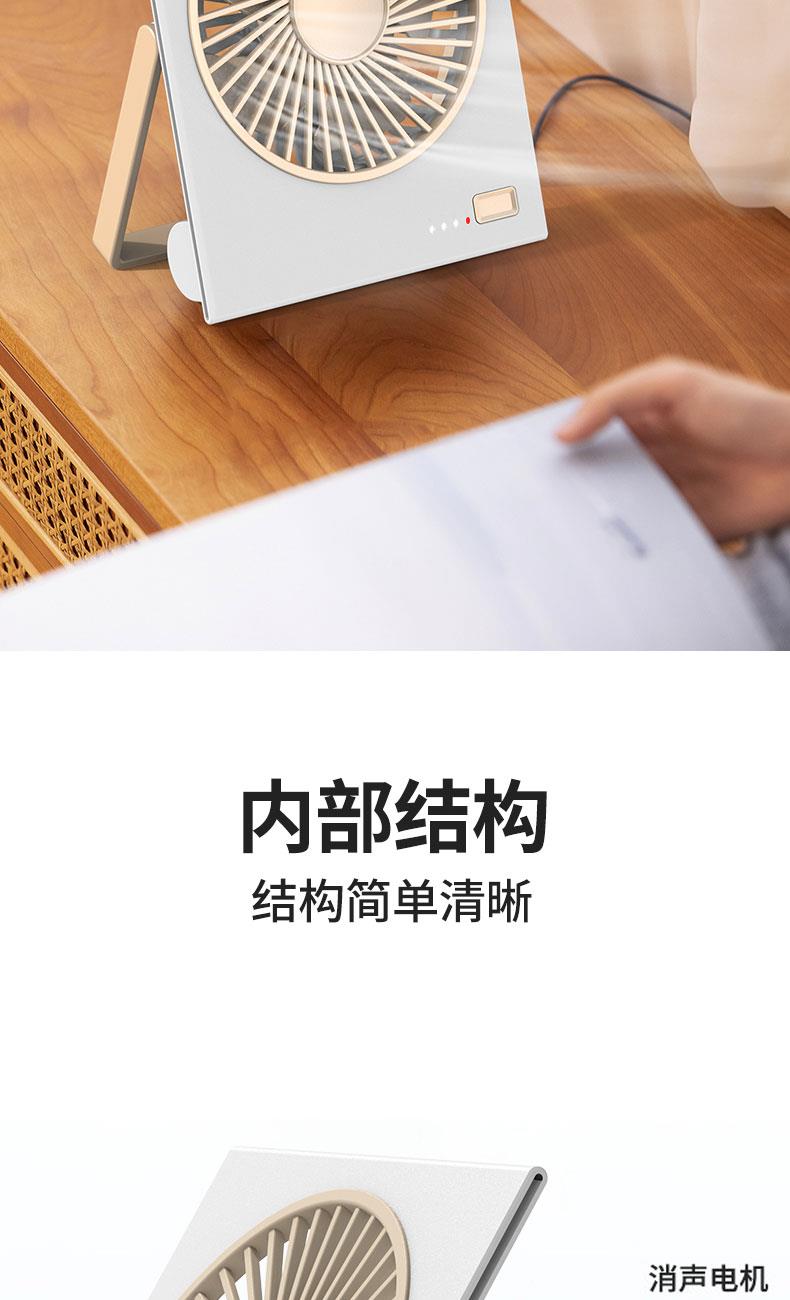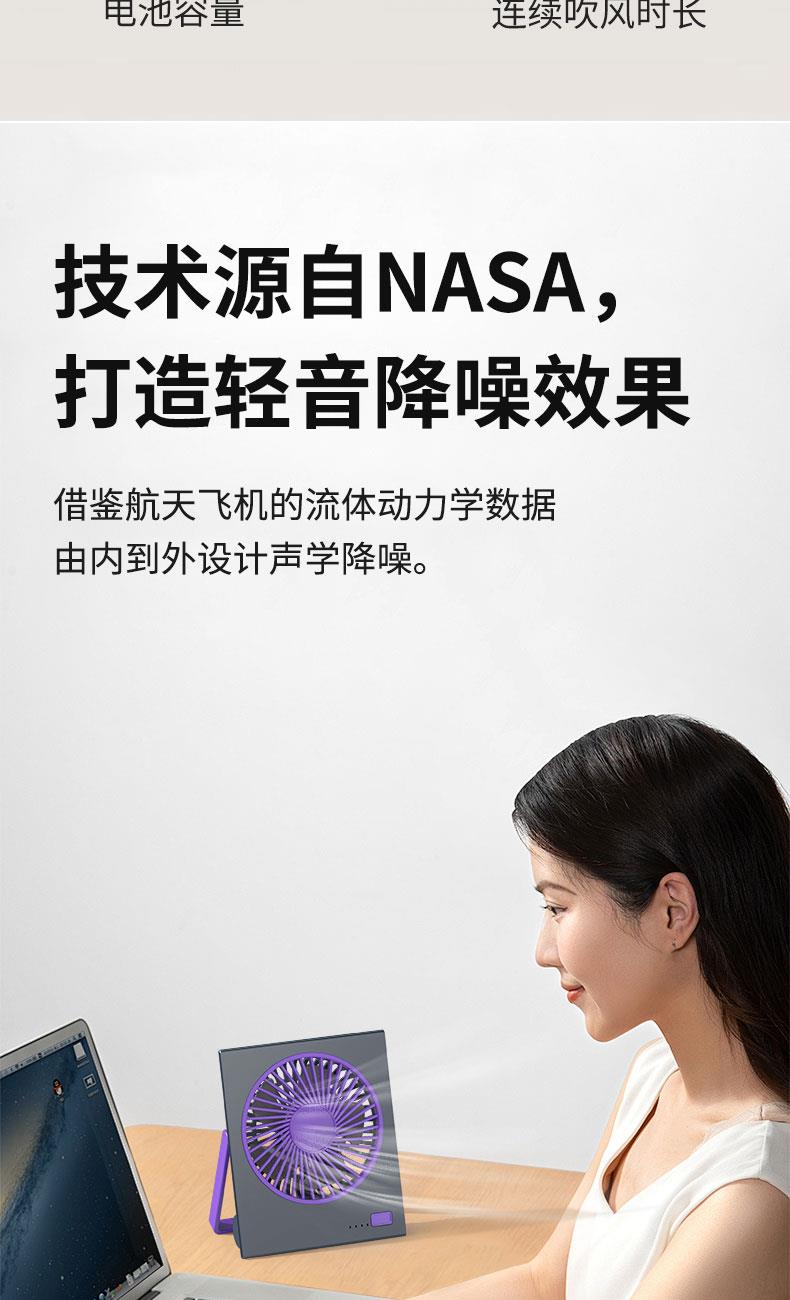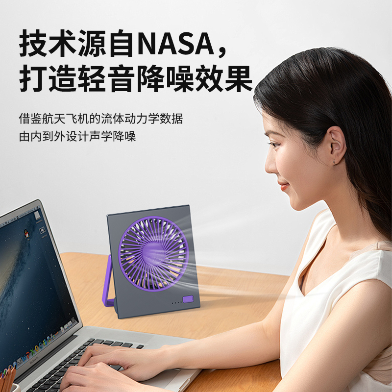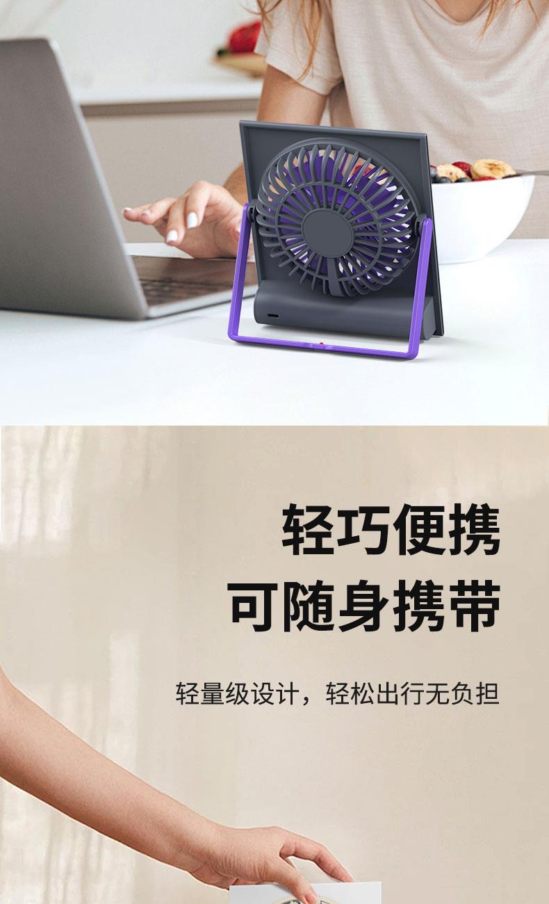 *角度可手动调节、时尚风格 *三档风力、电池1200毫安 *轻薄便携、可挂可立 *材质:ABS+电子元件 *产品尺寸:140*165*30.5mm *产品重量:242g/296g *包装盒:144**36*169mm *外箱尺寸:45*39.5*35cm *整箱重量:17.8kg/18.6kg *颜色:白色/灰紫色 *标配:风扇*1 usb电源线*1 说明书*1