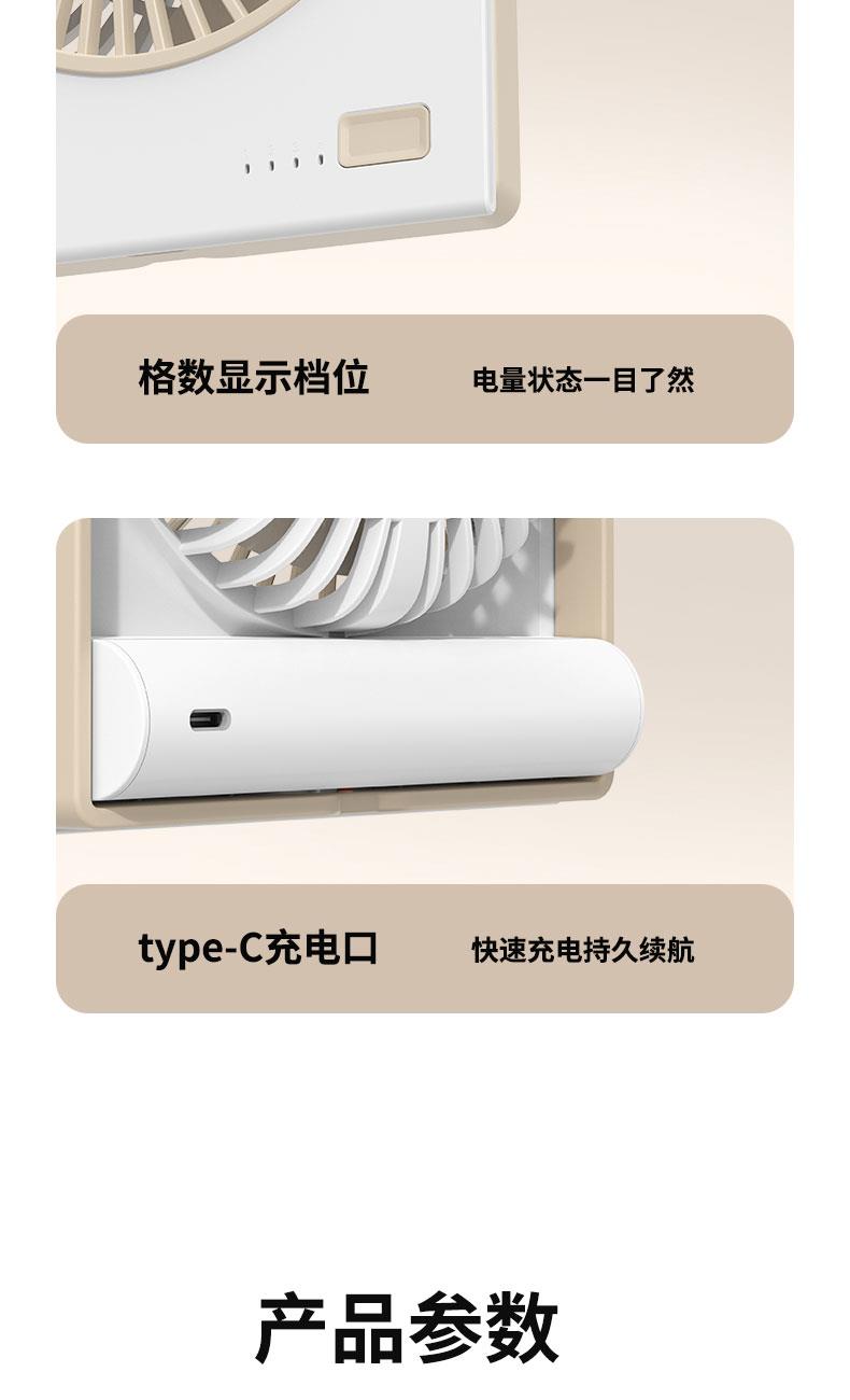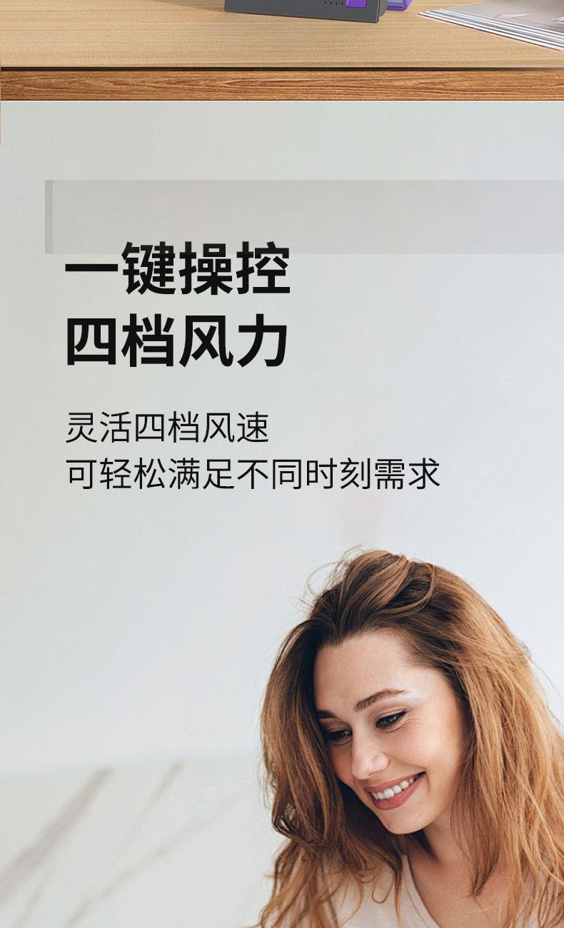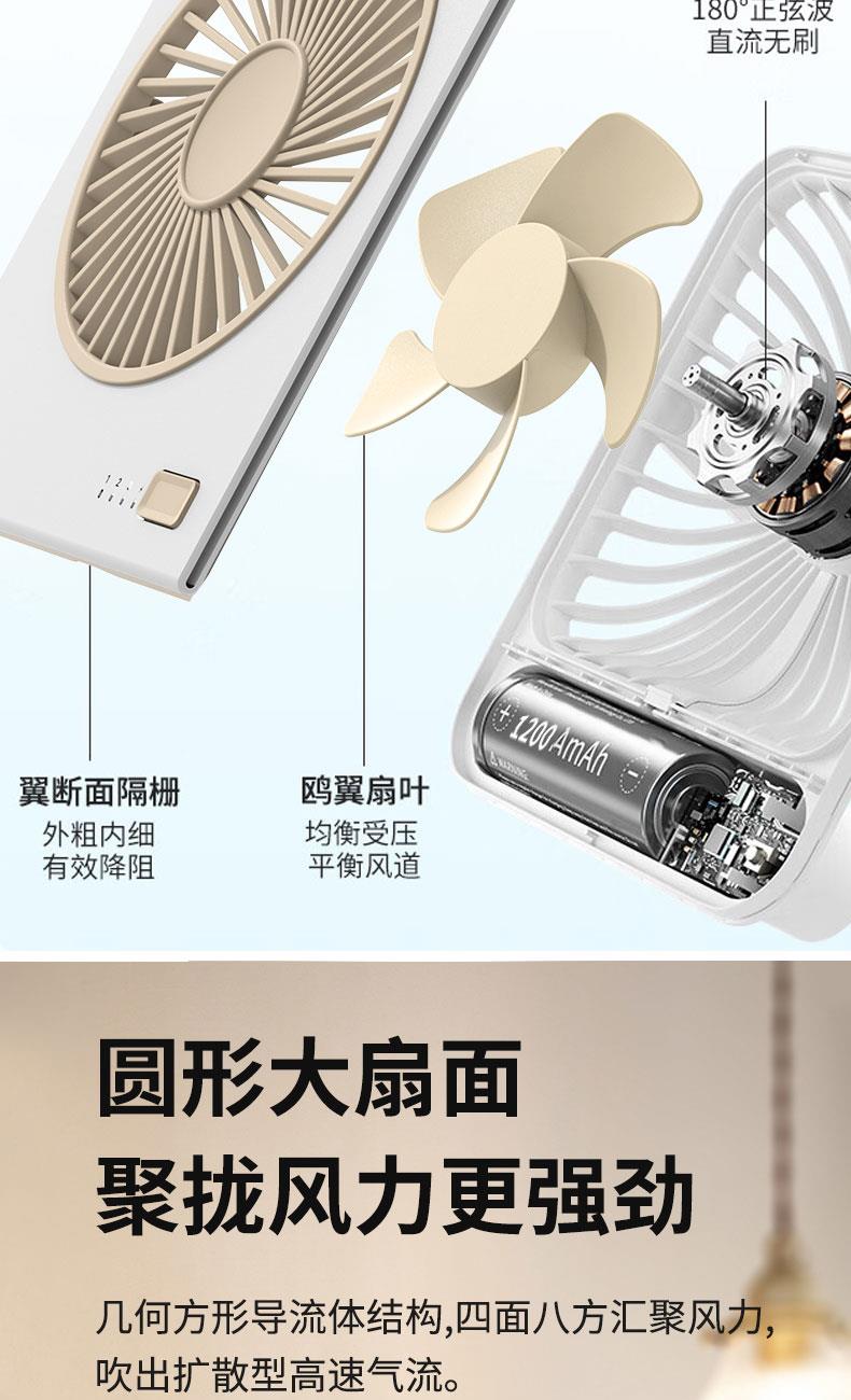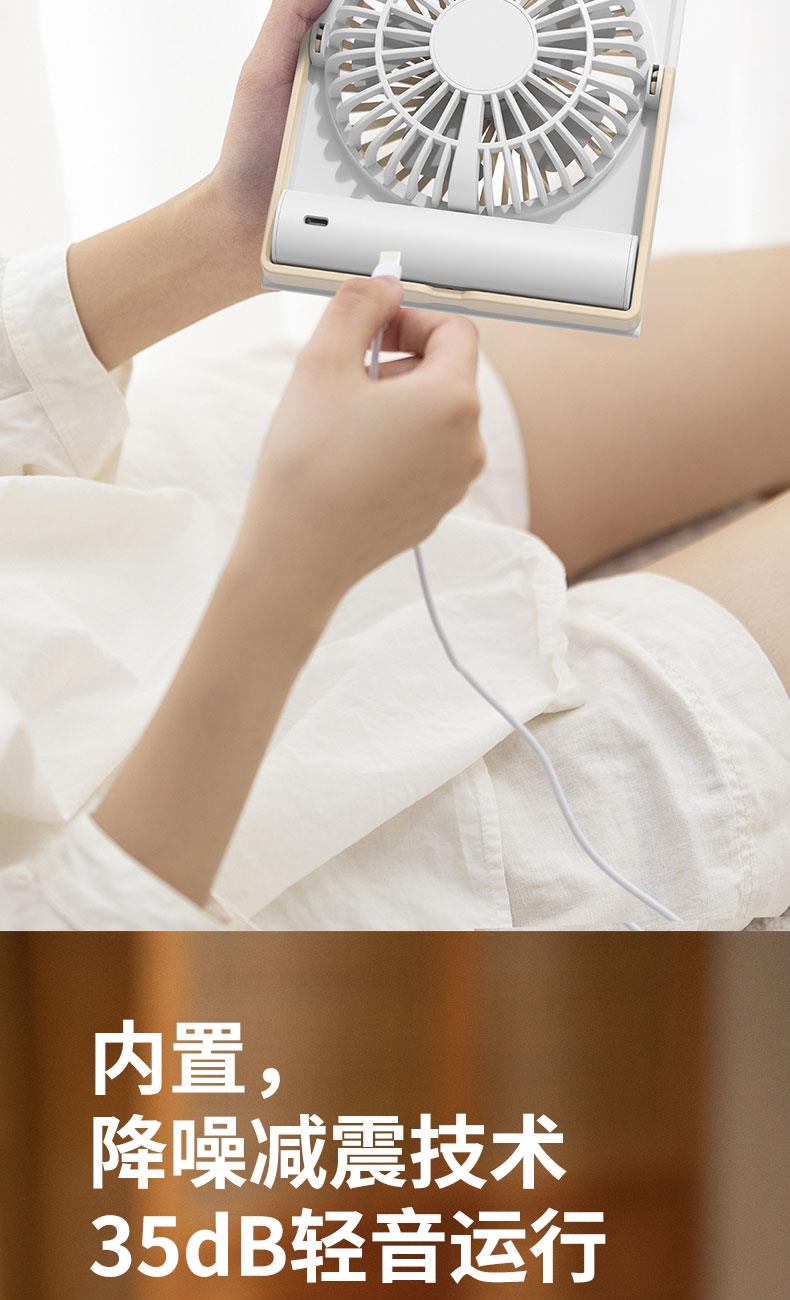 *角度可手动调节、时尚风格 *三档风力、电池1200毫安 *轻薄便携、可挂可立 *材质:ABS+电子元件 *产品尺寸:140*165*30.5mm *产品重量:242g/296g *包装盒:144**36*169mm *外箱尺寸:45*39.5*35cm *整箱重量:17.8kg/18.6kg *颜色:白色/灰紫色 *标配:风扇*1 usb电源线*1 说明书*1