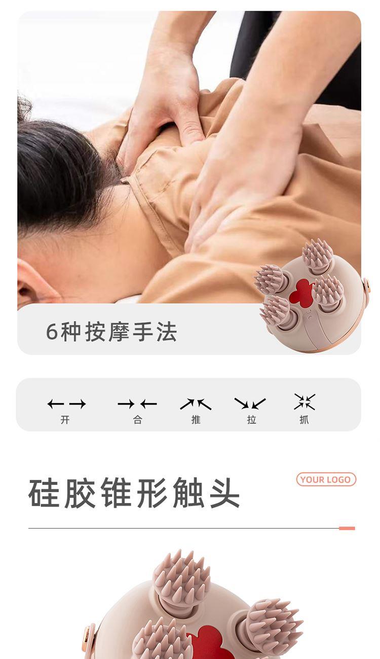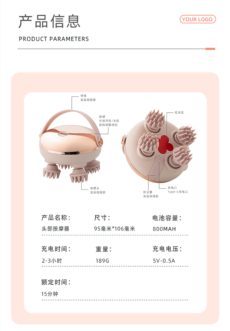 电池容量:900mAh 充电时间:2-3小时 续航时间:≈40分钟 额定电压:0.5A时5V 产品材质:ABS+硅胶 多效理疗 + 舒适体验:红光理疗搭配柔软硅胶触头,按摩时舒爽头皮,用完元气满满;支持开合、推拉、抓等 6 种按摩手法,模拟真人手感,放松更到位。 全场景便捷使用:IPX6 防水等级,干湿两用,洗澡时也能用;浅口离旋式设计,按摩时发丝不易缠绕;全身可用,除头部外,肩颈、手臂等部位也能享受按摩。 简单操作 + 长效续航:一键操作,老人小孩都会用;Type-C 充电接口,充电方便;无线便携设计,居家、出差都能携带;一次充电可长效续航,无需频繁充电。